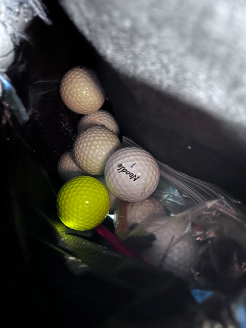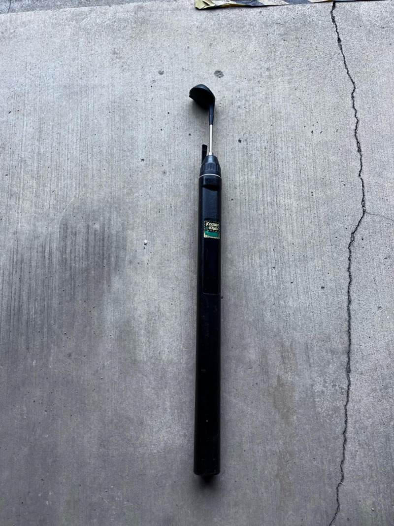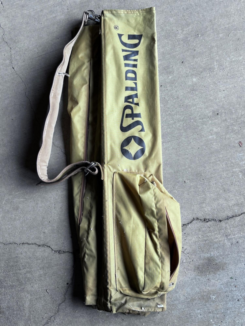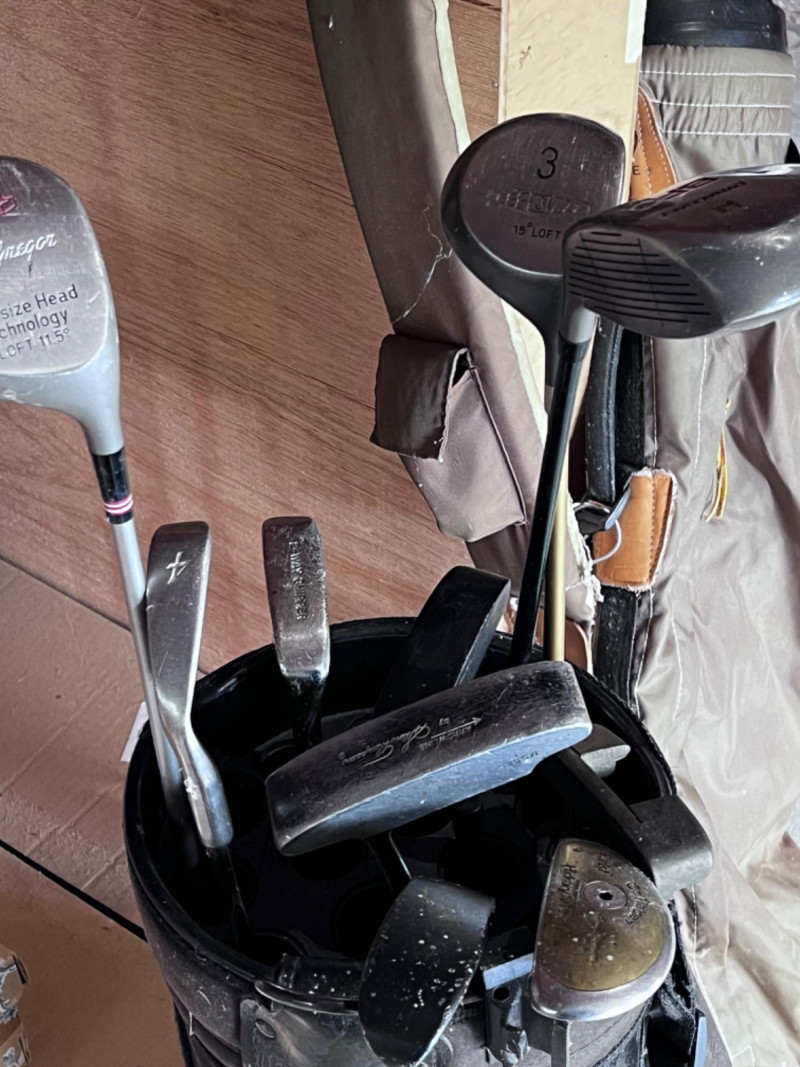 Various Golf Clubs, (3) Bags, Accessories, and Kooler Klub 1 Spalding golf bag 1 Active golf bag 1 Matrek bag Bags need cleaned 2 gold painted tees, 1 gold painted safety pin, and 1 gold painted ball marker 1 Tasco Range Finder 5x200mm fully coated optics 38ft/100yds 12.8m/100 1 green Tacoma Action Committee drawstring bag from 1986 16 golf balls and small baggie full of tees 1 Kooler Klub beverage dispenser 1 XL Tumwater Invitational windbreaker with visible wear