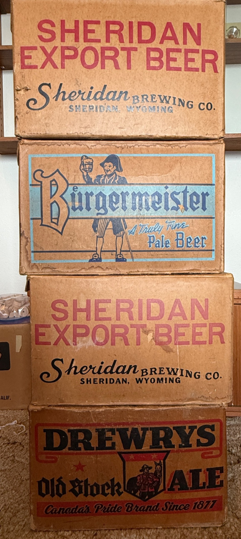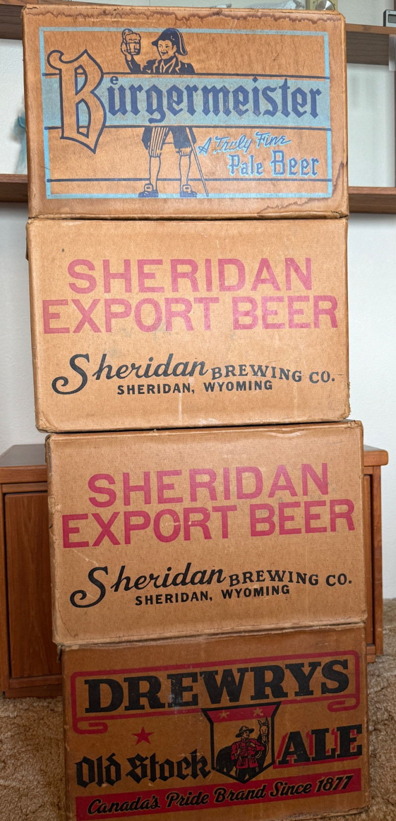 (4) Heavy Duty Vintage Beer Boxes Burgermeister Pale Beer 2 - Sheridan Export Beer Drewrys Old Stock Fronts and backs are clear. Sides and tops may have writing. See pics Each 16x12x10.5”