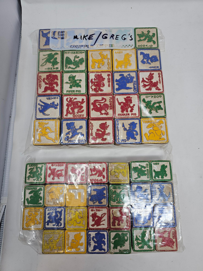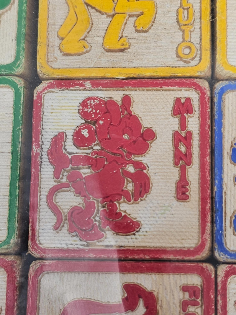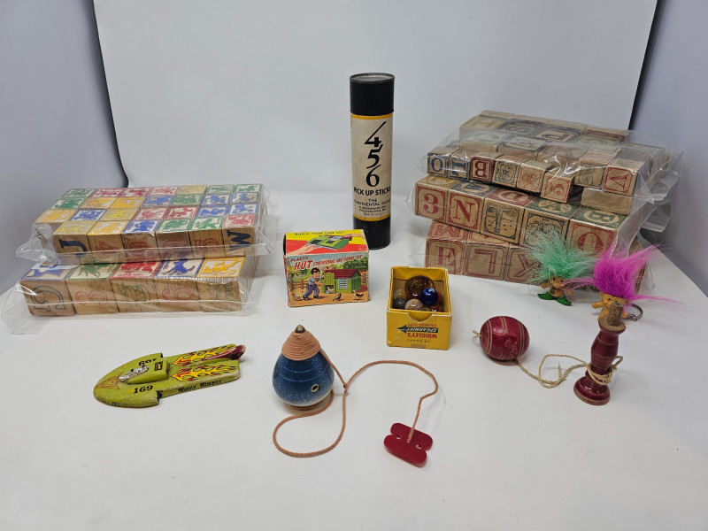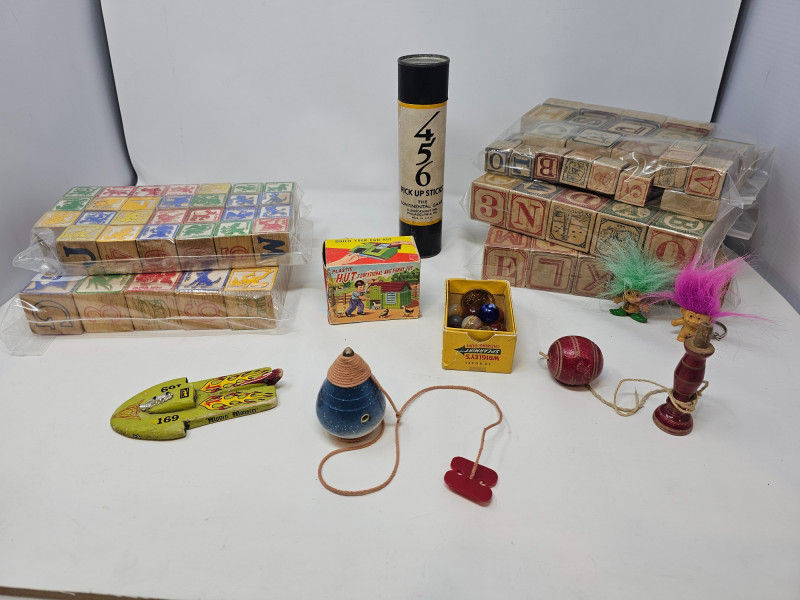 Vintage Children's Toys 1 set of smaller Disney character wooden blocks (27 blocks) 1 set of larger Disney character wooden blocks (25 blocks) 3 addituonal sets of wooden blocks (66 blocks) Set of "Pick Up Sticks" Small box of marbles Plastic Hut Educational And Funny Toy in original box 1 wooden top and more!
