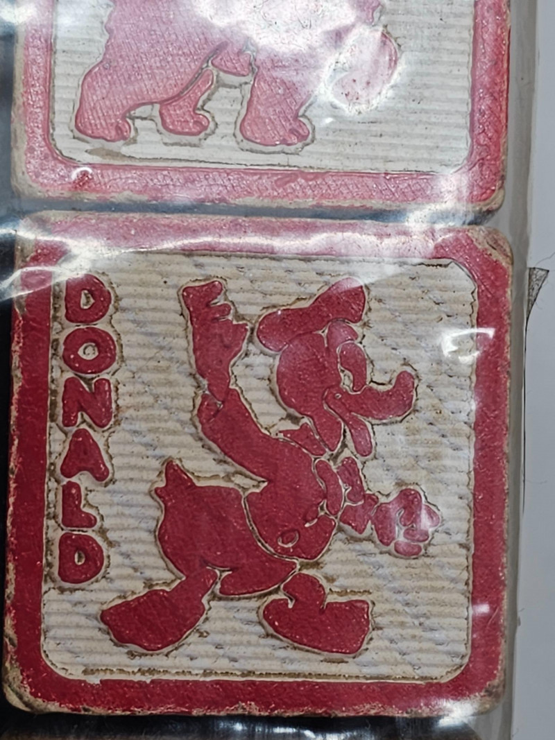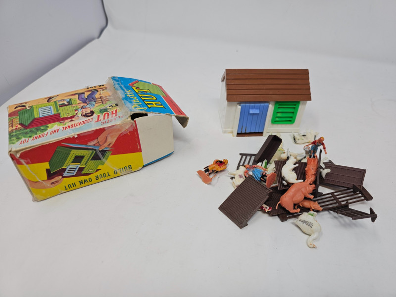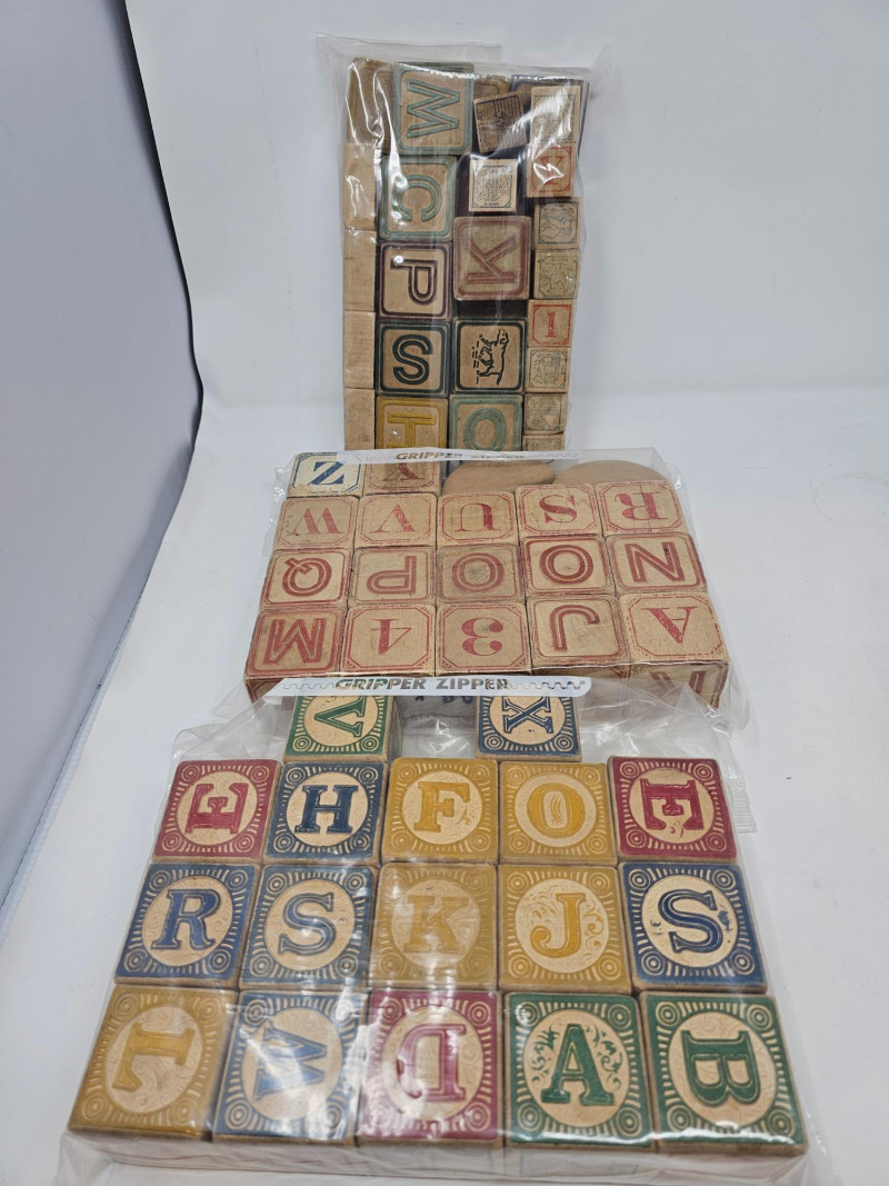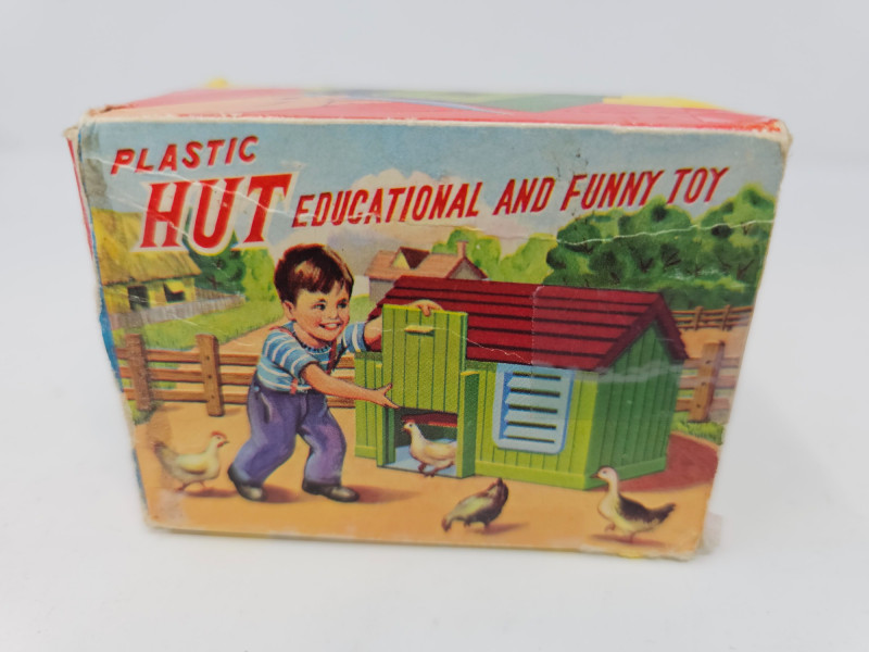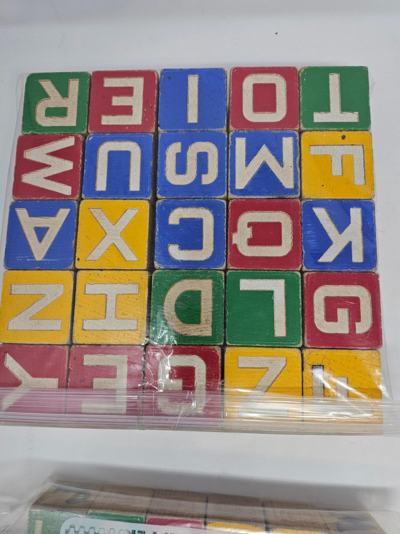 Vintage Children's Toys 1 set of smaller Disney character wooden blocks (27 blocks) 1 set of larger Disney character wooden blocks (25 blocks) 3 addituonal sets of wooden blocks (66 blocks) Set of "Pick Up Sticks" Small box of marbles Plastic Hut Educational And Funny Toy in original box 1 wooden top and more!