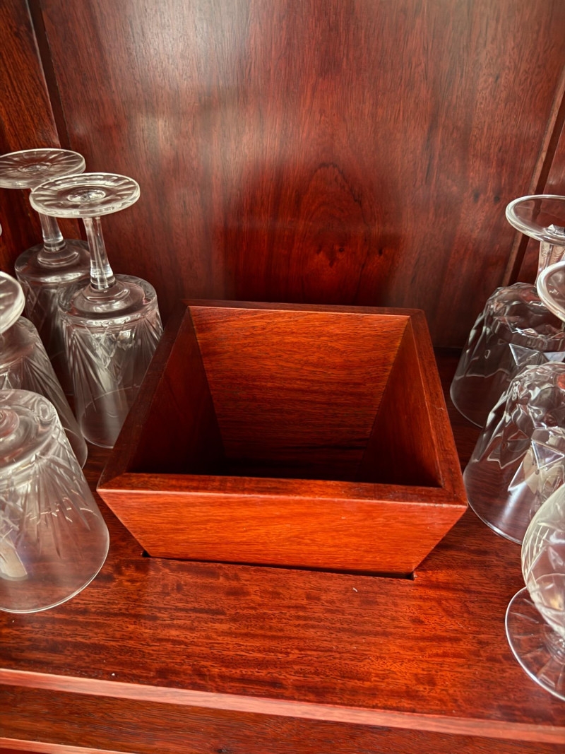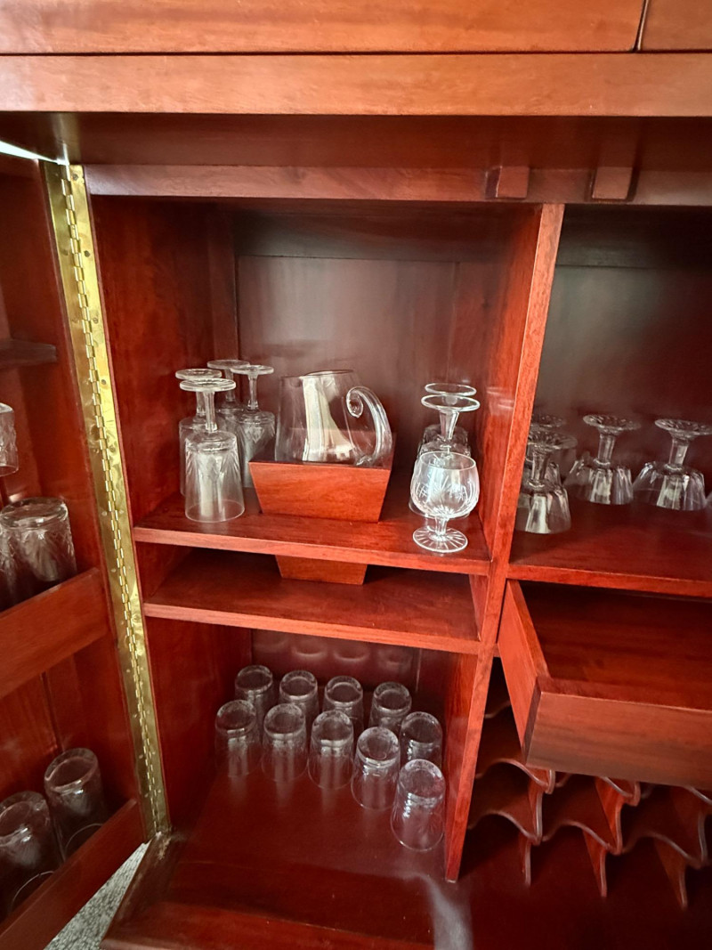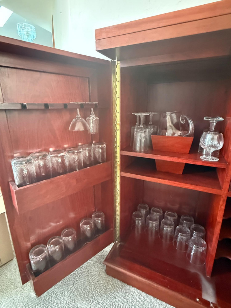 Rosewood Expanding Top Bar Cabinet is 36 x 18 x 41 With removable ice bucket and complete set of glasses and stemware. Each side of the top flips out for expanded bar display space.