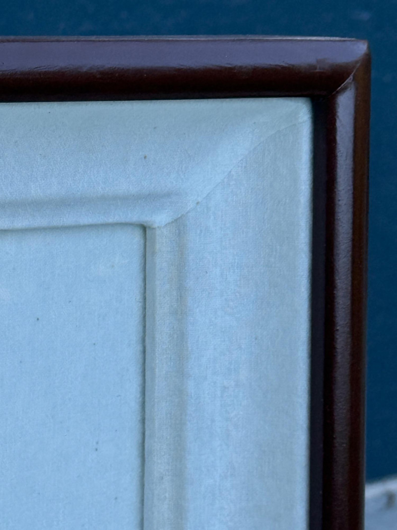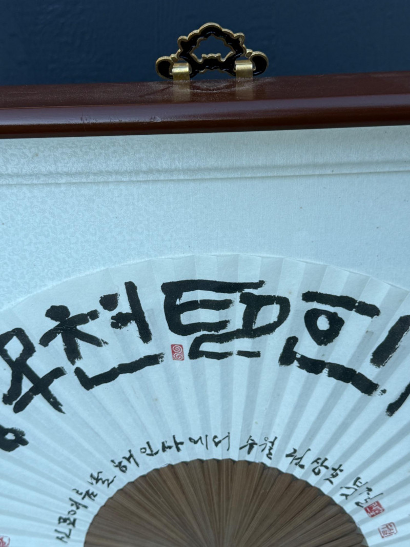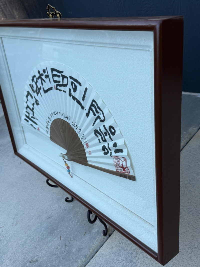 “End The Korean War” Korean Calligraphy Fan in rosewood box frame and hanging hardware, with ivory silk over wood interior back ground.