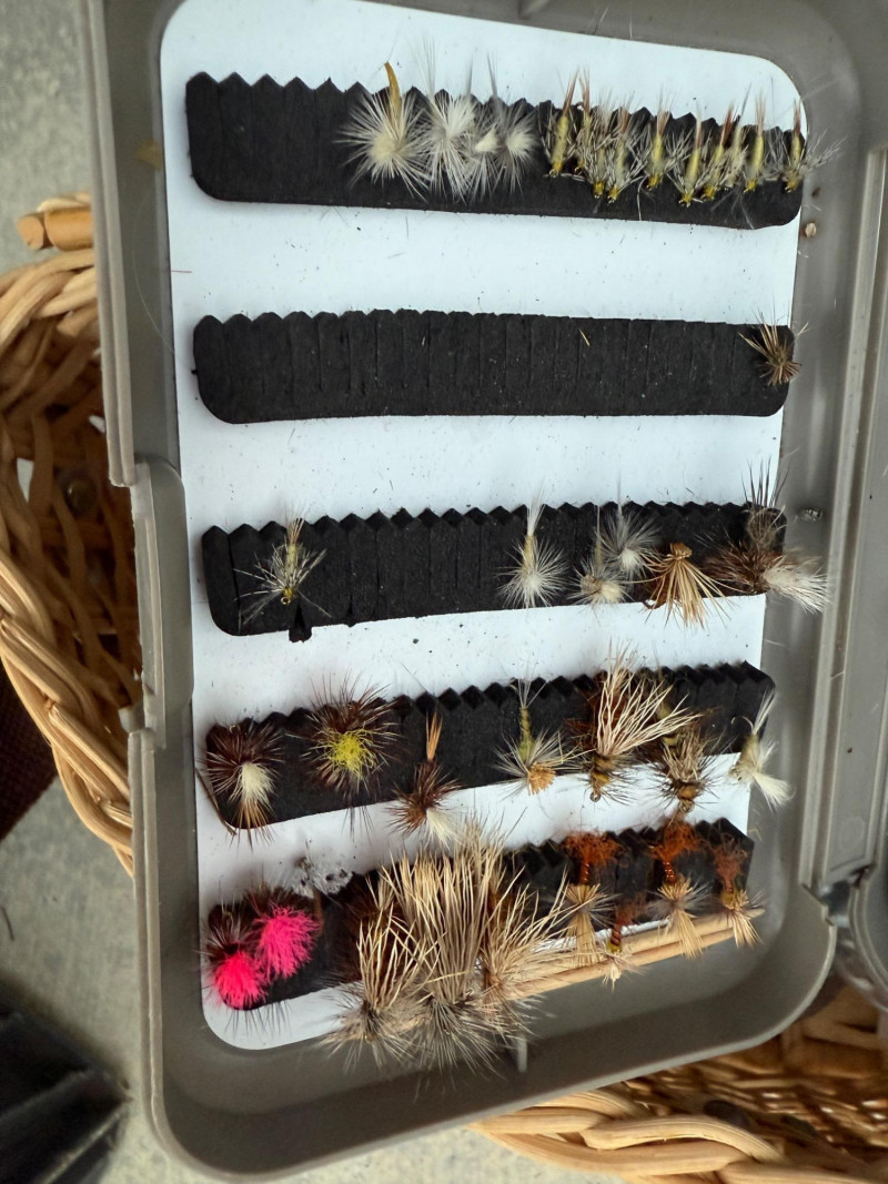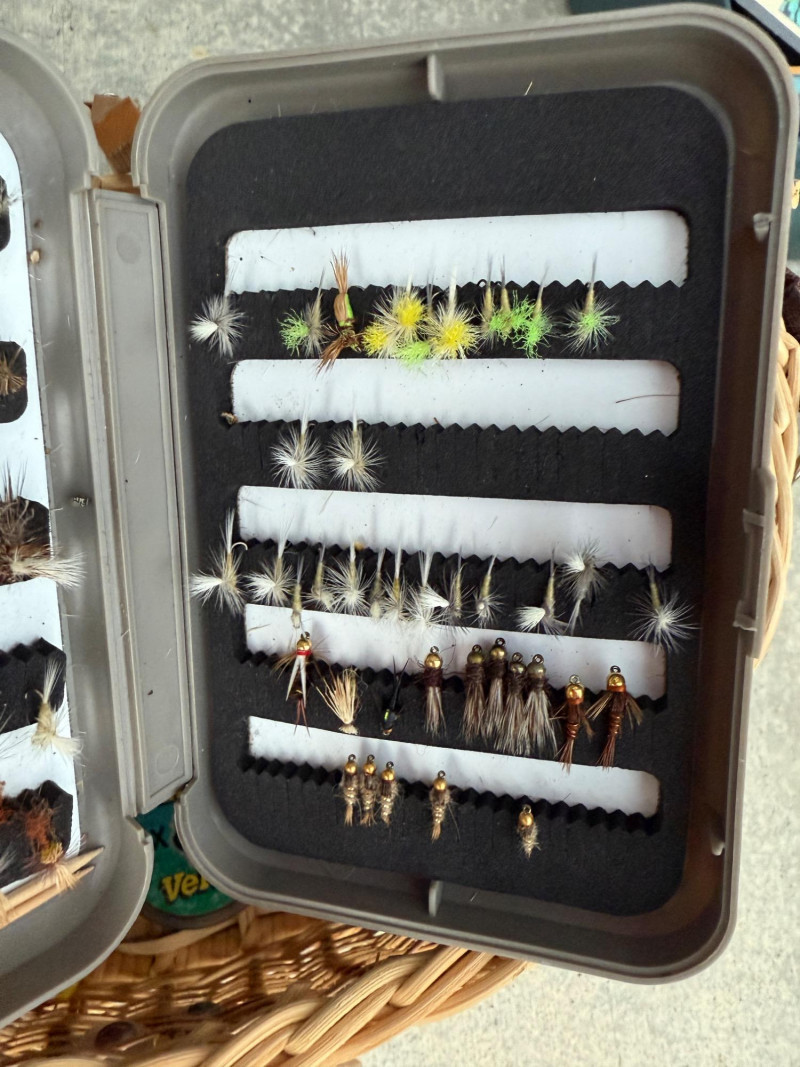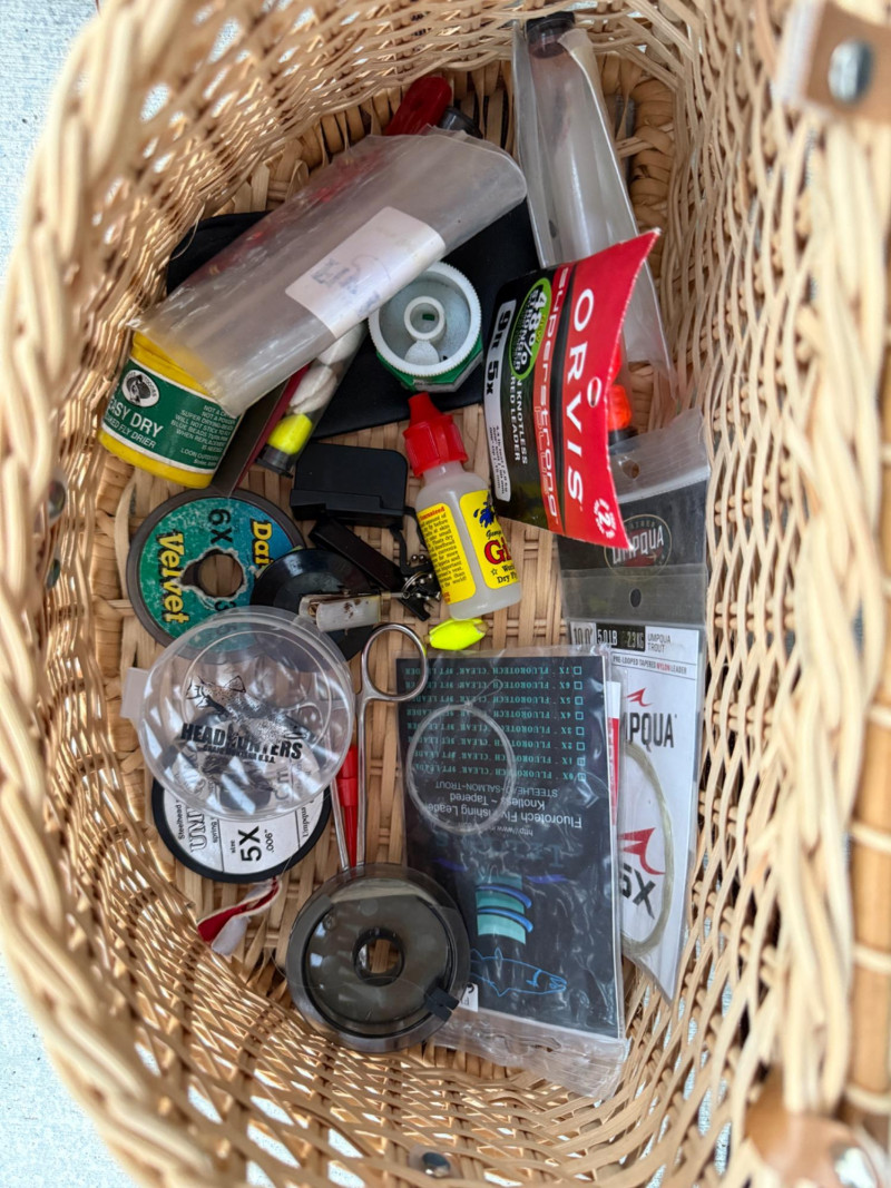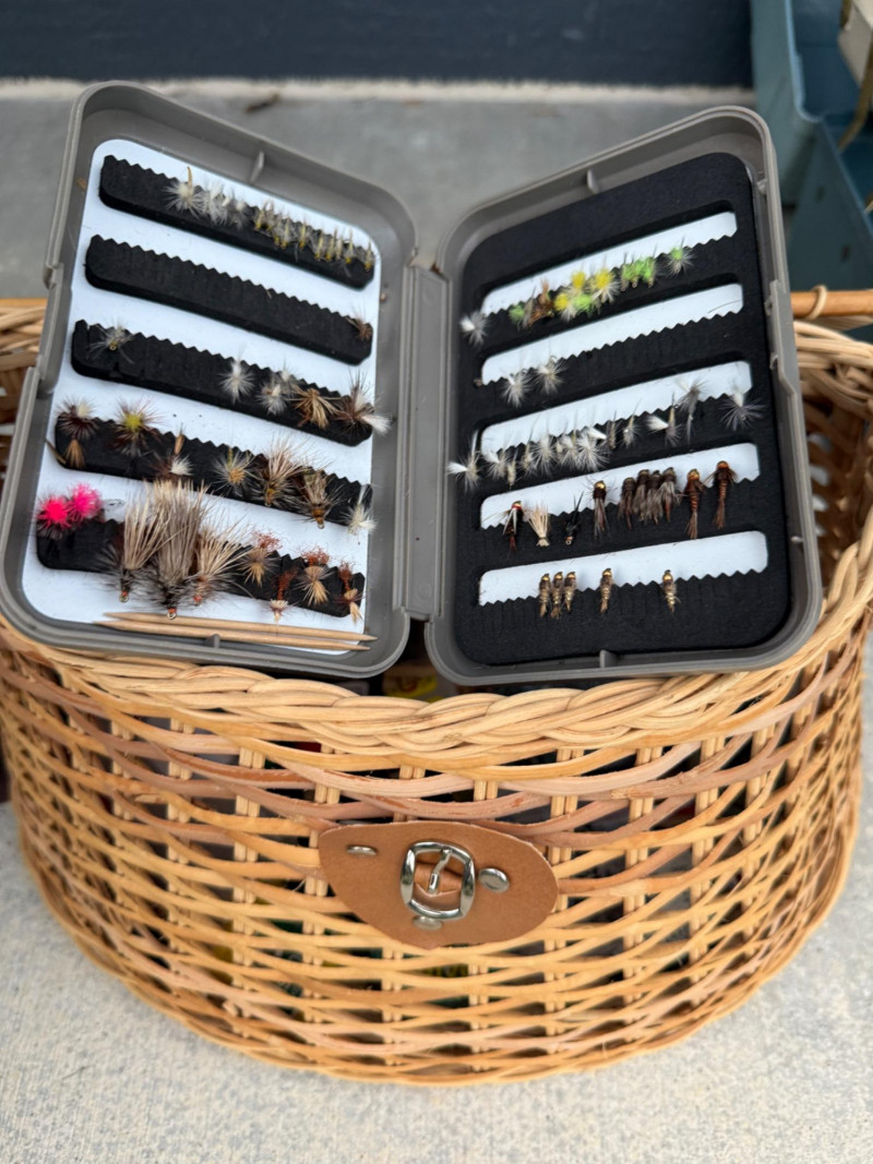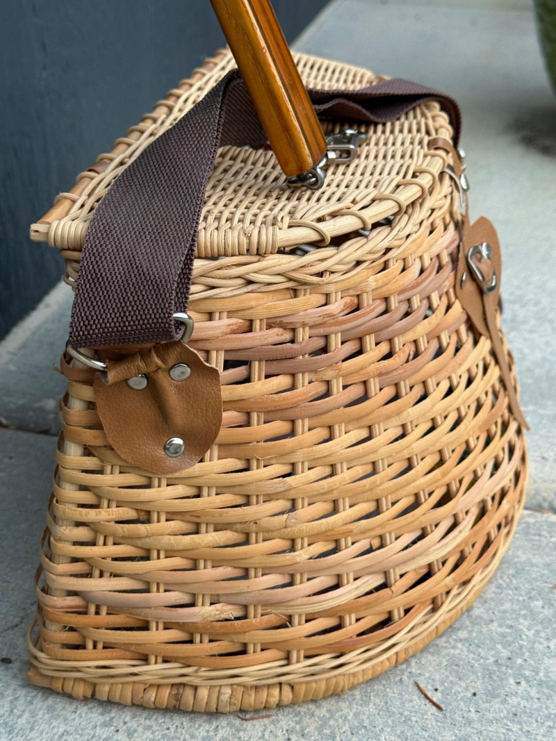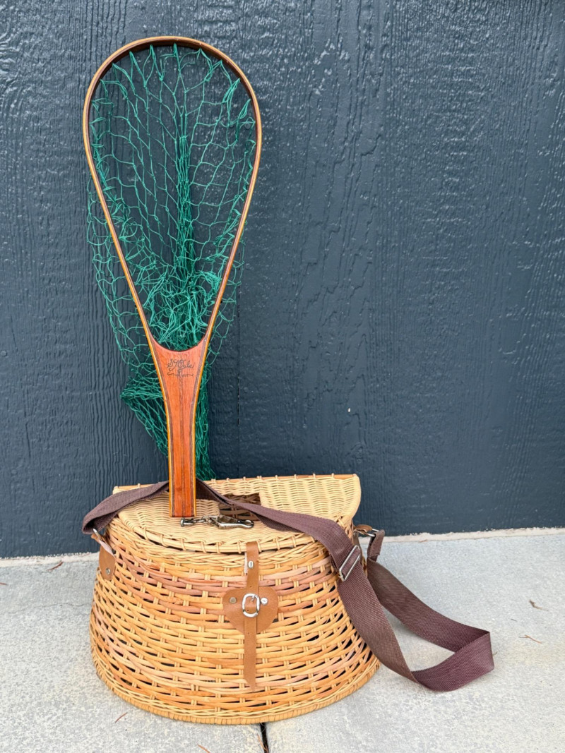 20.75x7.5x.5” hand made fish net signed S.G. Ogle 1985 14x8x8” decorative wicker creel with fly fishing necessities.