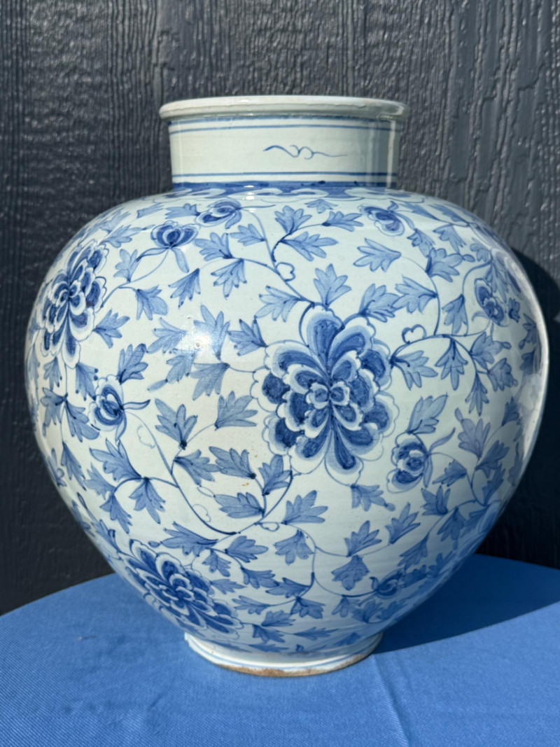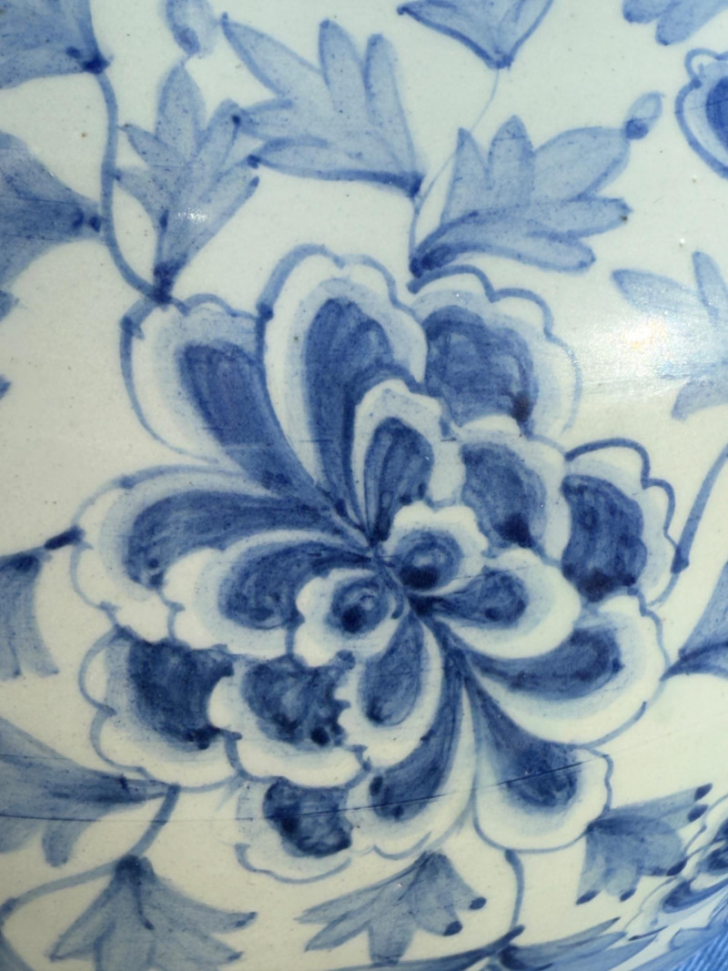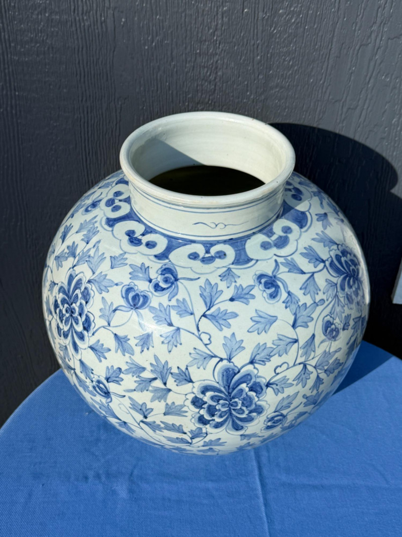 Blue and White Chinese Floor Vase or Centerpiece. 14.5” diameter and 16” tall.