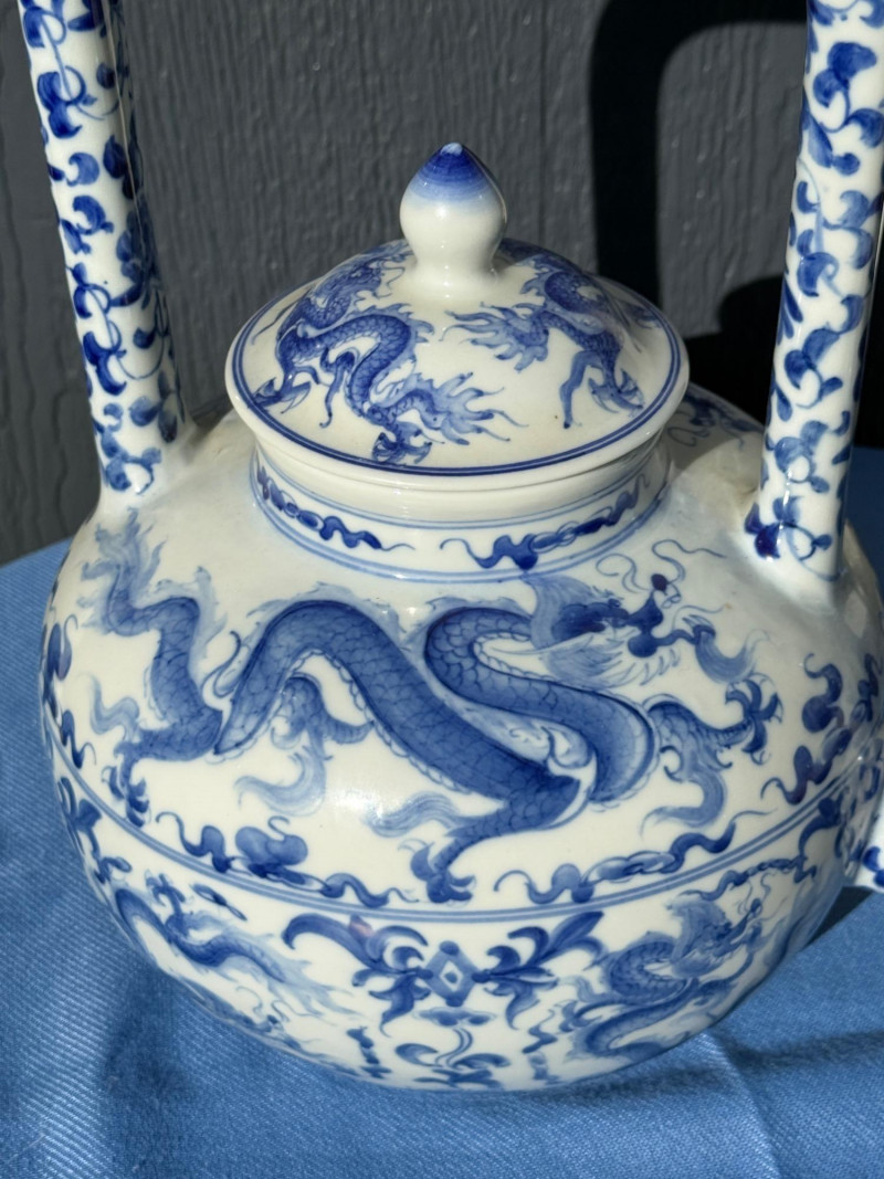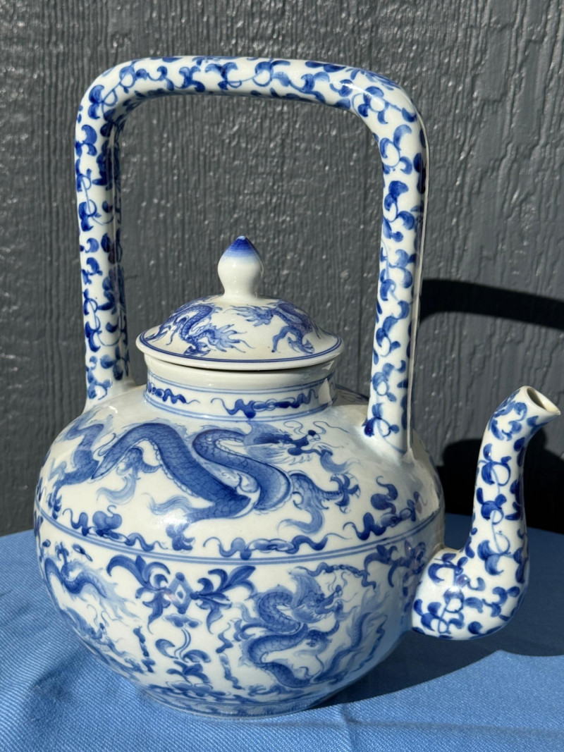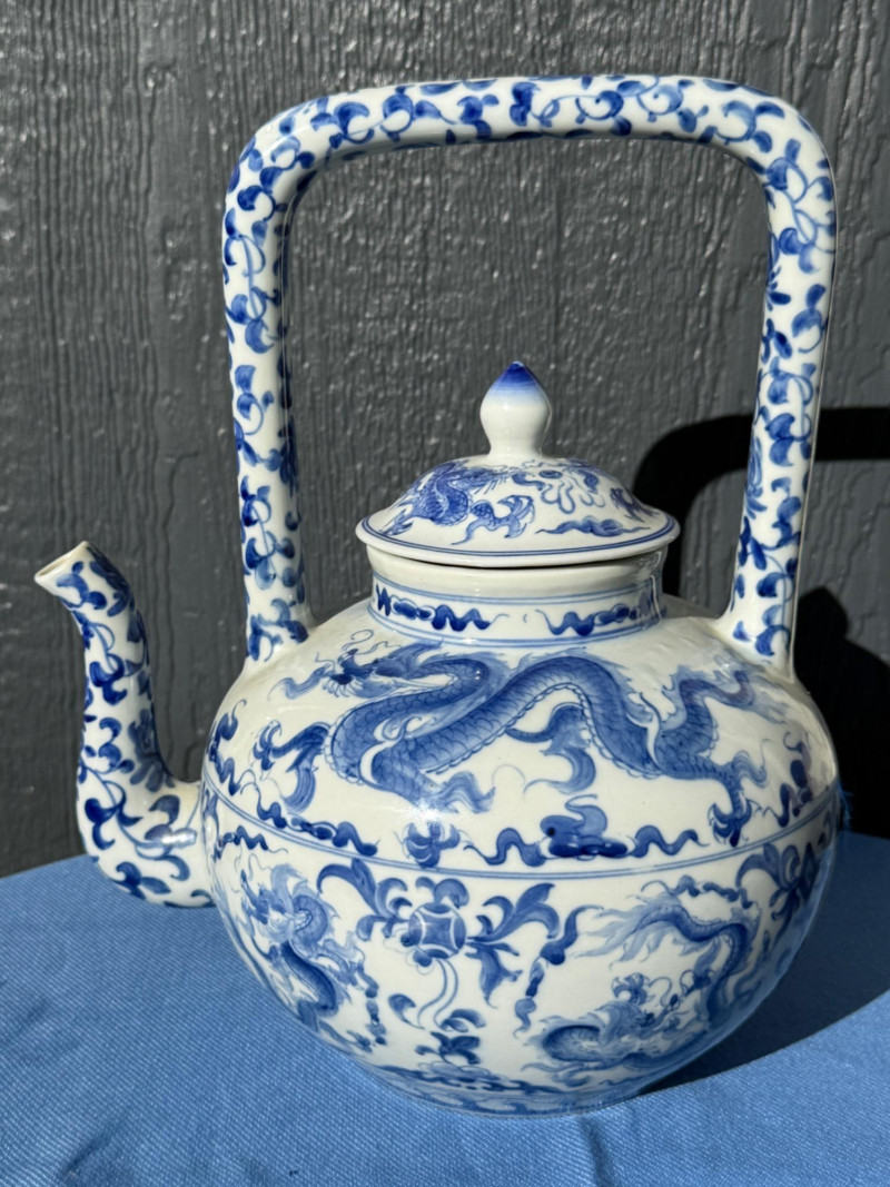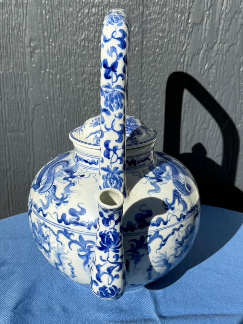 Chinese Blue & White Oversized Porcelain Tea Pot with dragon and floral design 11x9x13”