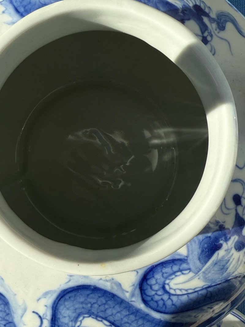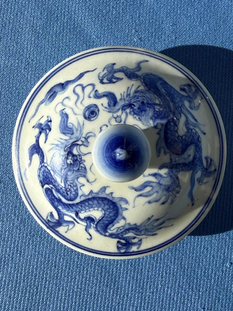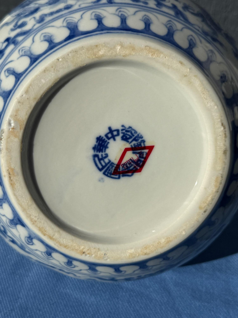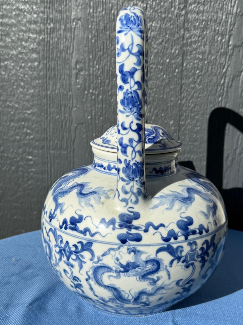 Chinese Blue & White Oversized Porcelain Tea Pot with dragon and floral design 11x9x13”