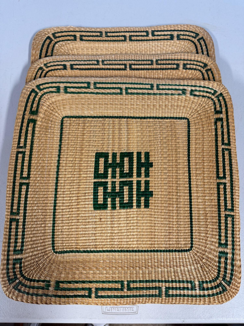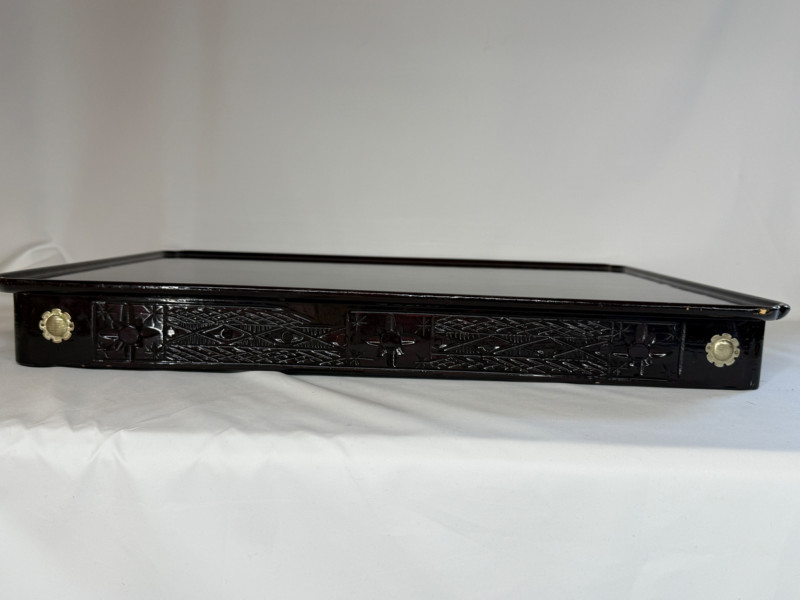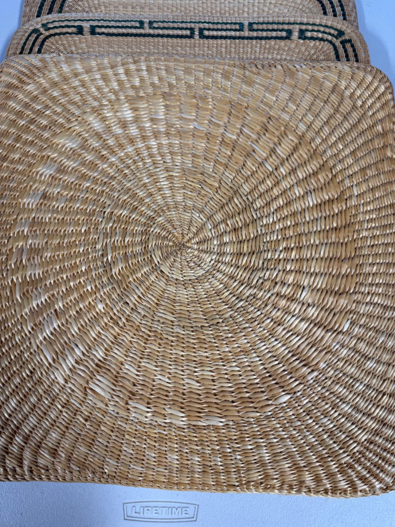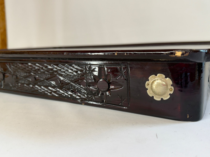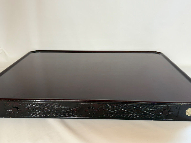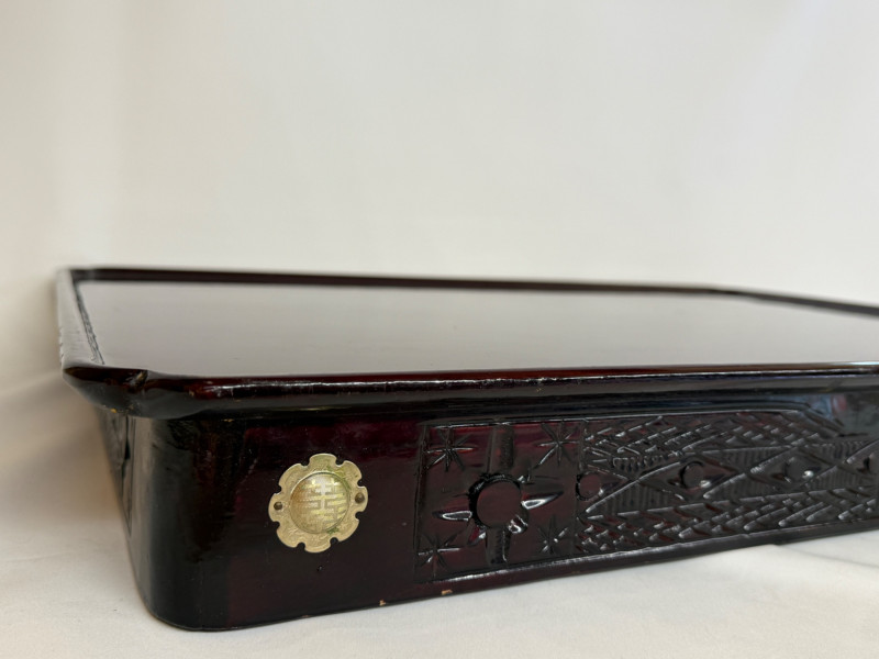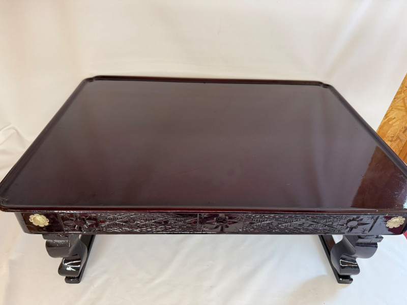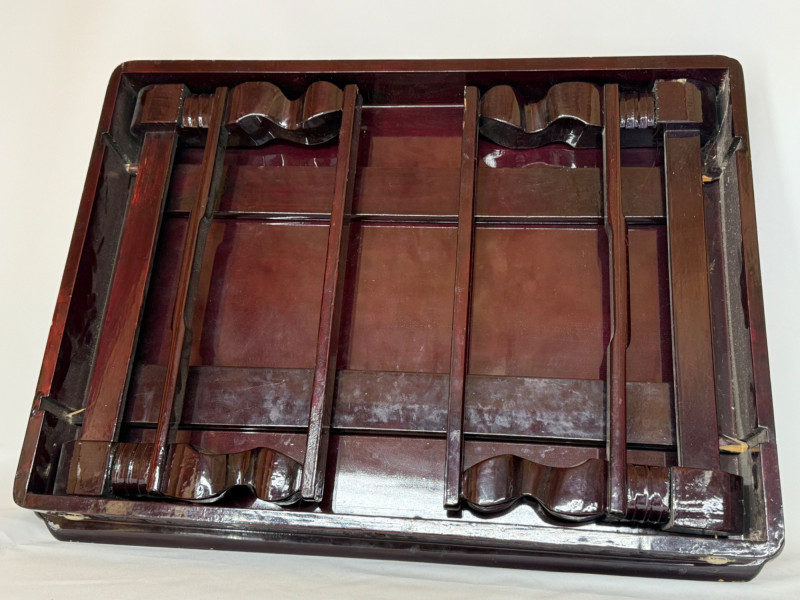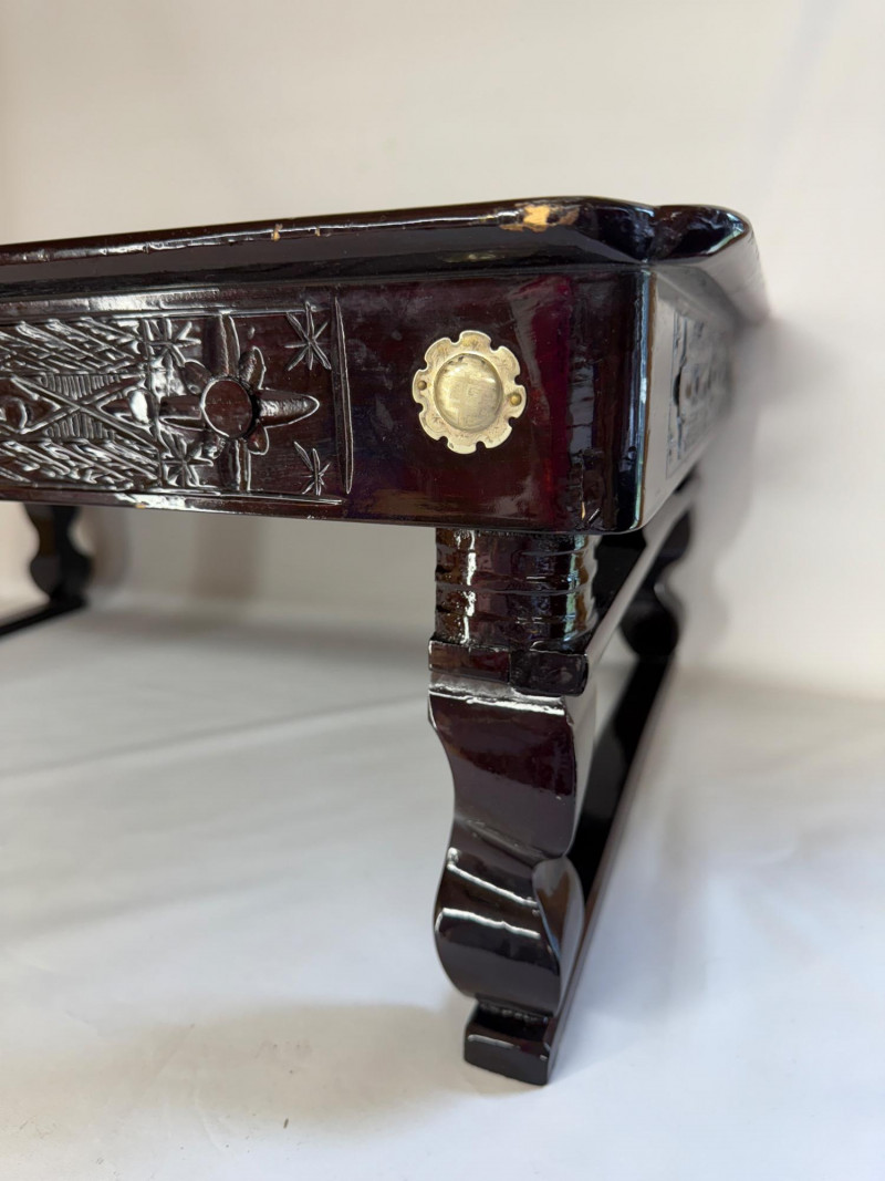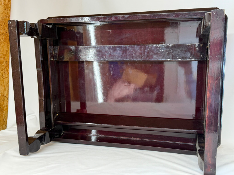 Vintage Chinese Lacquer Rosewood Folding Low Table 27.5x2”x10.75” with folding legs. Some surface and edge wear. 3 Woven grass cushioned floor mats.