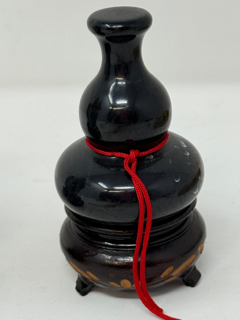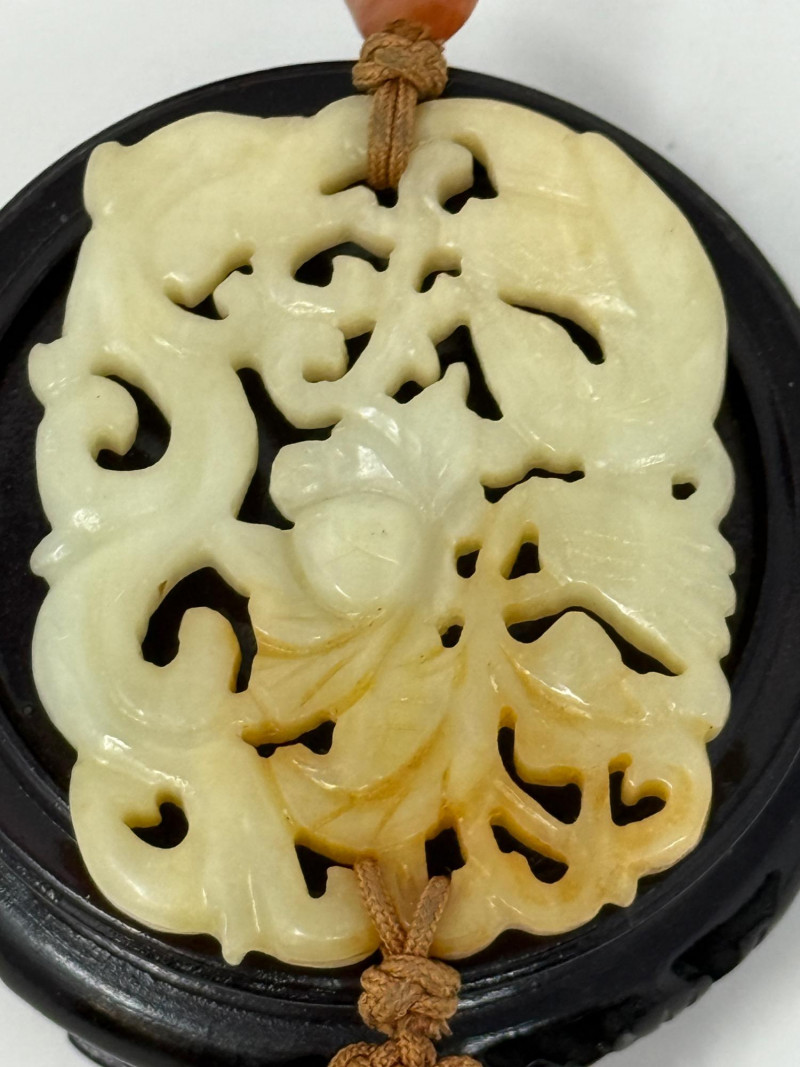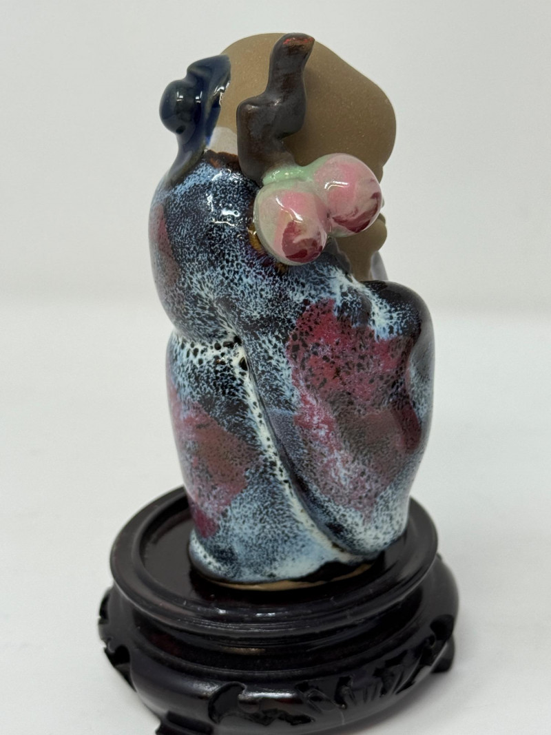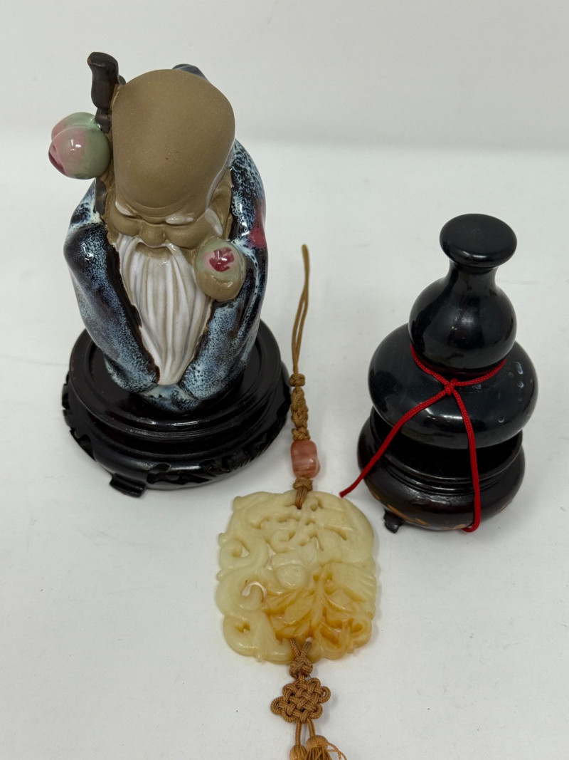 Chinese Carved Jade Amulet & Shiwan Mud Man Pottery & Marble Decor With 2 wood bases.