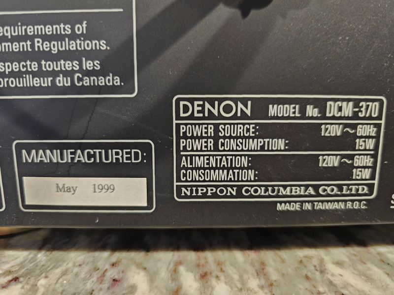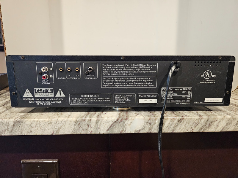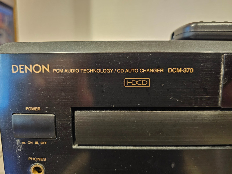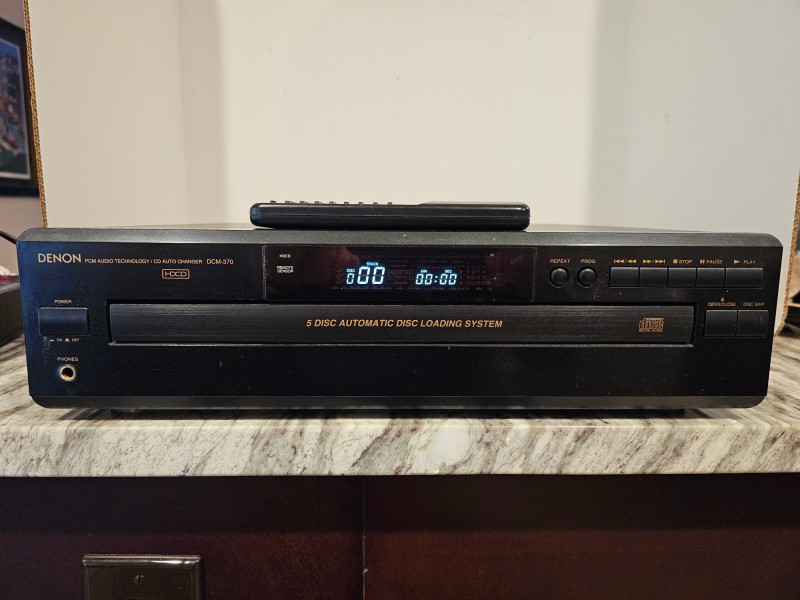 Denon DCM-370 5 Disc CD Auto Changer Manufactured May 1999 The Denon DCM-370 is a multi-disc carousel CD changer known for its HDCD decoding and advanced digital-to-analog conversion Removed from a working home theater system Includes remote RC-258 Tested - Power On! 4"T x 17"W x 15"D