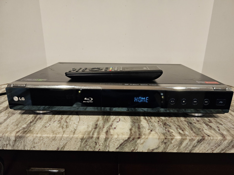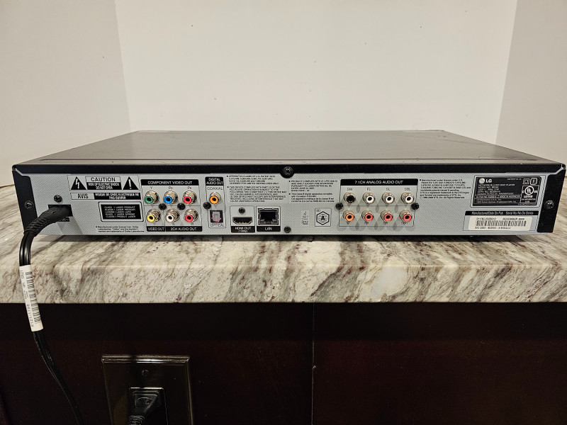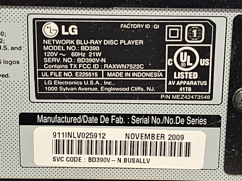 LG BD390 Network Blu-Ray Disc Player Manufactured November 2009 Features 1080p Blu-ray playback, wireless connectivity, 7.1 Channel Audio and access to streaming services like Netflix and YouTube Includes remote & power cable Tested - Powers On! 2.5"T x 17"W x 11"D