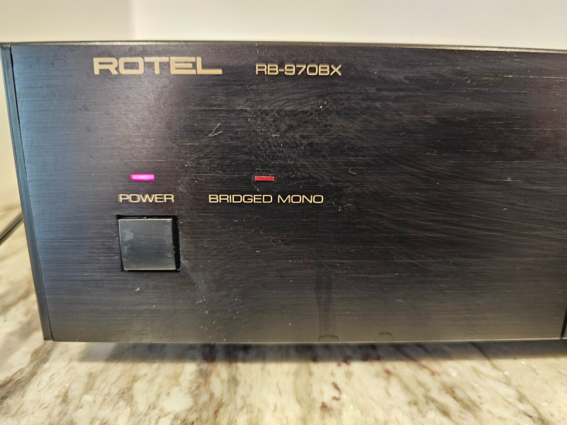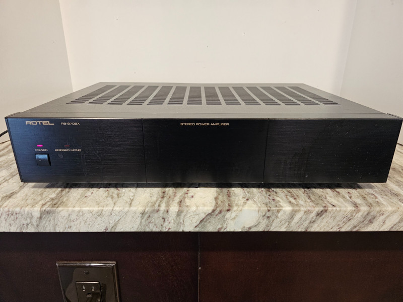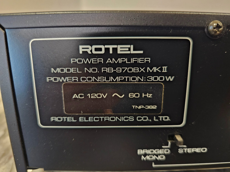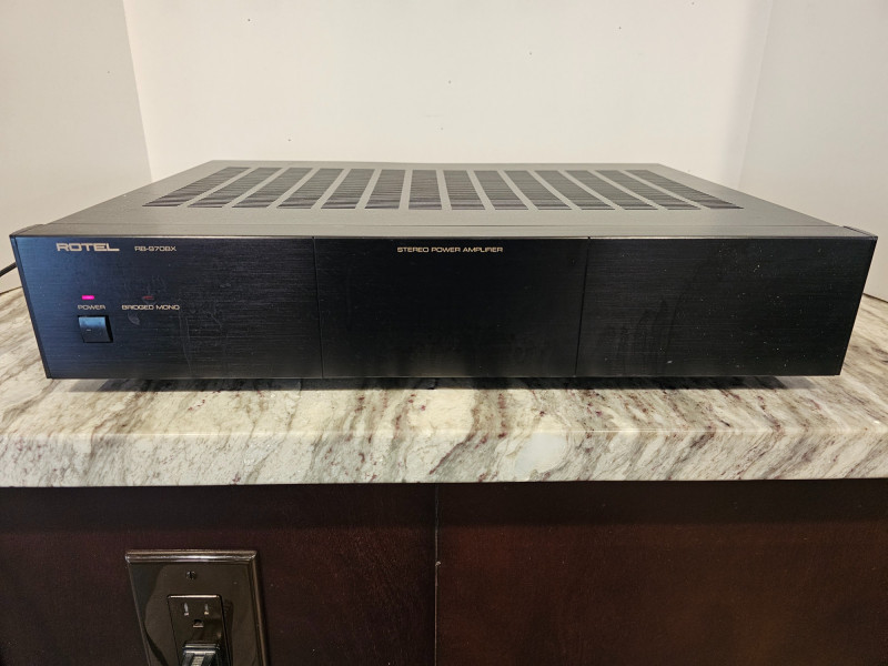 Rotel RB-970BX Stereo Power Amplifier Manufactured 1995-1997 The Rotel RB-970BX is a classic stereo power amplifier known for its robust construction and high-current design. It delivers 60 watts per channel in stereo and can be bridged to produce 180 watts in mono. Removed from a working home theater system Includes power cable Tested - Powers On! 3.5"T x 17"W x 12"D