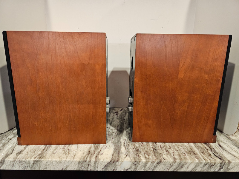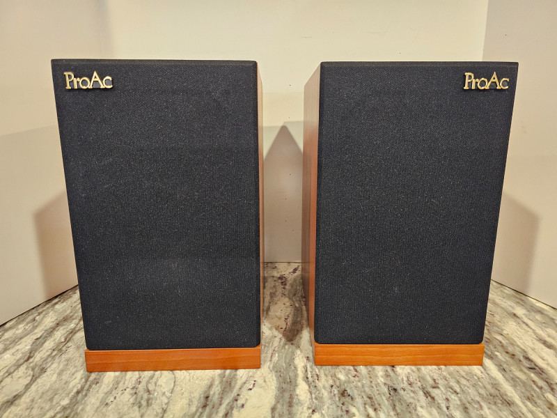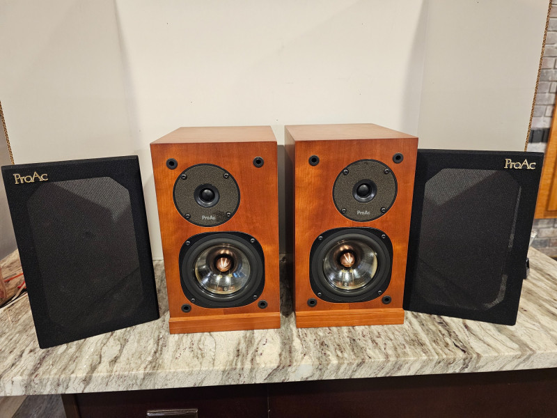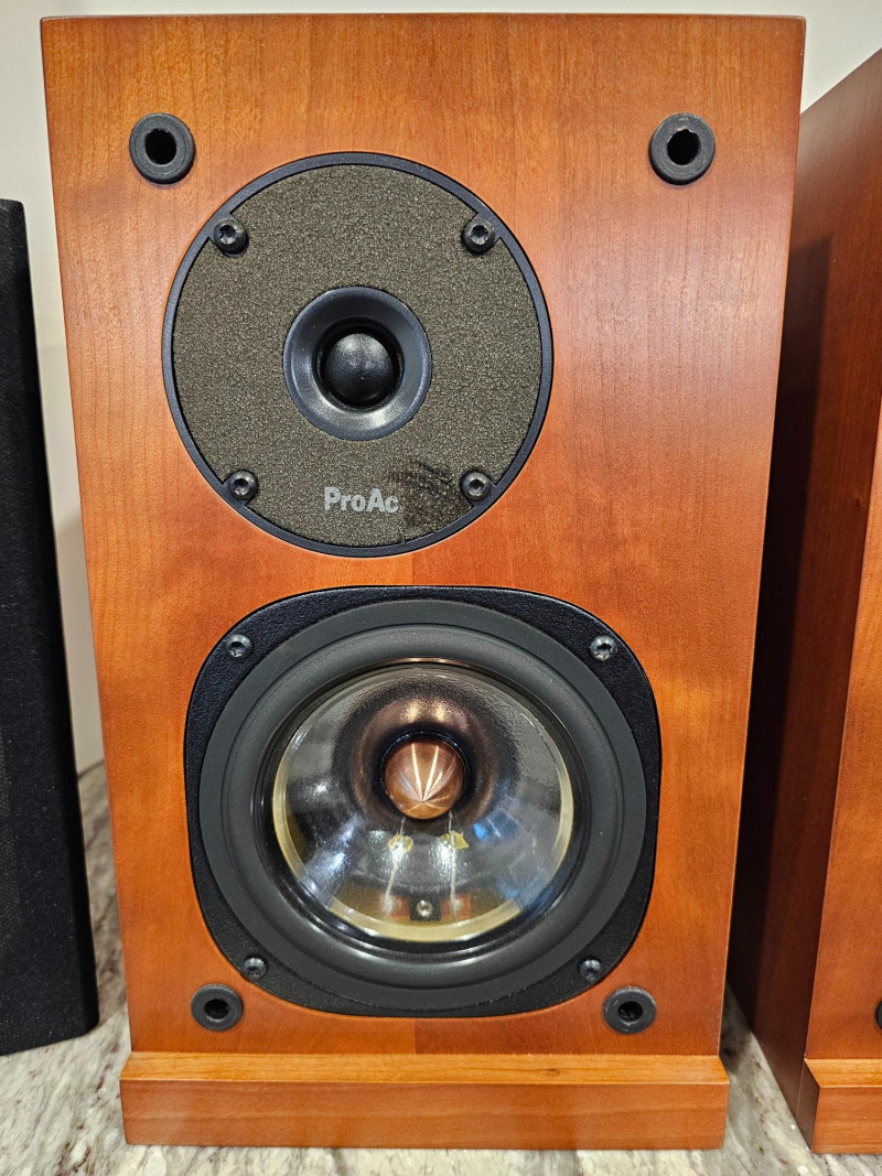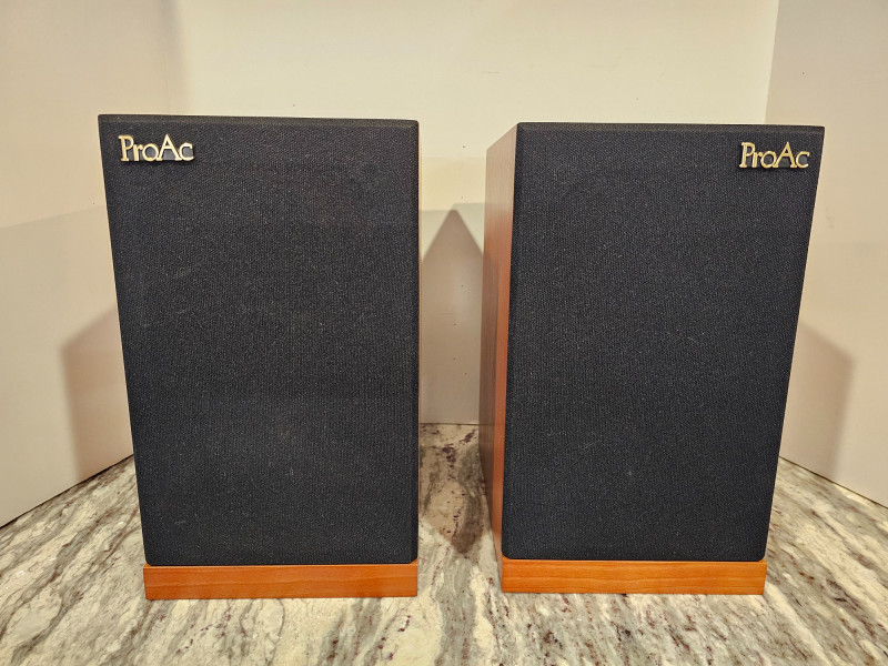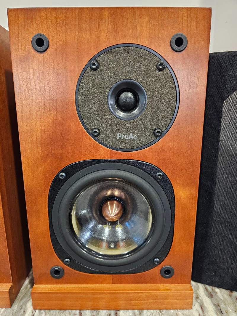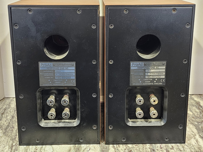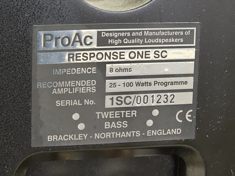 Pair Of ProAC Response One SC Minimonitor Loudspeakers The ProAc Response One SC is a two-way, reflex-loaded, stand-mounted minimonitor loudspeaker, released as a "radical refinement" of the earlier Response One S model. It is known for its excellent midrange and spacious soundstage. Specifications for the ProAc Response One SC: Driver units: Tweeter: 0.75-inch cloth dome with a honeycomb-wound voice-coil and ferrofluid-cooled assembly. Woofer: 5-inch polypropylene cone with a special transparent cone, copper magnet assembly, and a phase plug. Crossover frequency: The tweeter and woofer integrate with a high-quality crossover network. Frequency response: 38Hz–30kHz Impedance: 8 ohms nominal. Sensitivity: 86dB for 1 watt at 1 meter. Recommended amplification: 20–100 watts. This high-end set of speakers was originally priced at around $2,000 per pair in the late 1990s Wood-grain cabinets Removed from a working home theater system Includes pair of 8' 12 guage speaker wires with gold connection posts 12" x 7" x 9.25" & 18 lbs per speaker