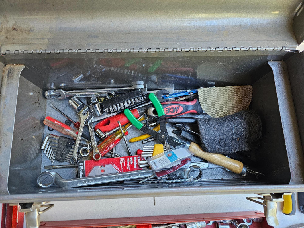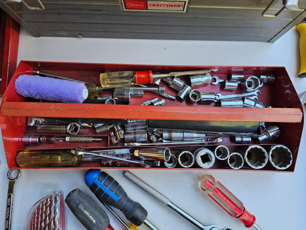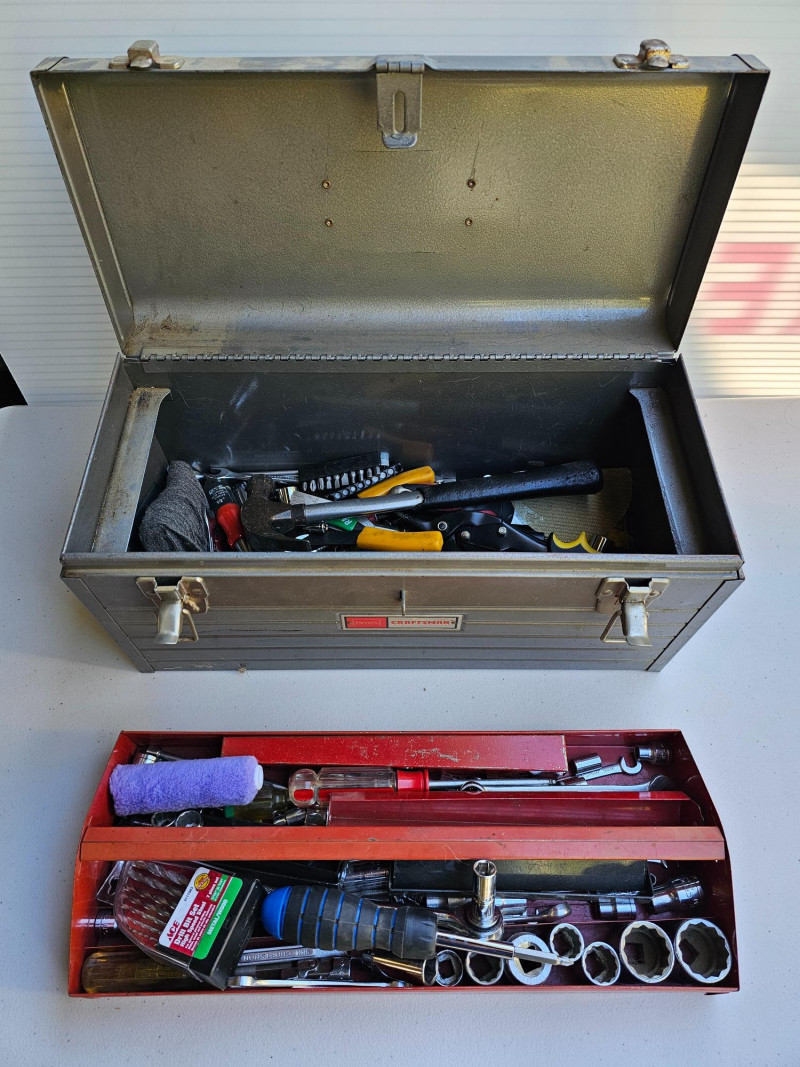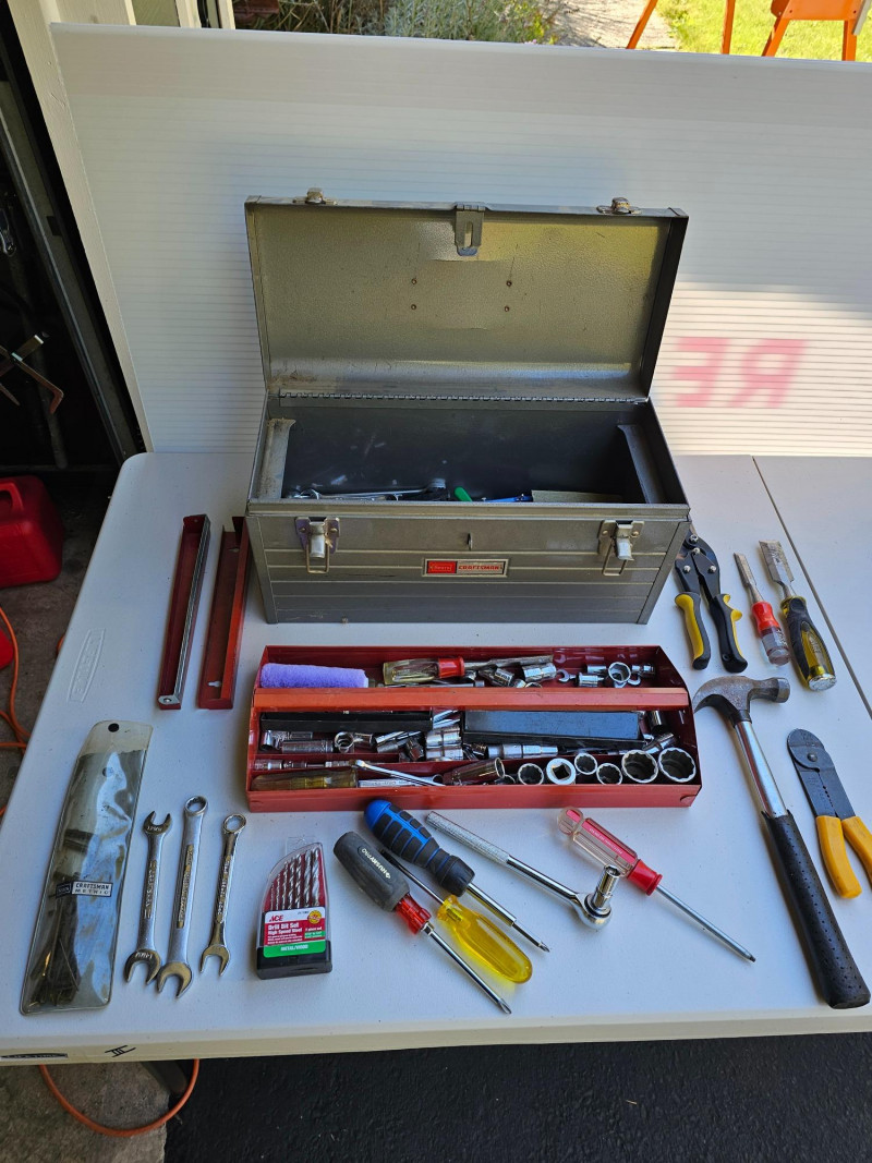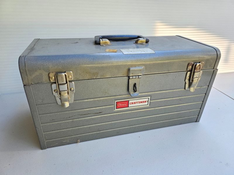 Craftsman Metal Tool Box Full Of Tools Craftsman tool box with removable metal tool tray full of hand tools Hammer, screwdrivers, ratchet & sockets, wrenches and more! 9"T x 18"W x 8"D