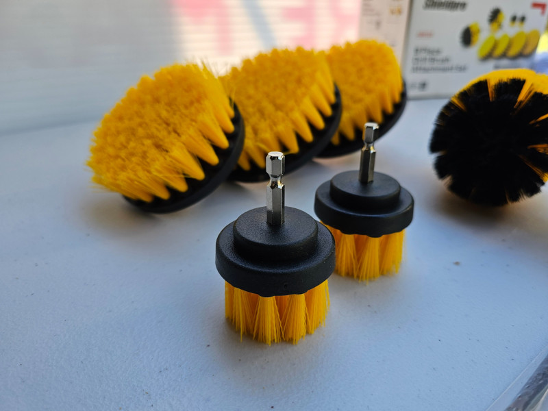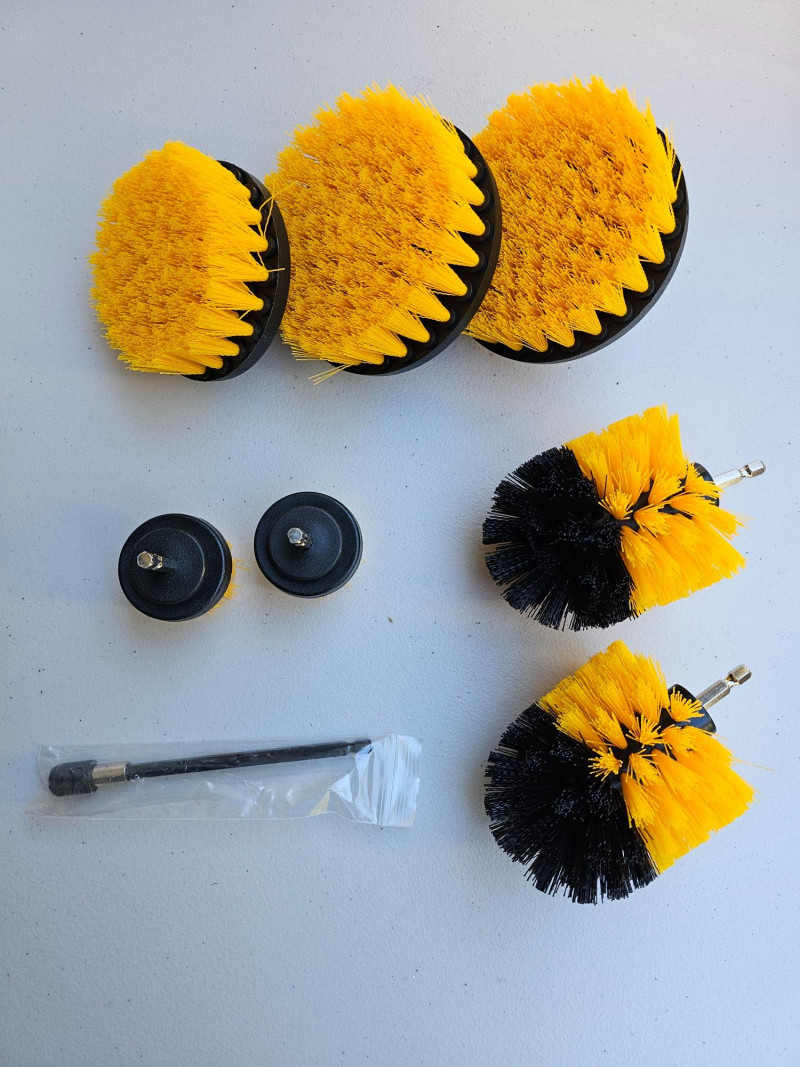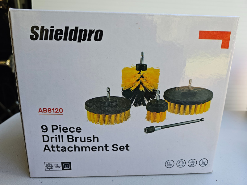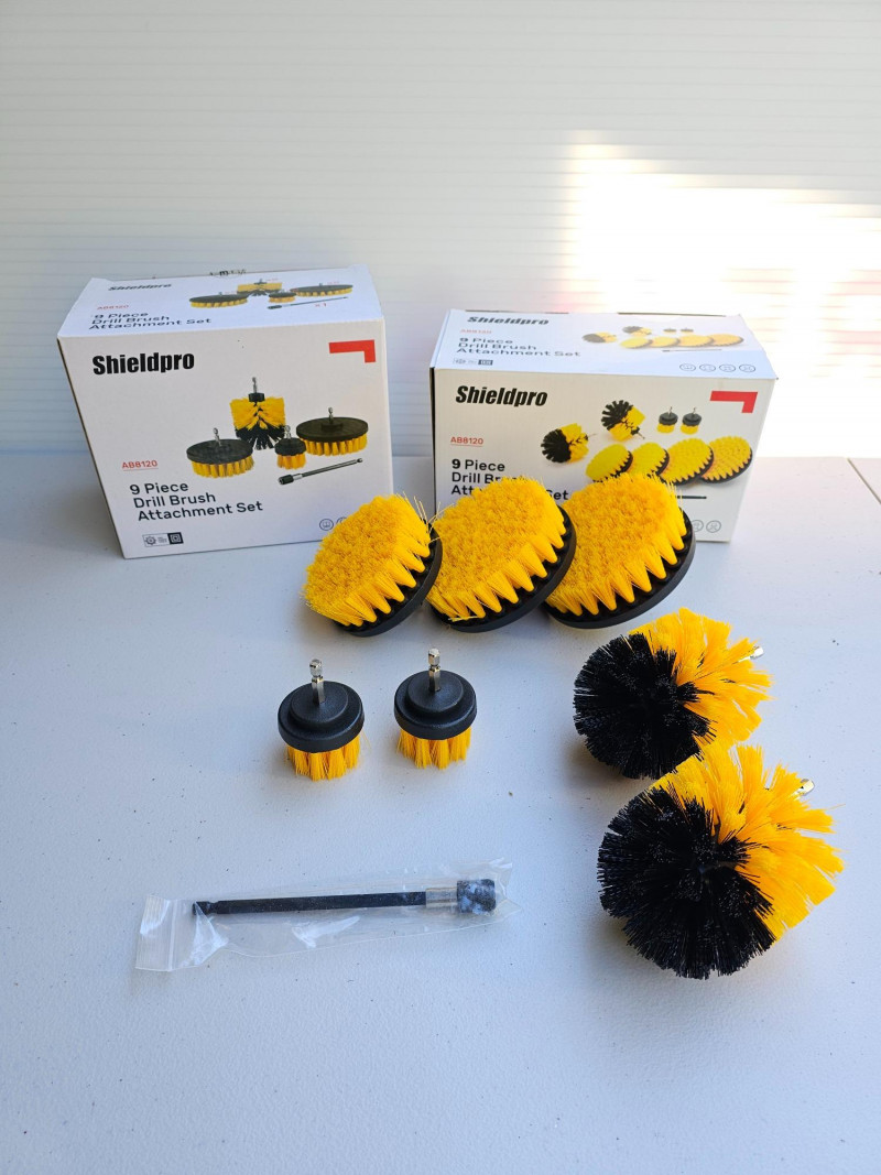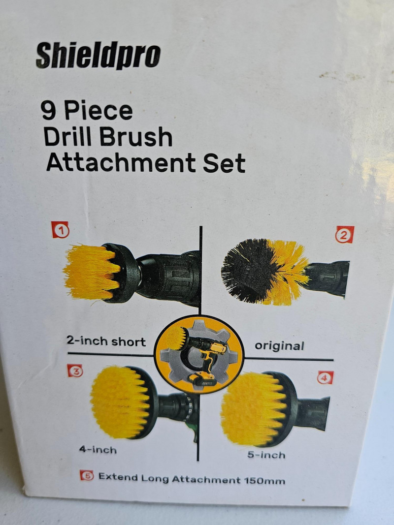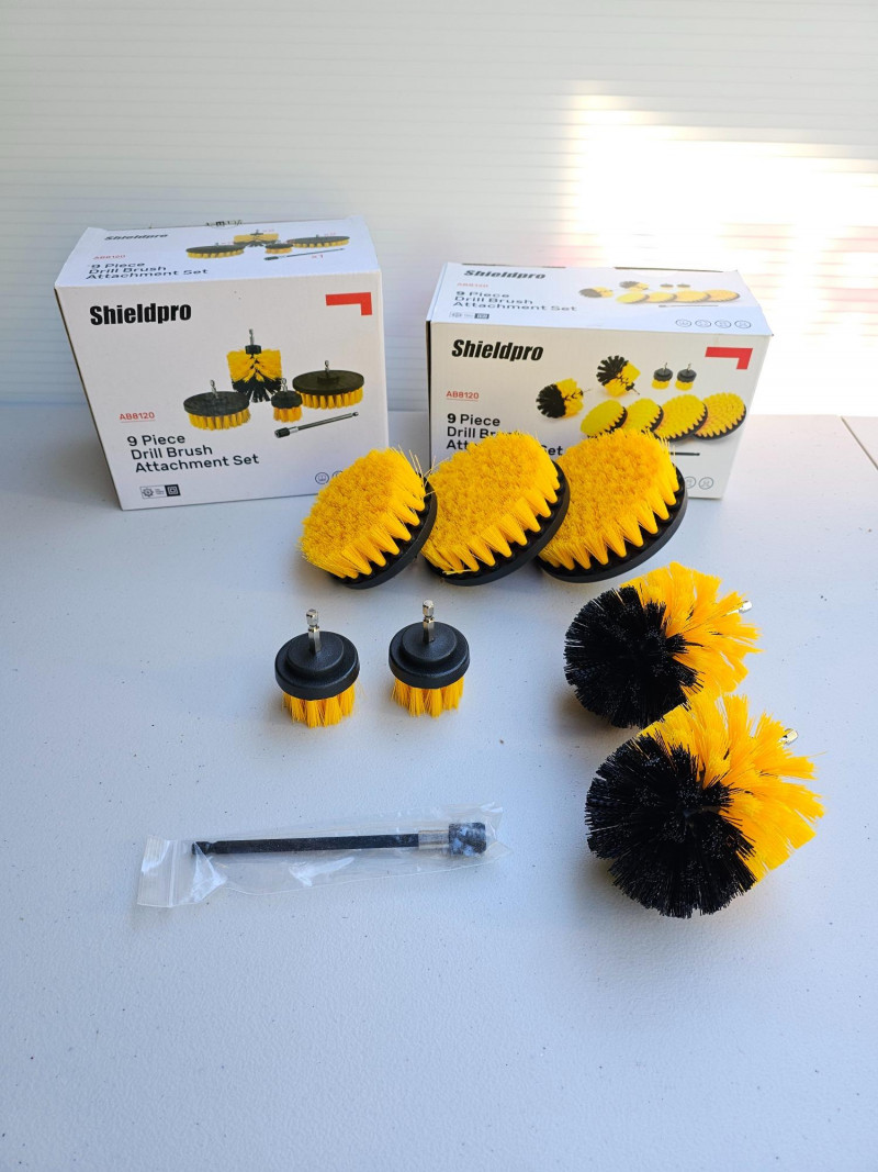 (2) Shieldpro 9-Piece Drill Bruch Attachment Set Quick disconnects make changes brushes easy! One set is new in box, other set appears new but missing one 4" brush Included: (4) 5" brushes (3) 4" brushes (4) Original brushes (4) 2" brushes (2) 6" extensions