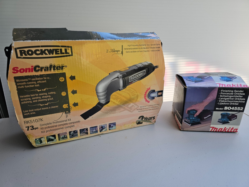 Rockwell Sonicrafter & Makita Finish Sander Rockwell Sonicrafter with accessories Rockwell #RK5107K Tool was barely used but accessory kit is incomplete (missing some blades) Includes accessories in pics Makita BO4552 Finishing Sander Includes manuals, plate, dust bag Both Tested - Both Work!