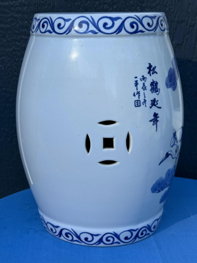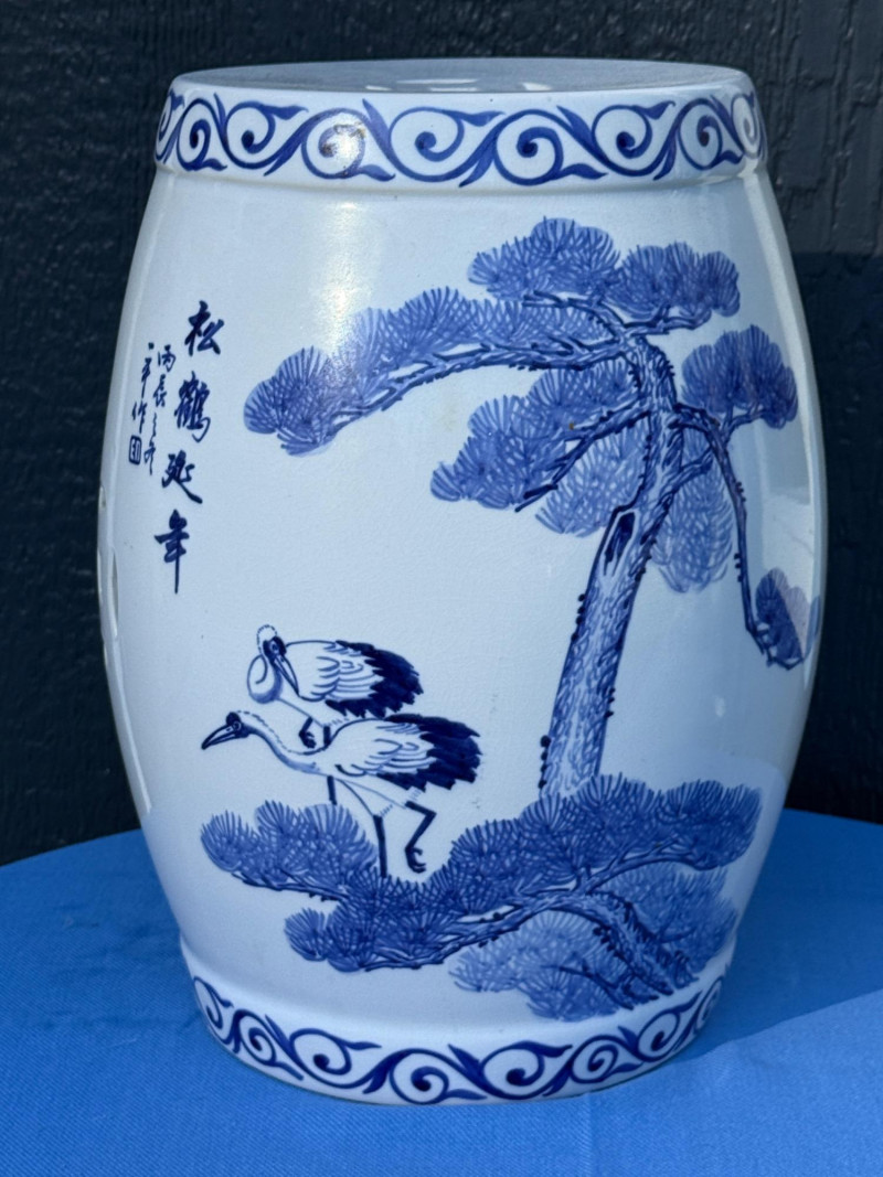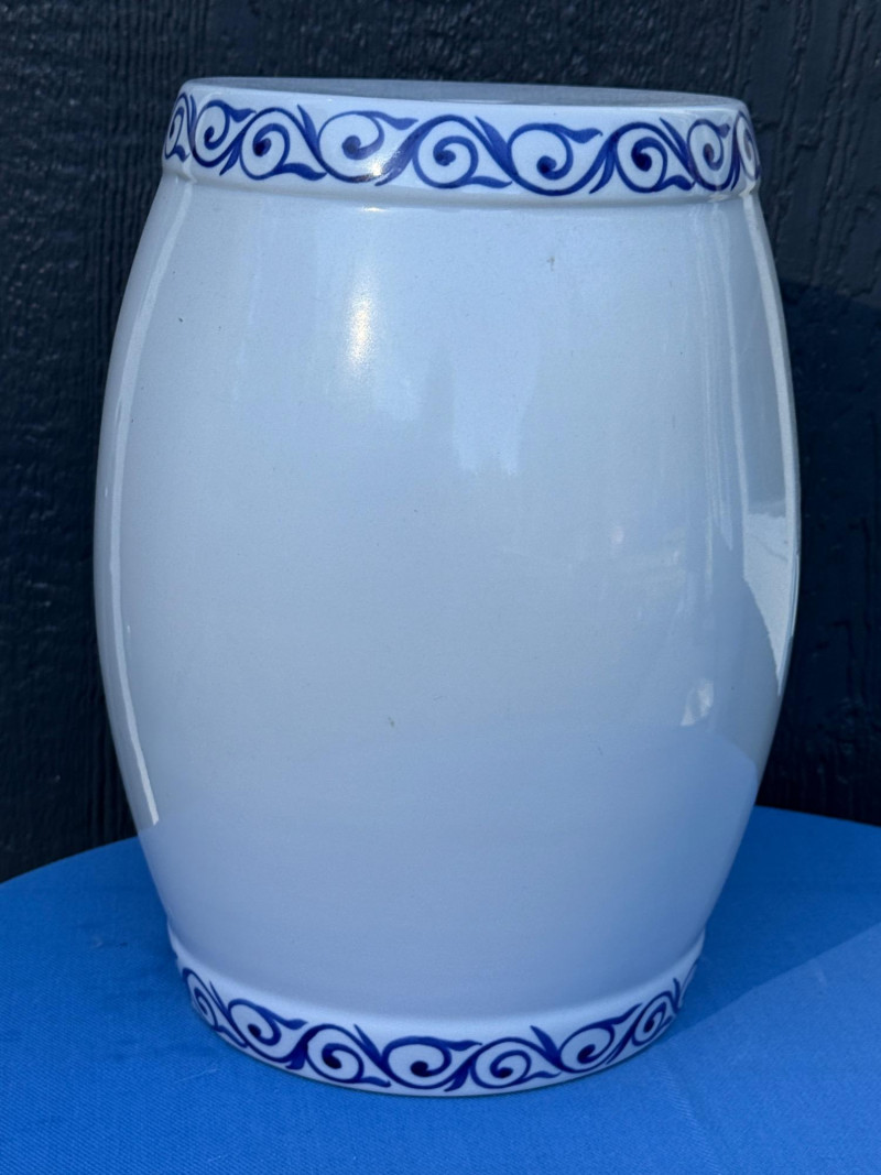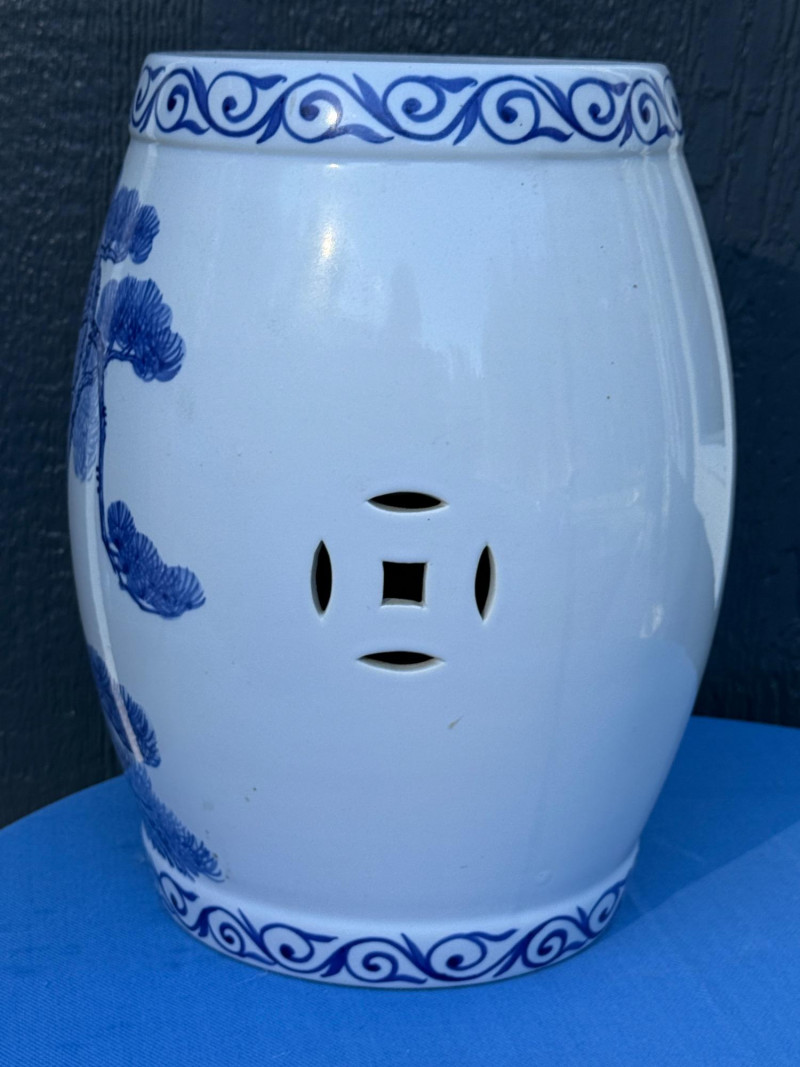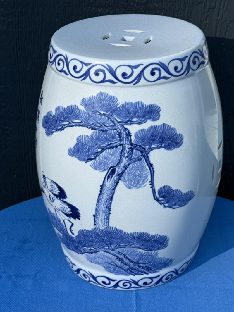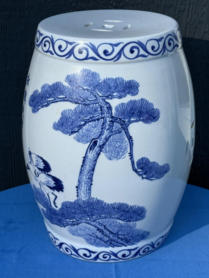 Blue and White Ceramic Hibachi, Pedestal or Stool Traditionally used as a heater or hibachi, these have evolved to decorate as a pedestal or stool. 11x15”