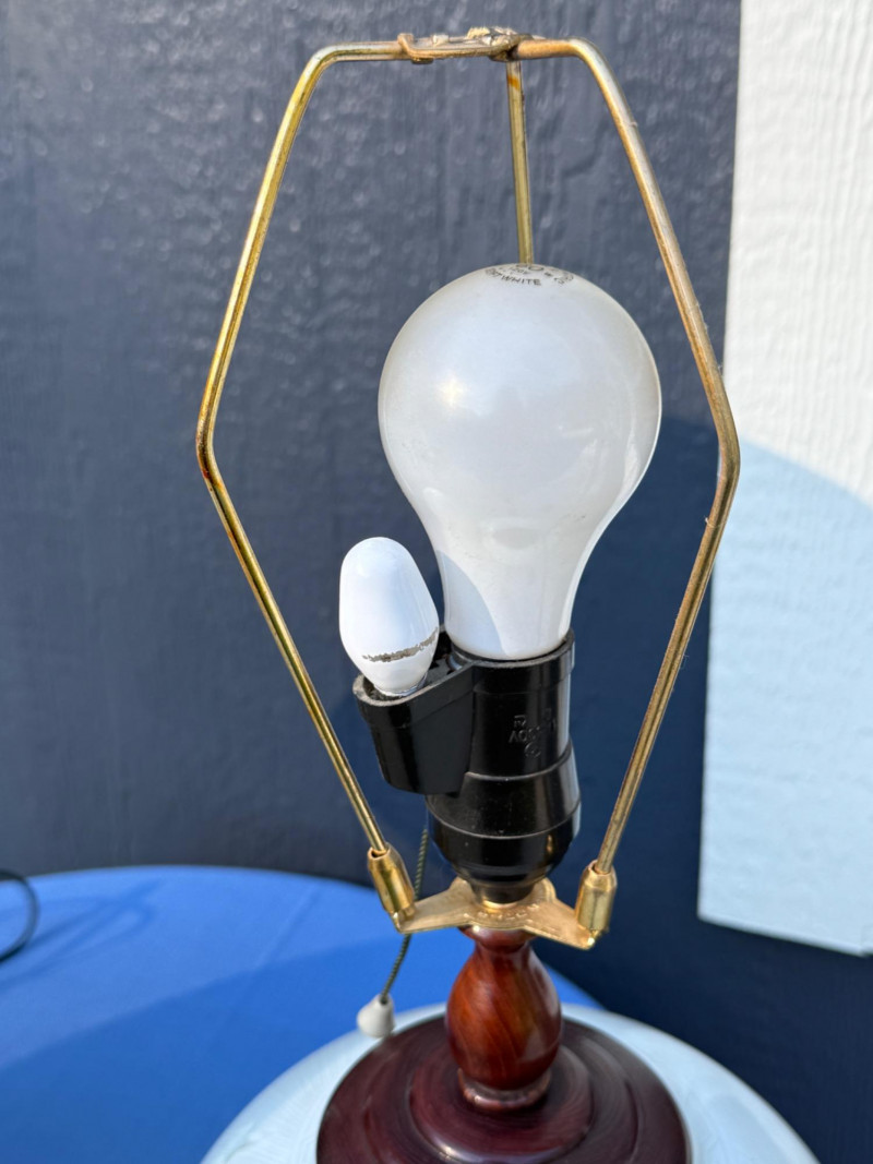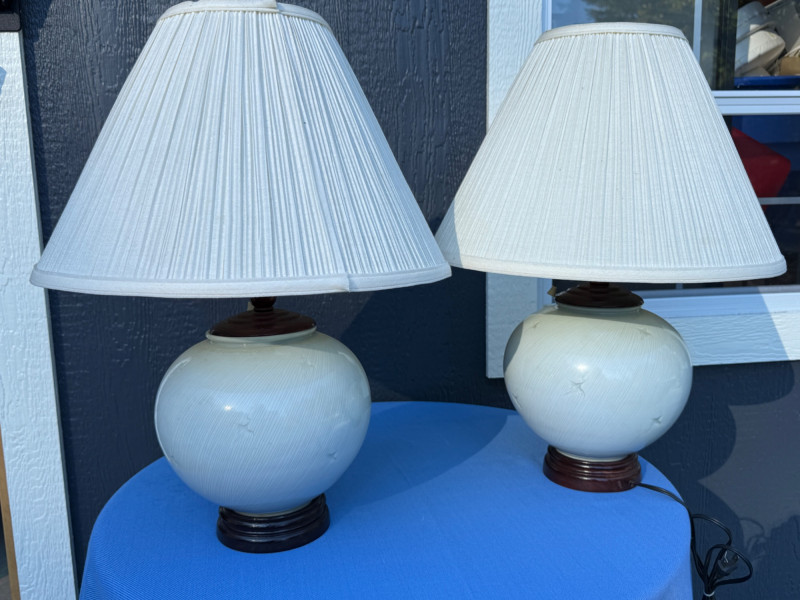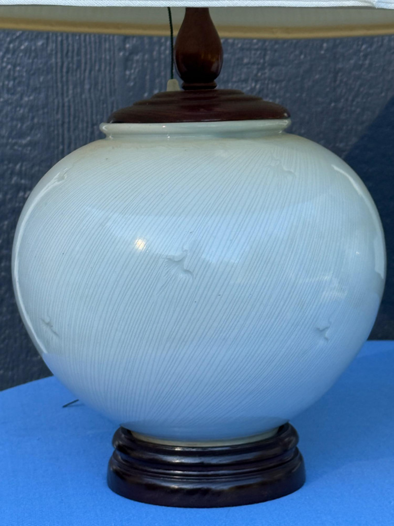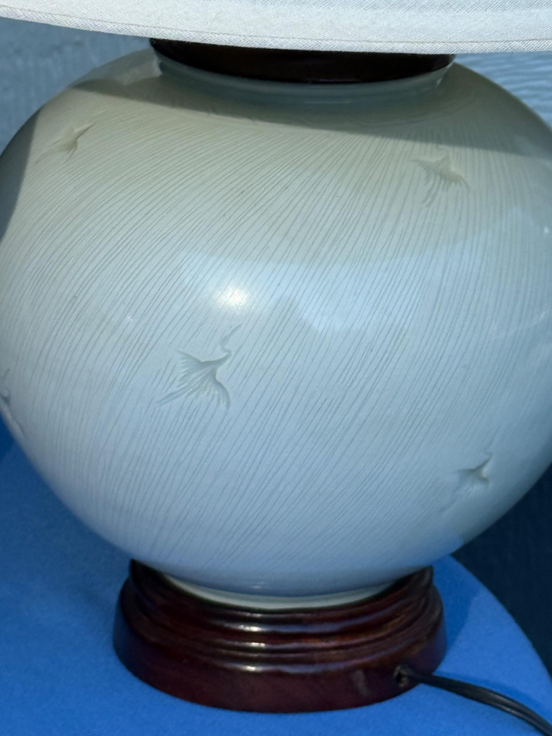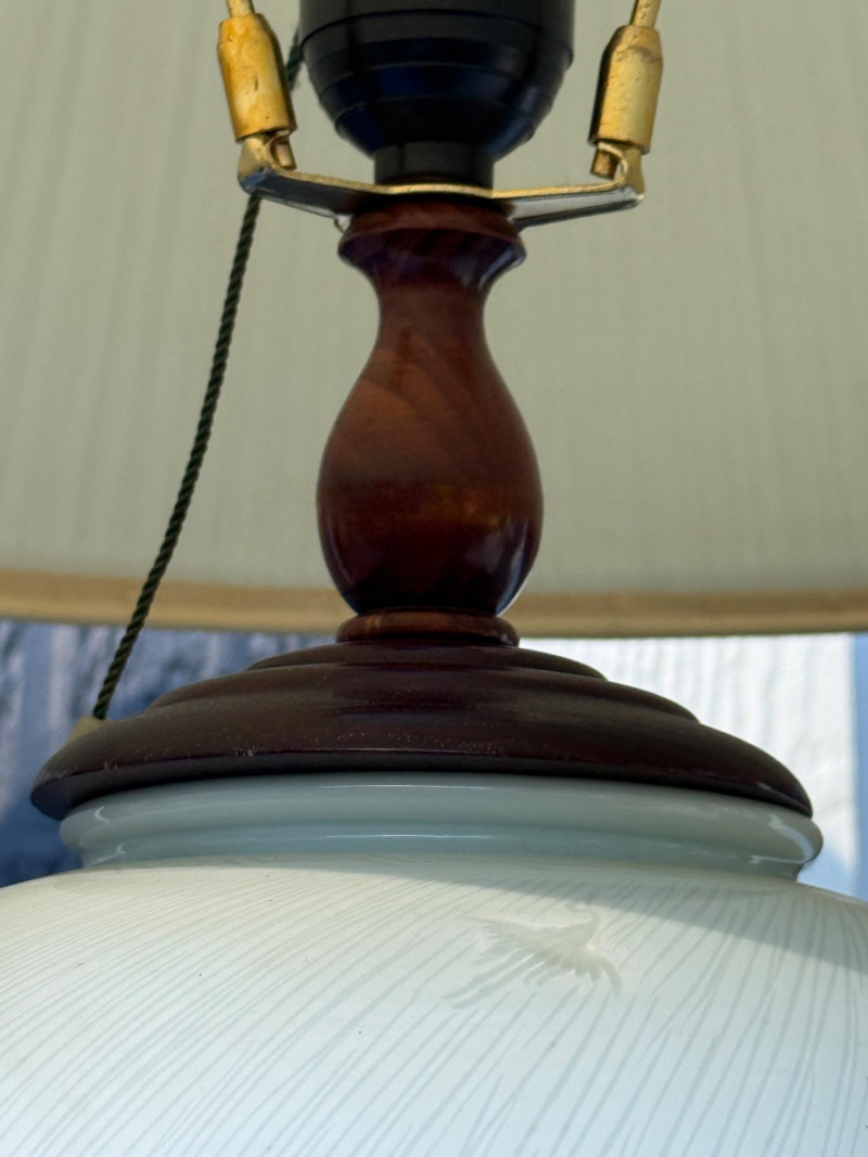Subtle light gray/blue on white Stripe Heron Motif Rosewood & Porcelain Lamp Pair Tested, work. One lamp pull cord is on but does not move when pulled. Best to be used with blue tooth outlet or replace.