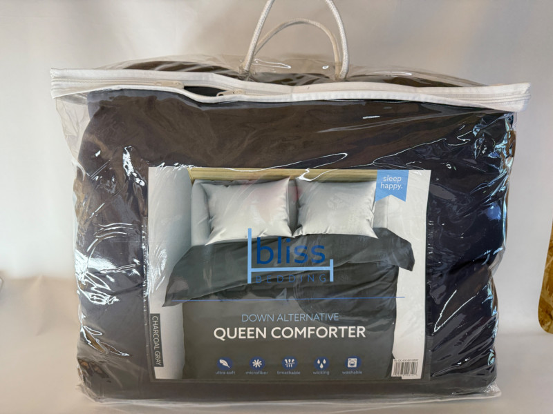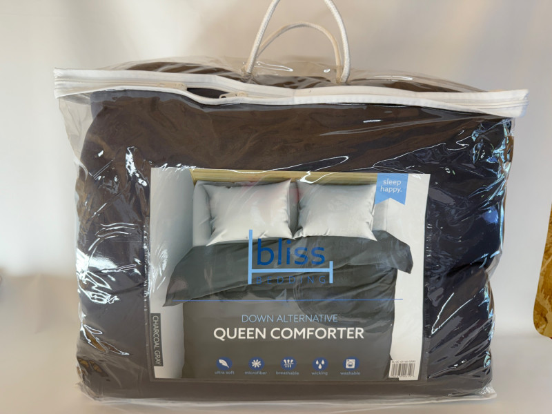 Charcoal Gray Bliss Bedding Down Alternative Queen Comforter. Super soft and light weight. Appears unused in original packaging.