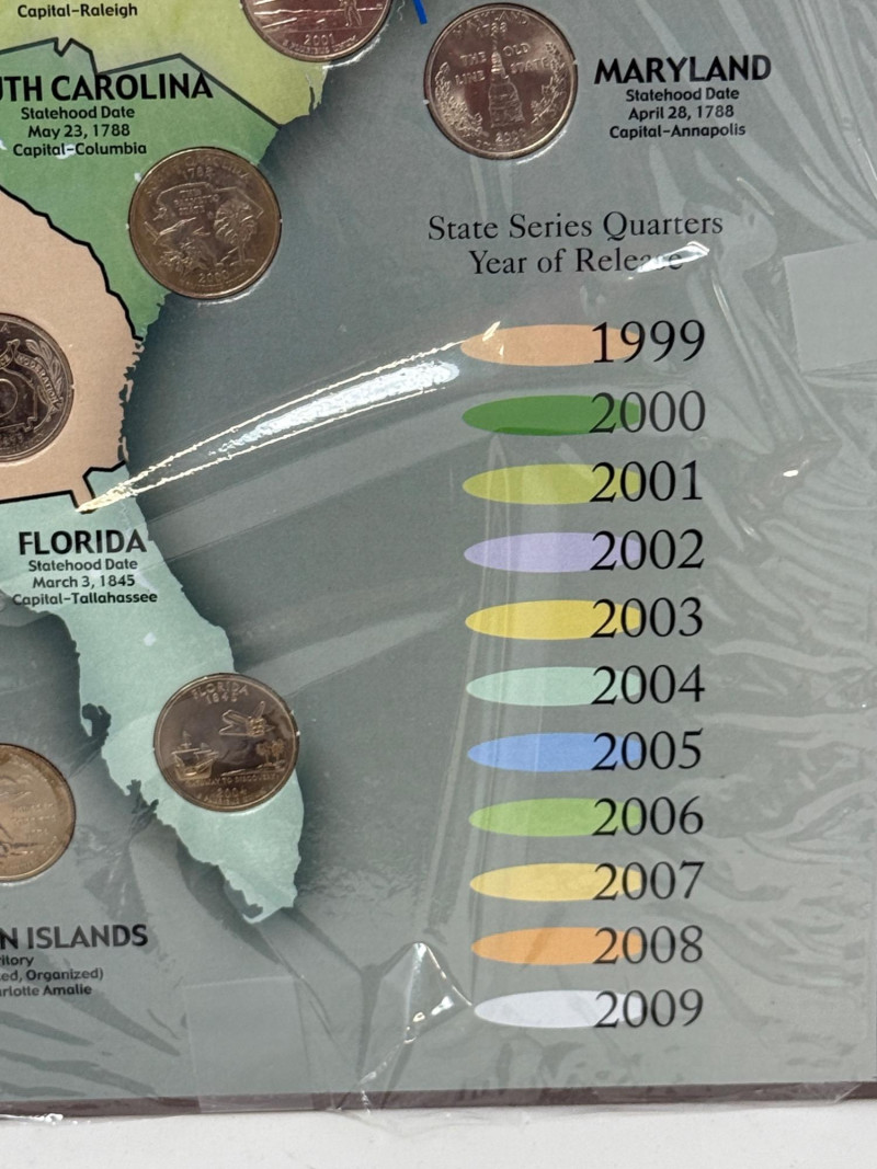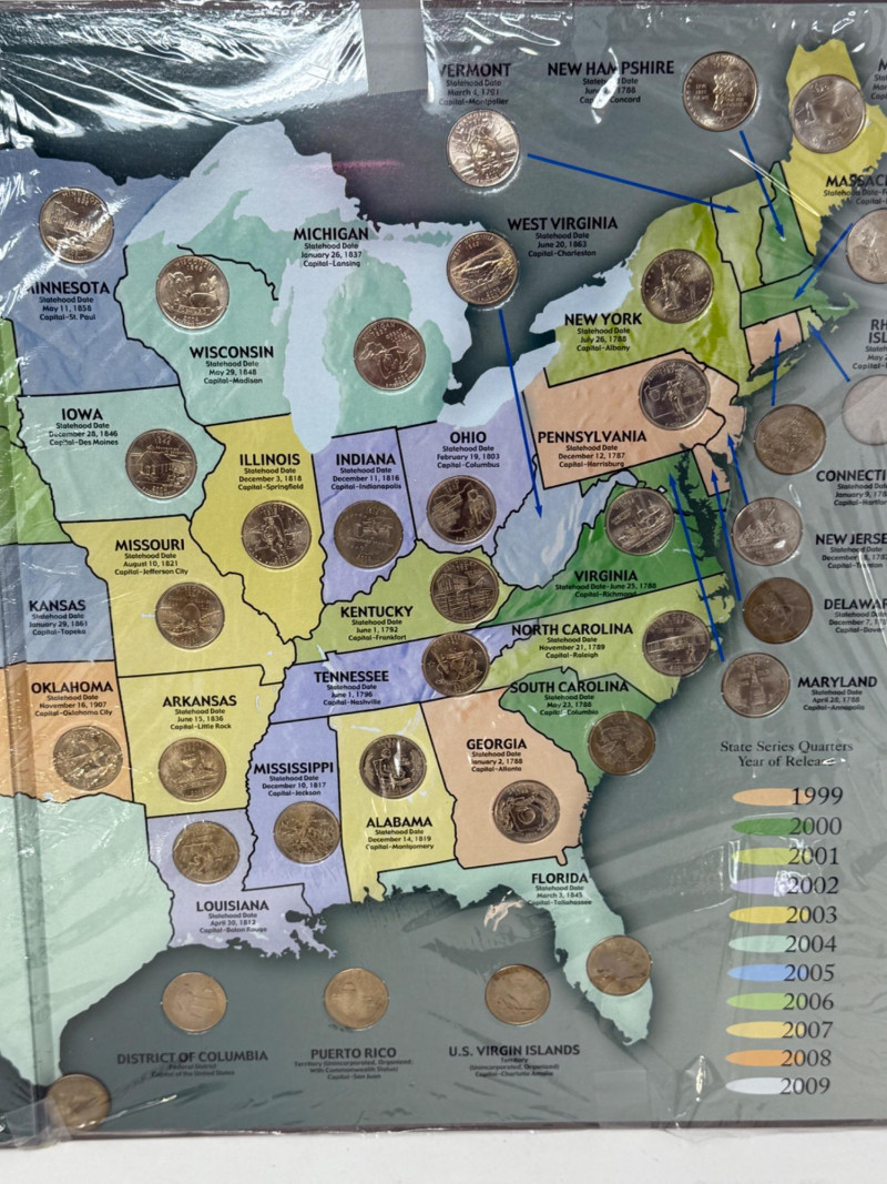 (10) State Quarter Collection Bears and US Map 9 bears each with a quarter in its foot. Maryland is missing its quarter.