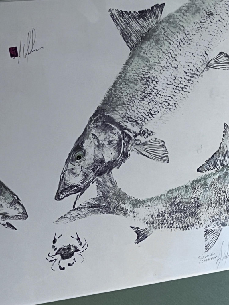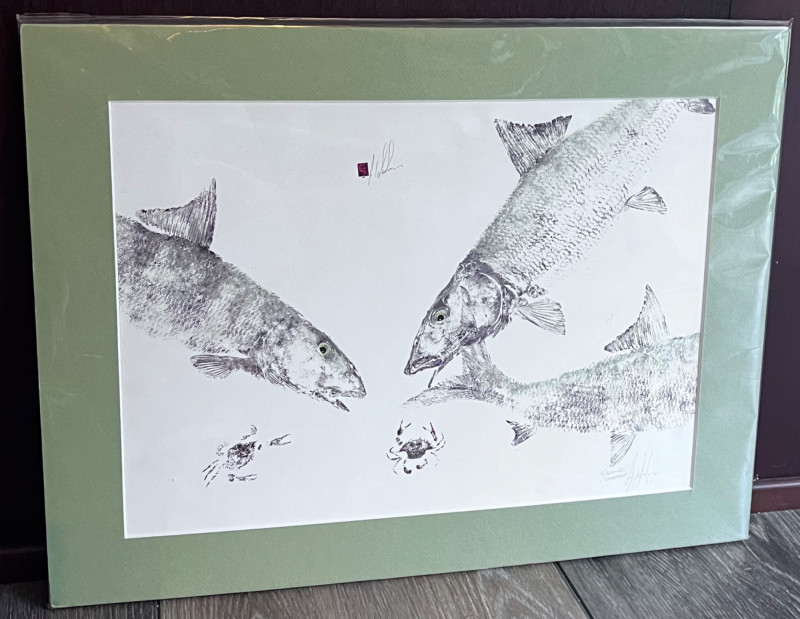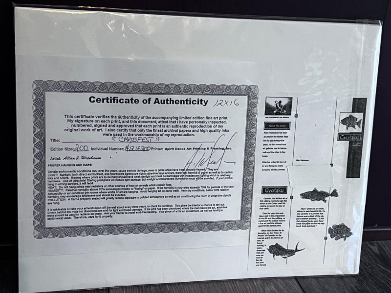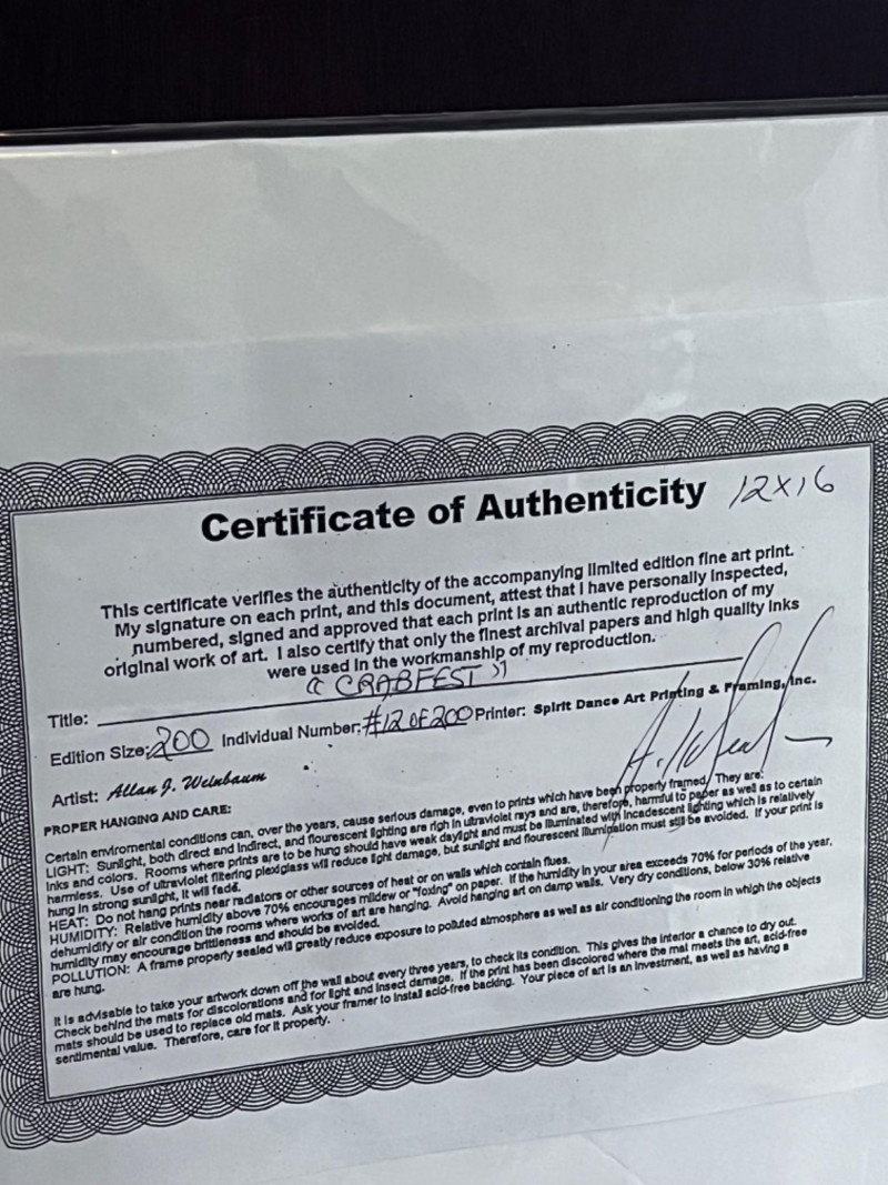 “Crabfest” print by Allan F. Weinbau Print has green matting encased in protective plastic. Comes with a certificate of authenticity. Limited edition #12/200. 12”x16”