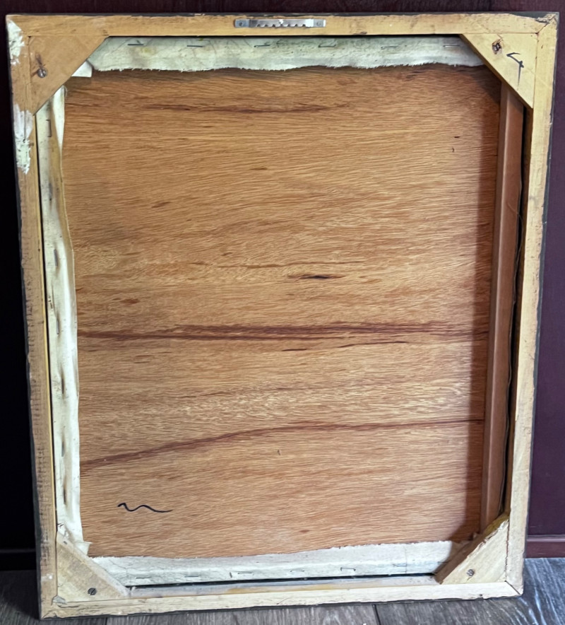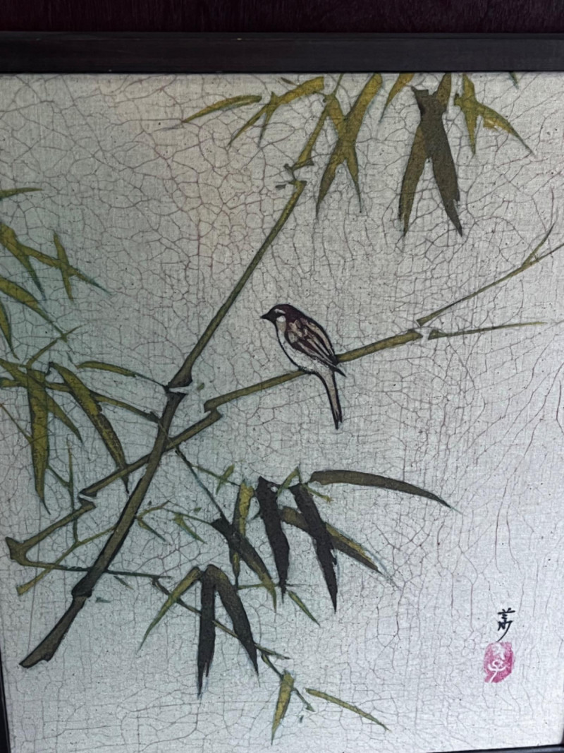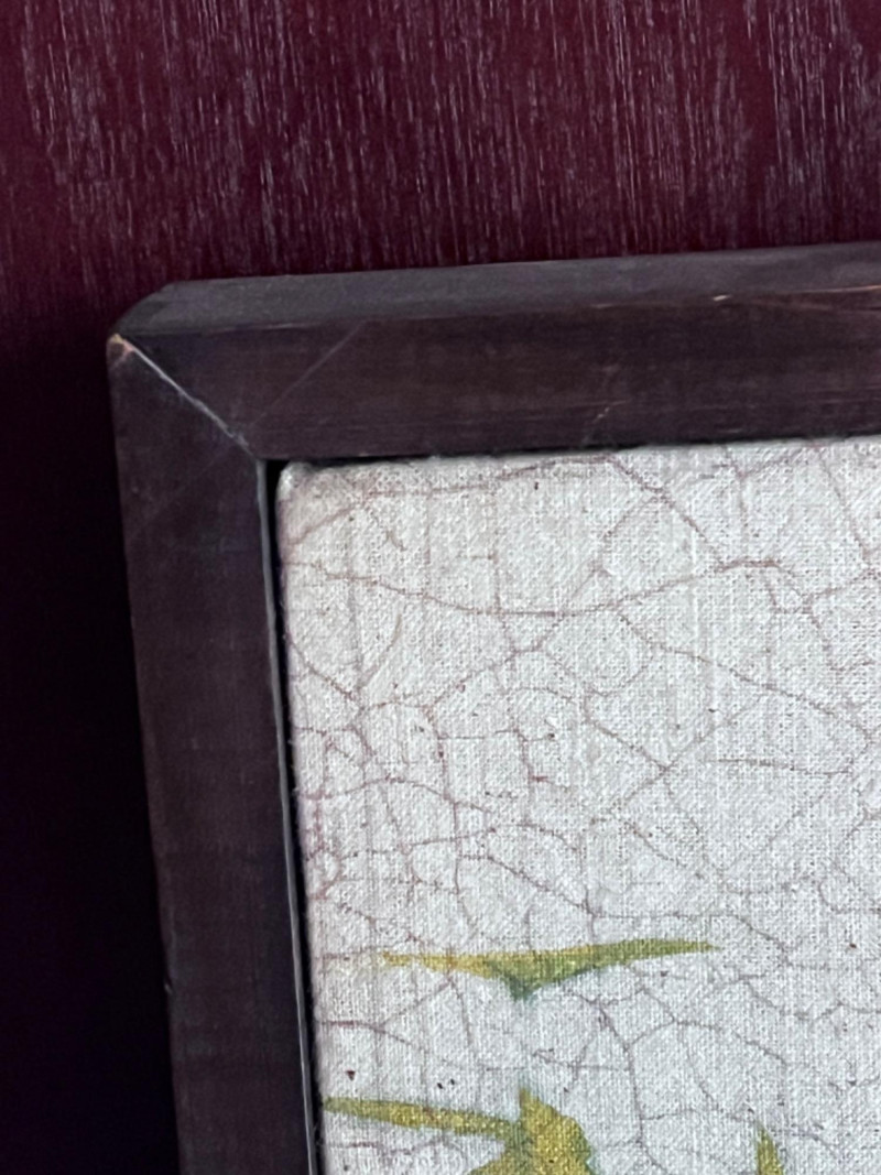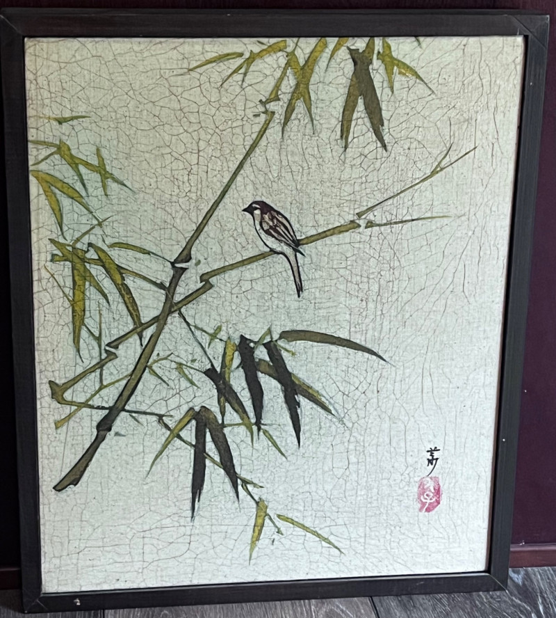 Vintage Painting on Canvas of Bird on Bamboo with Crackled Finish Canvas painting in wood frame. 19.5”x16.5”