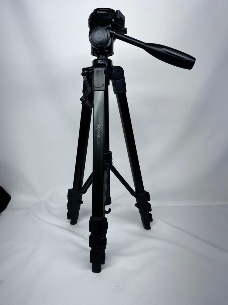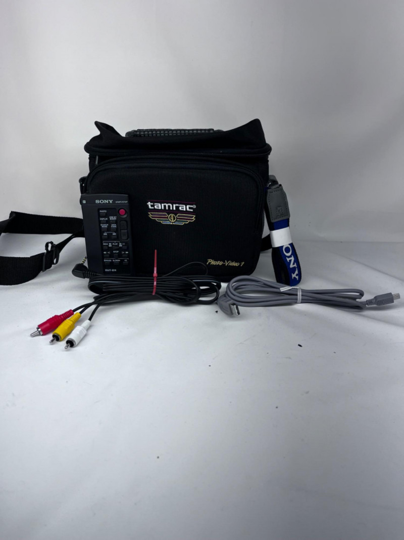 Comes with: Ravelli tripod, Sony RMT-814 remote, audio/video cord, USB cord, Tamrac camera bag, and Sony camera strap.