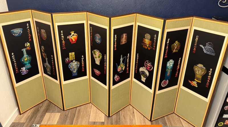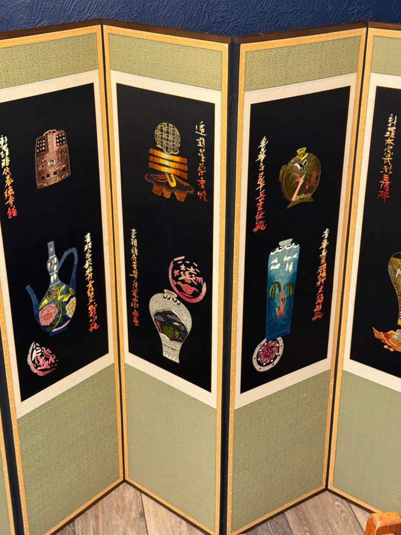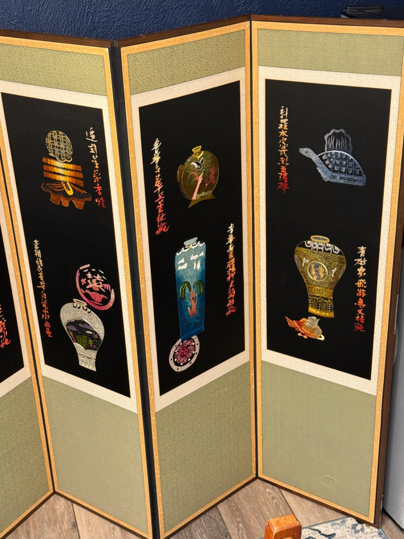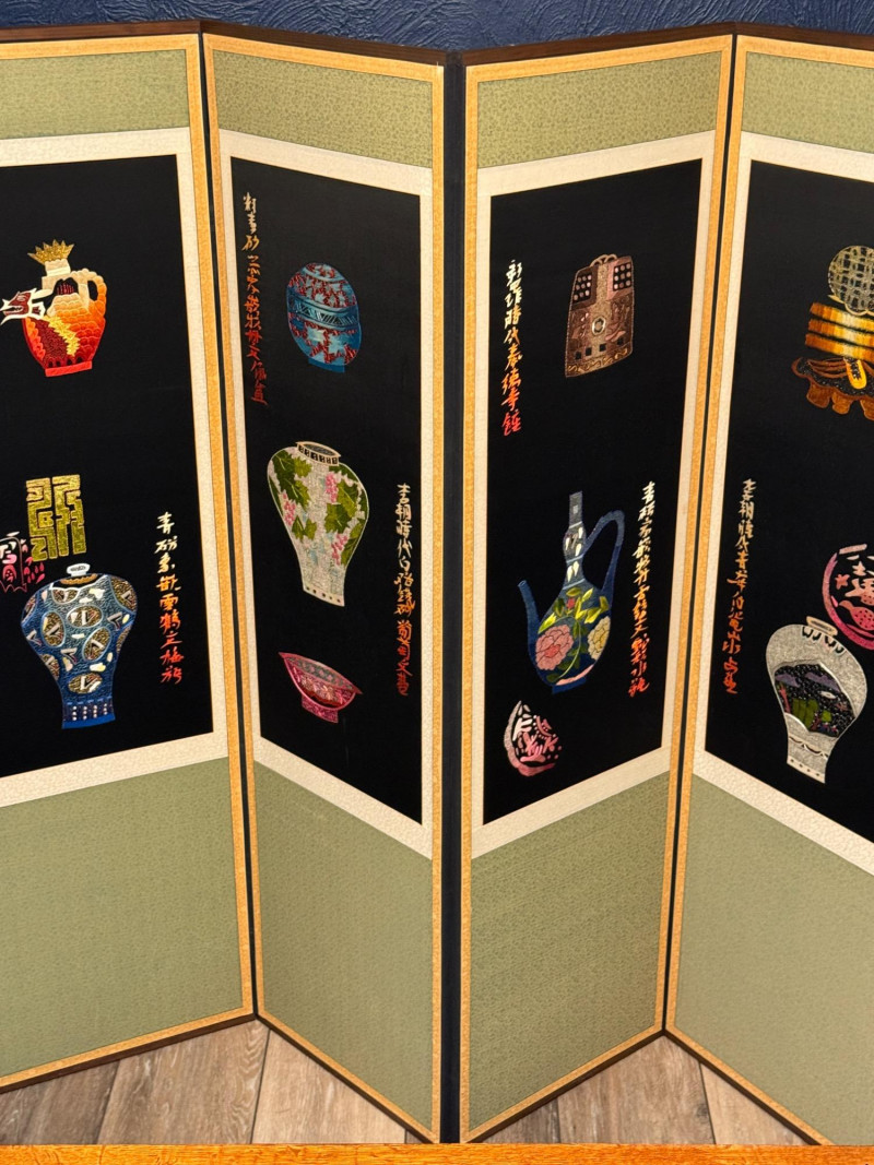 Vintage Korean Embroidered Asian Folding Screen/Room Divider With Depictions Of Antique Artifacts Amazing color and detail in this vintage piece! Folding screens, known as 'byeongpung' in Korea, have a long history as decorative and functional items in East Asian households. They were traditionally used to divide spaces, block drafts, and add aesthetic beauty to interiors, often featuring intricate embroidery. These screens frequently depict scenes from nature, historical events, or symbolic motifs, with materials ranging from silk and paper to wood and lacquer. The use of metallic threads and detailed embroidery, as seen in this example, is characteristic of high-quality decorative arts from the region, often created for wealthy patrons or as ceremonial objects. The reverse side features the use of calligraphy as the primary decorative element suggesting appreciation for traditional art forms, possibly intended for a home or office setting to enhance the ambiance with its artistic and cultural significance. Each Panel: 61"T x 17.5”L Total: 61"T x 140”L