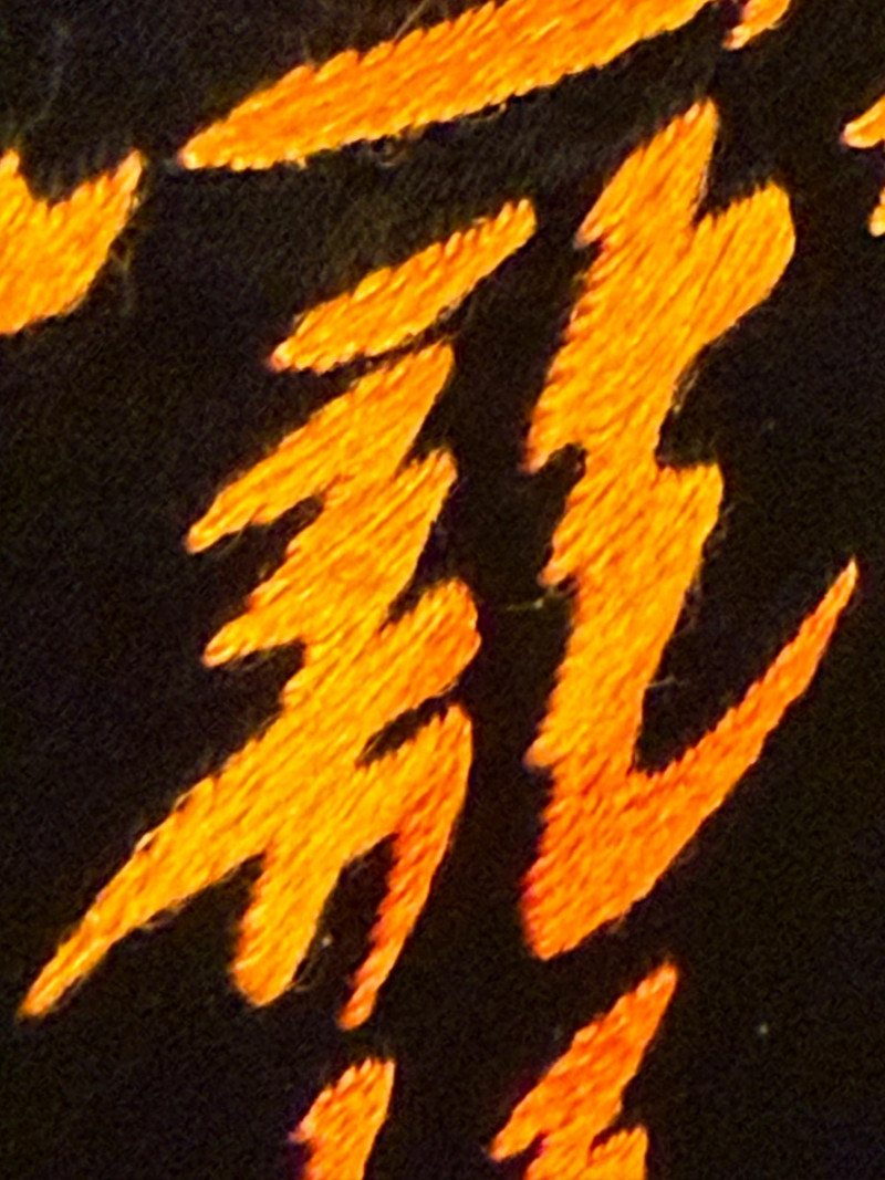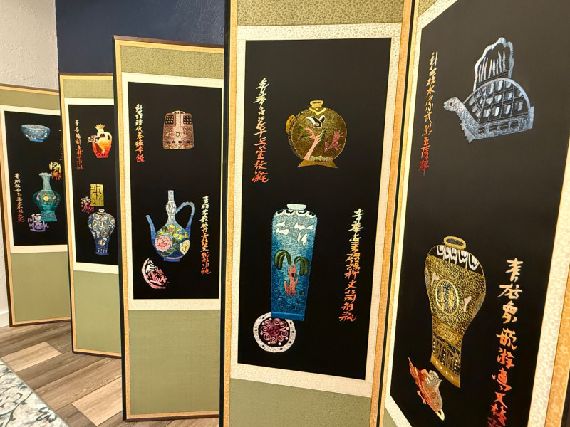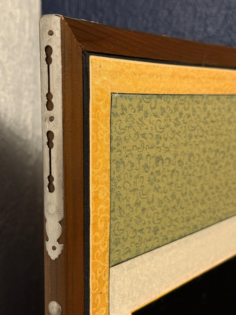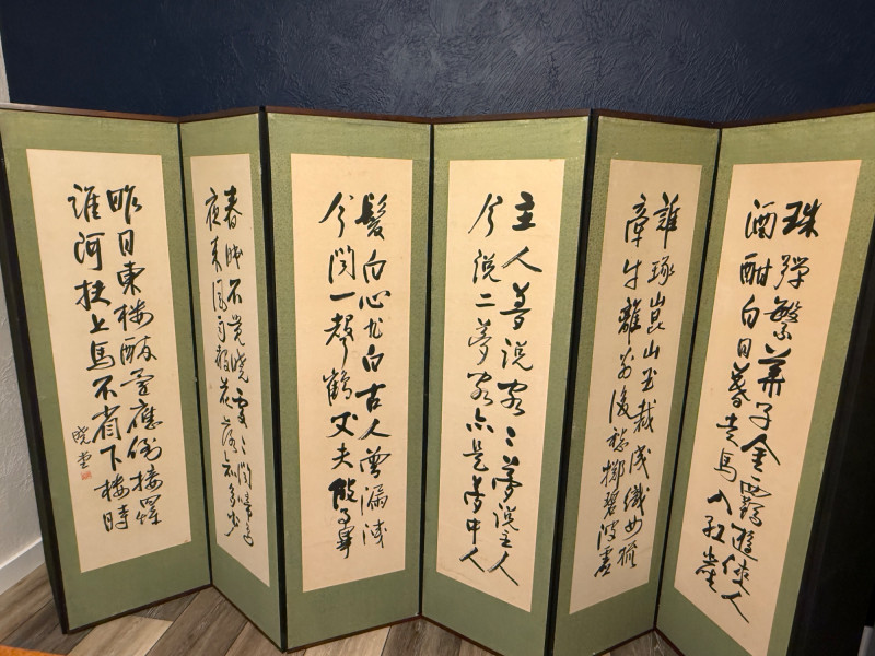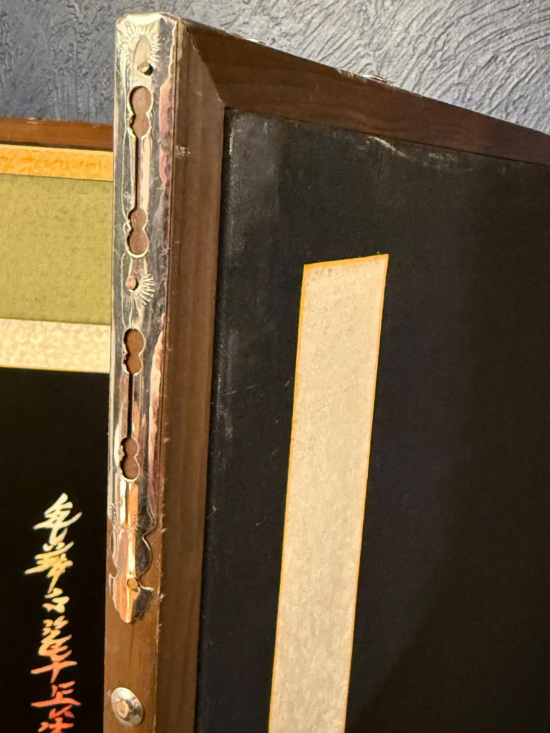 Vintage Korean Embroidered Asian Folding Screen/Room Divider With Depictions Of Antique Artifacts Amazing color and detail in this vintage piece! Folding screens, known as 'byeongpung' in Korea, have a long history as decorative and functional items in East Asian households. They were traditionally used to divide spaces, block drafts, and add aesthetic beauty to interiors, often featuring intricate embroidery. These screens frequently depict scenes from nature, historical events, or symbolic motifs, with materials ranging from silk and paper to wood and lacquer. The use of metallic threads and detailed embroidery, as seen in this example, is characteristic of high-quality decorative arts from the region, often created for wealthy patrons or as ceremonial objects. The reverse side features the use of calligraphy as the primary decorative element suggesting appreciation for traditional art forms, possibly intended for a home or office setting to enhance the ambiance with its artistic and cultural significance. Each Panel: 61"T x 17.5”L Total: 61"T x 140”L