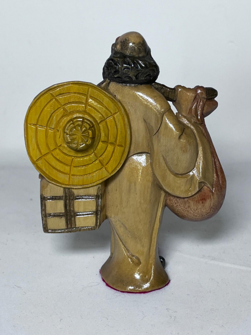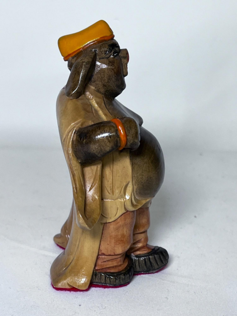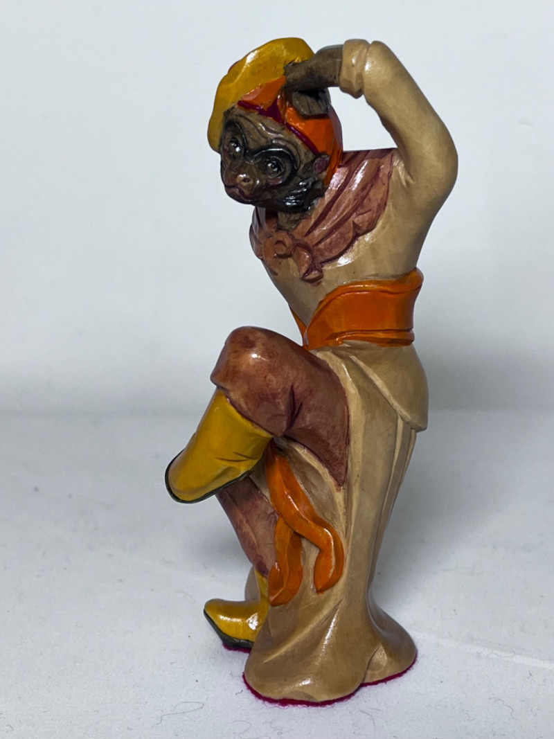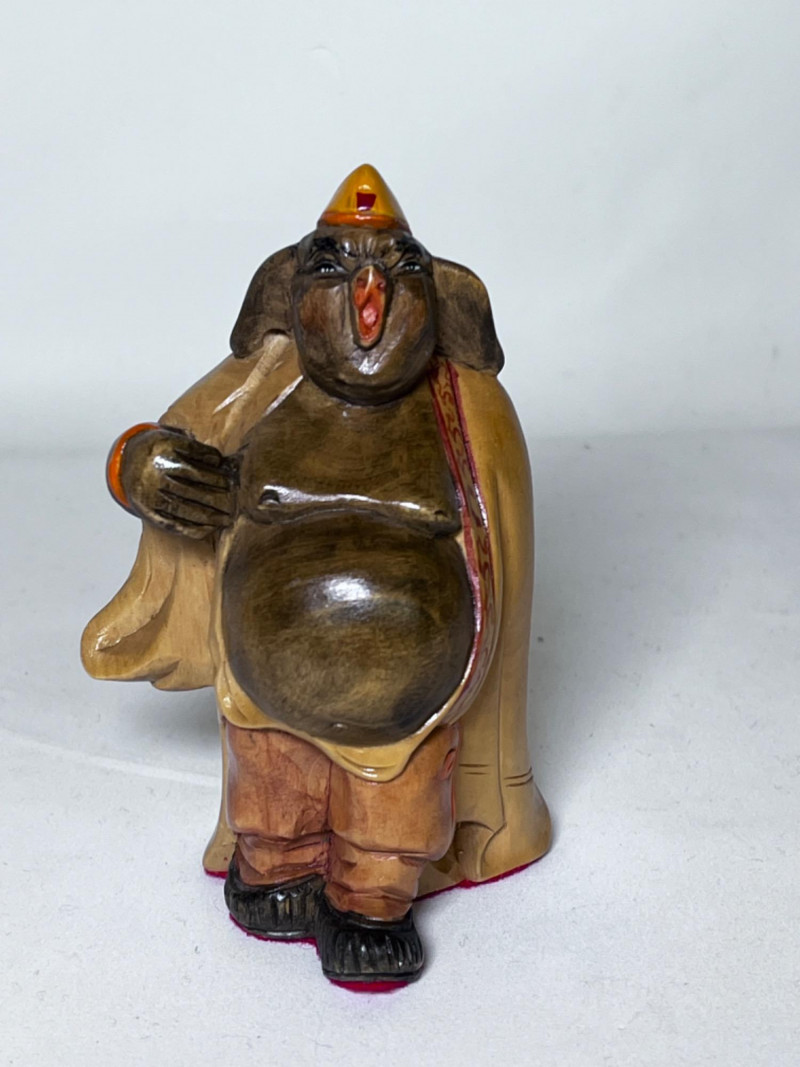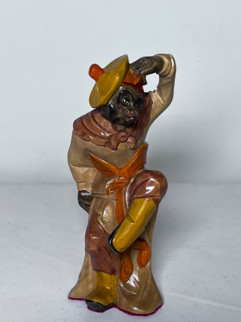 Vintage Wood Fantasy Trio Figurines. Hand carved figurines of a monkey, a pig, and a traveling man. The man is 5”x4”x2.5”. The monkey is 5”x2”x2.5”. The pig is 5”x3”x2.5”.