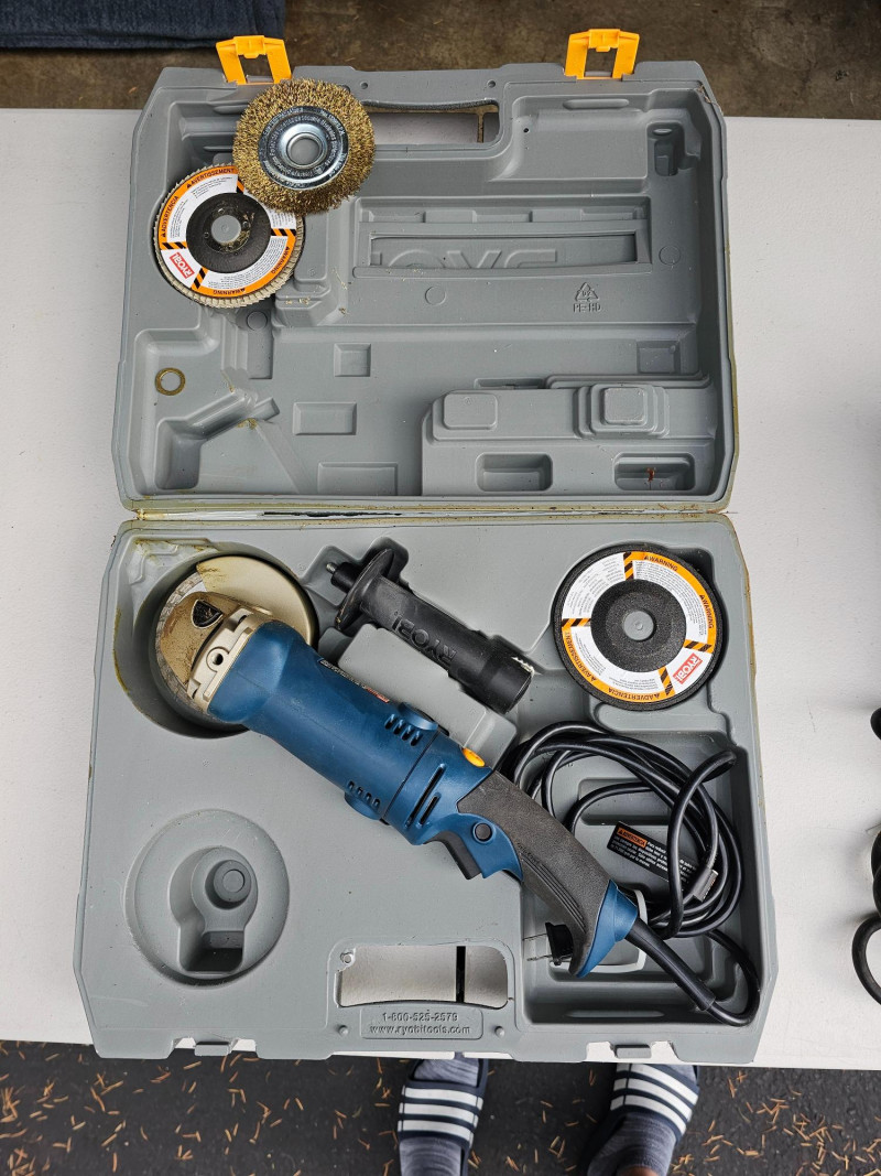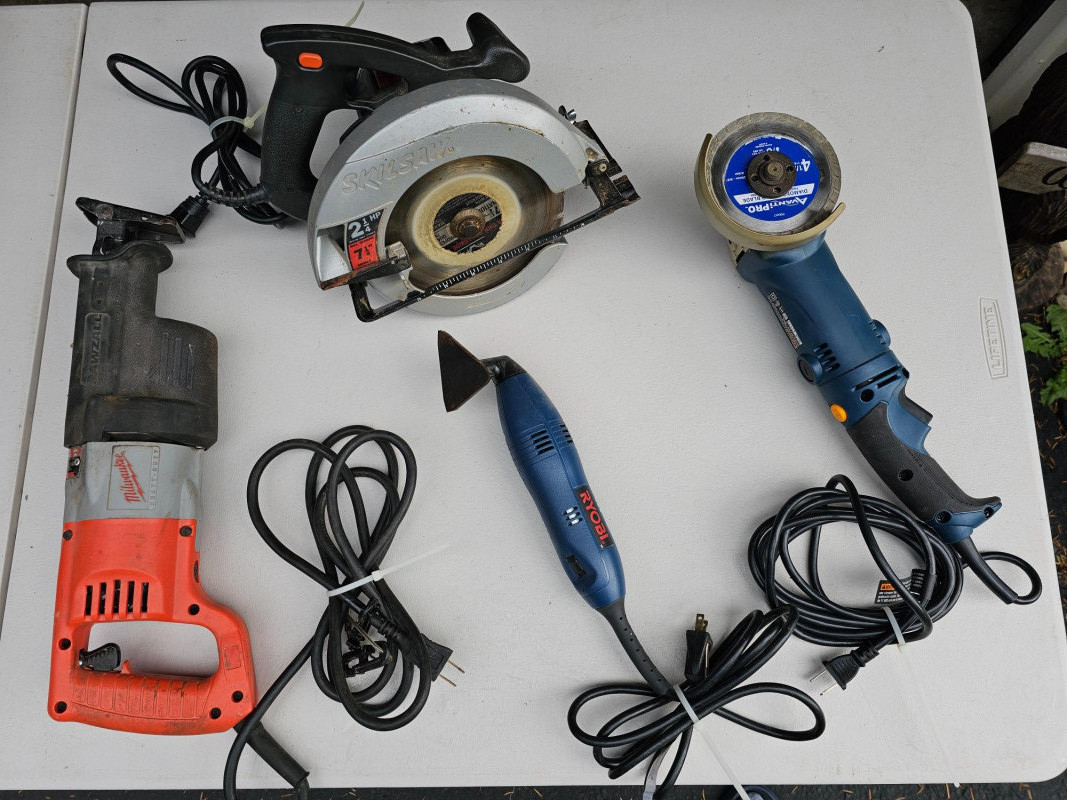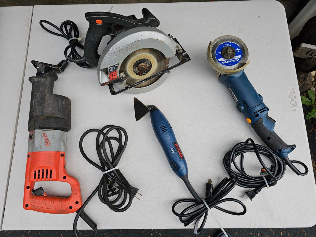 (4) Corded Power Tools (1) Milwaukee HD Sawzall - #6509-22 (1) 7.25" Skilsaw Circular Saw 2.25hp - #5250 (1) Ryobi 4.5" Angle Grinder - #AG452 (1) Ryobi Detail Sander - #DS-1000 All Tested - All Work! Angle grinder with case, side handle, and extra blades/wheels