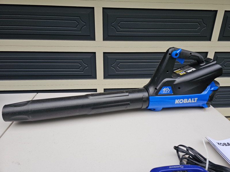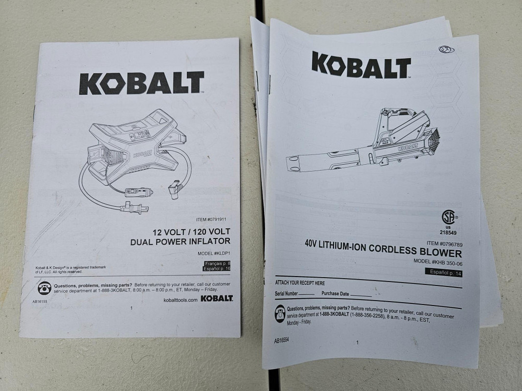 Kobalt 40V Li-Ion Cordless Blower & Corded Dual Power Inflator (1) Kobalt 40V Lithium-Ion Cordless Blower - Model #KHB 350-06 (1) Kobalt 12V/120V Dual Power Inflator Model #KLDP1 Includes on-board accessories & manual Both Tested - Both Work! Tools only.