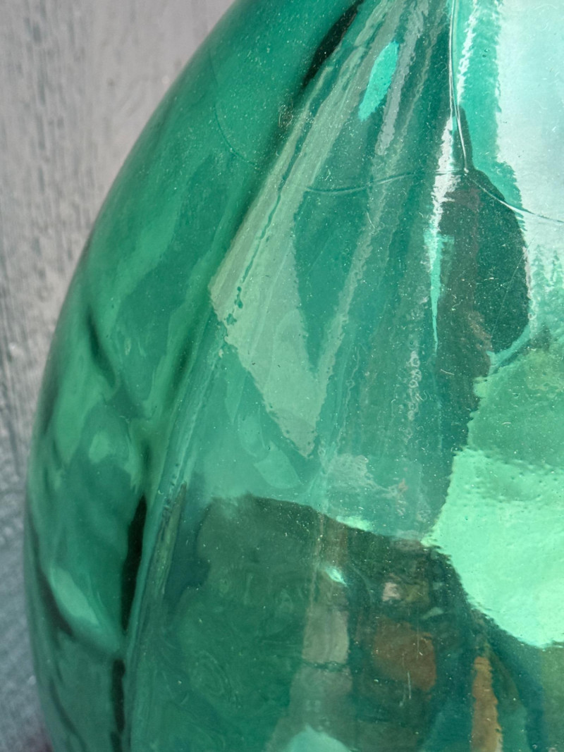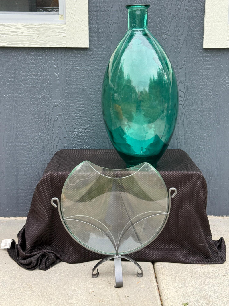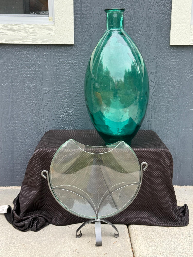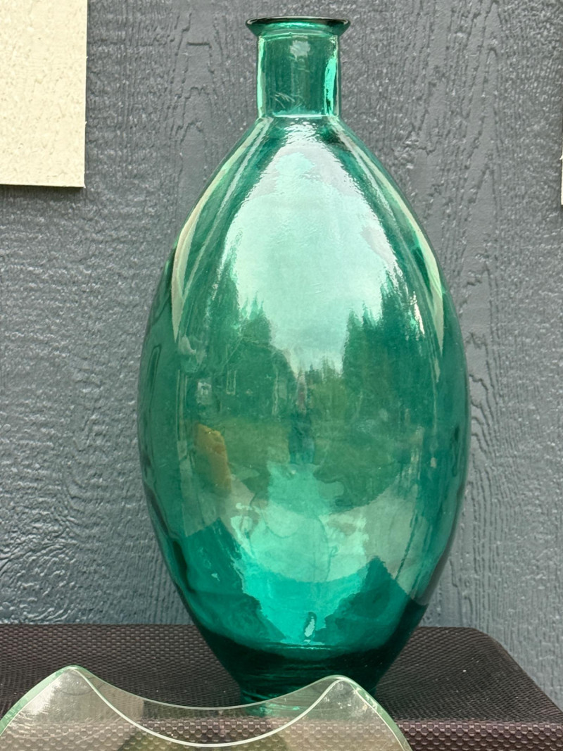 Glass floor vases Round narrow vase with stand is 16x6x16” including metal stand Clear glass with a hint of green. Green float glass color floor vase is 12x23.5”