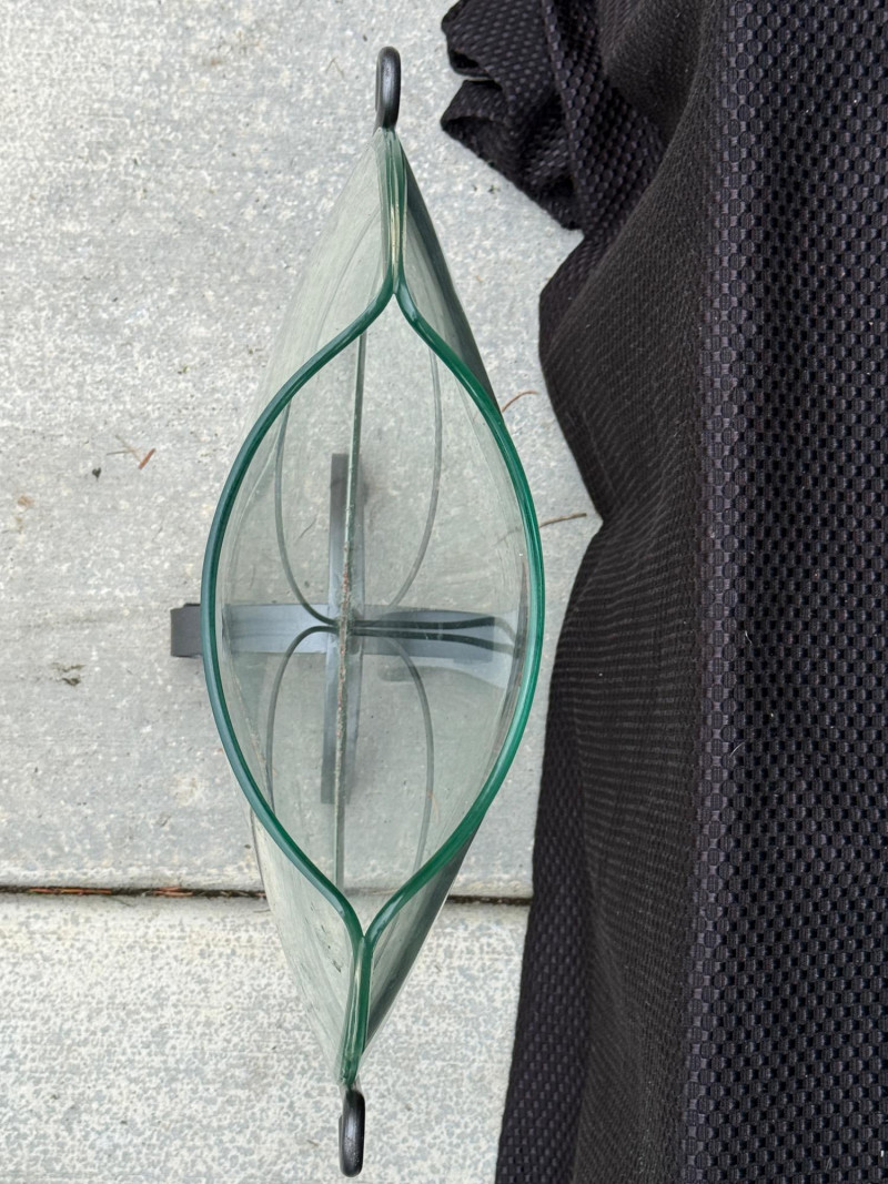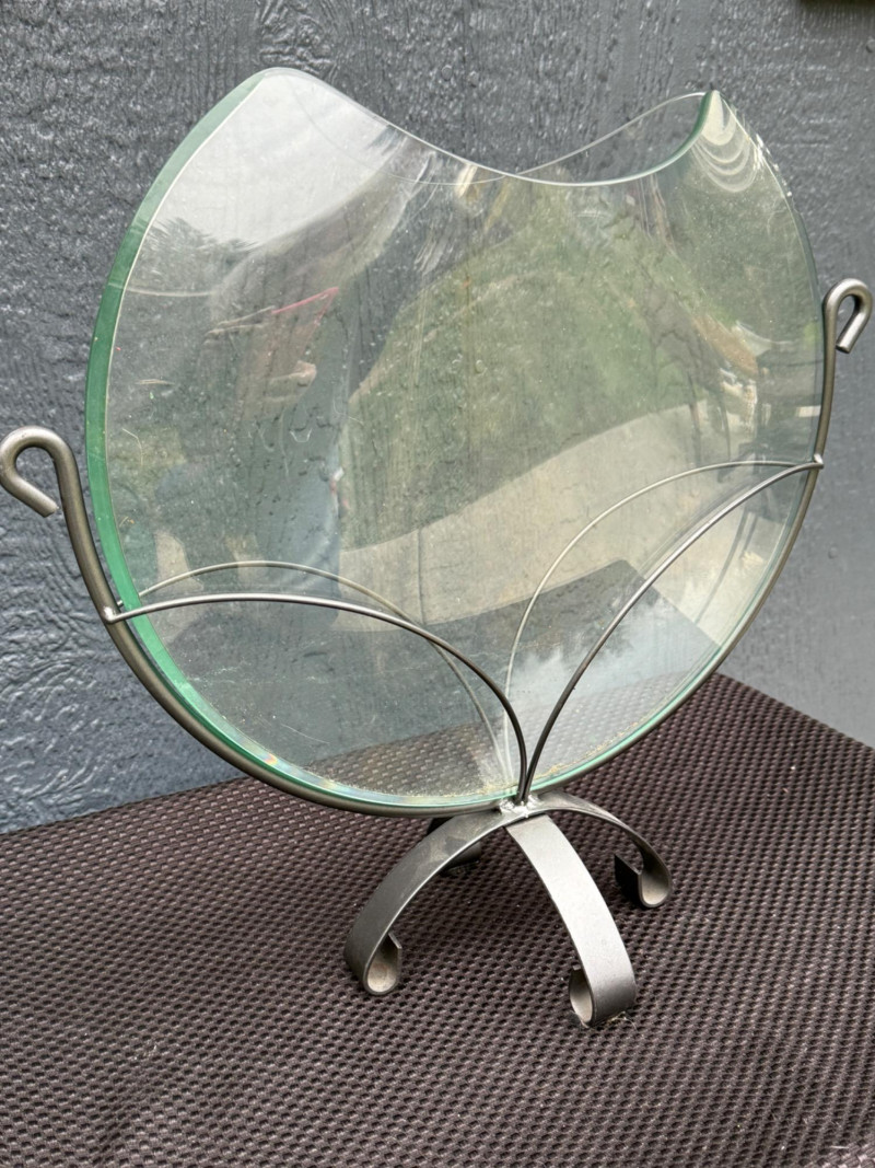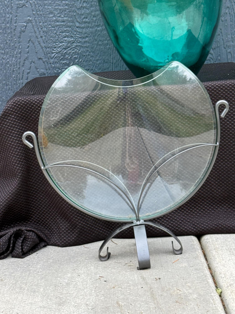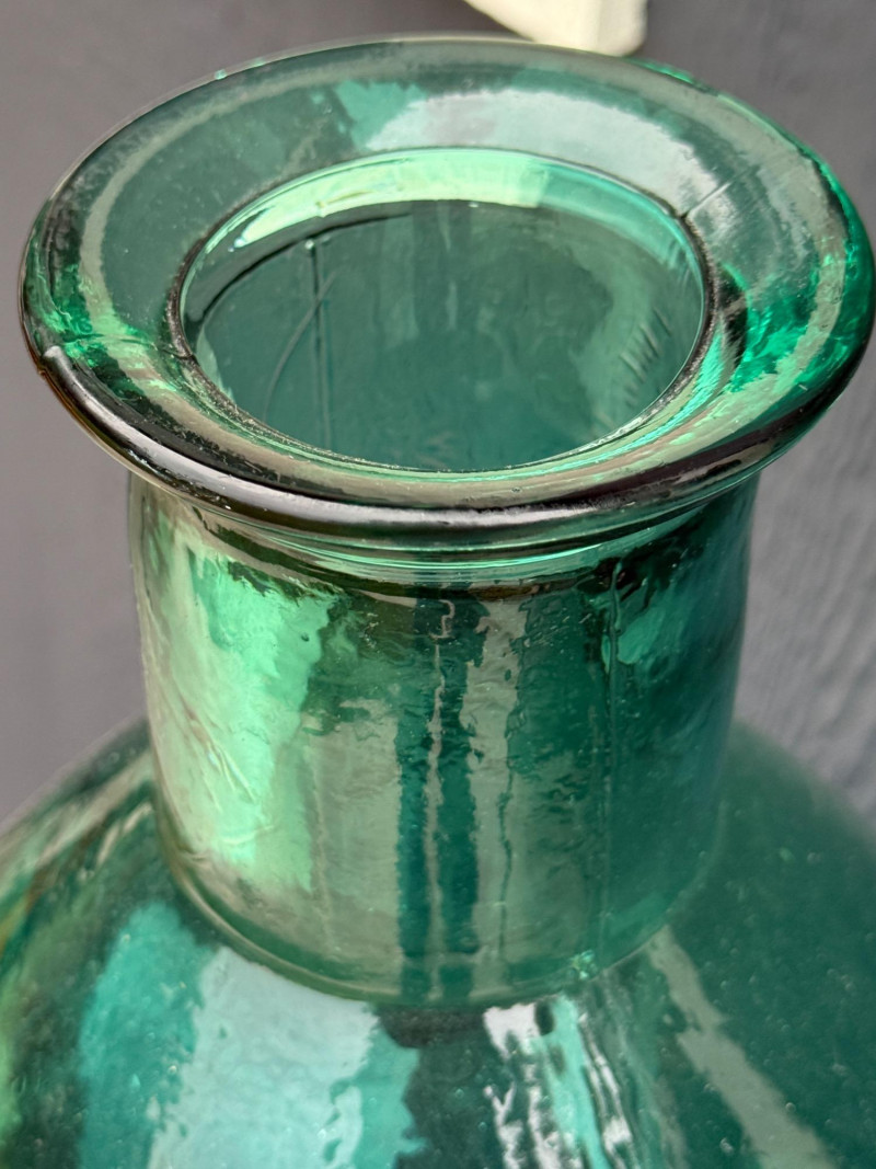 Glass floor vases Round narrow vase with stand is 16x6x16” including metal stand Clear glass with a hint of green. Green float glass color floor vase is 12x23.5”