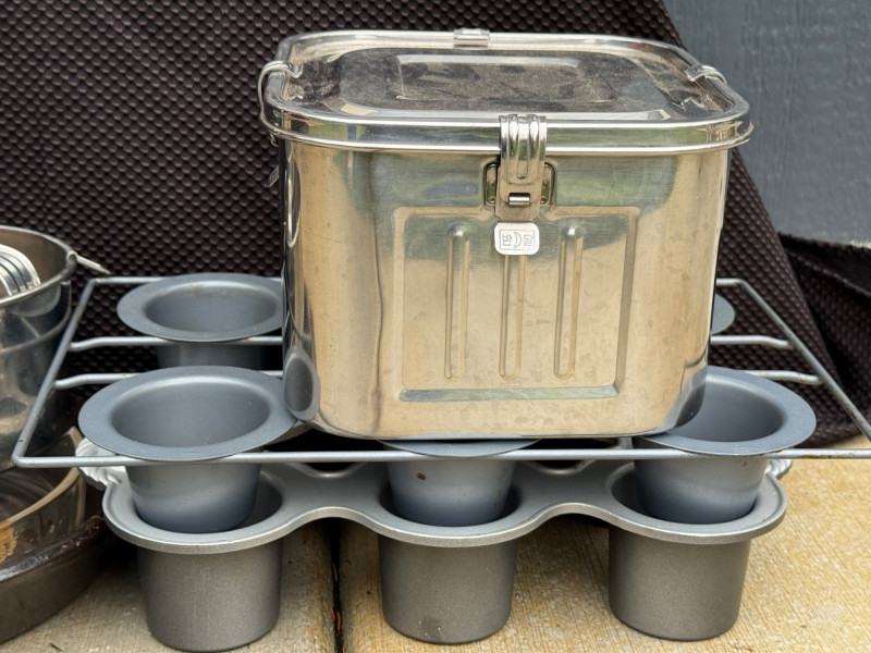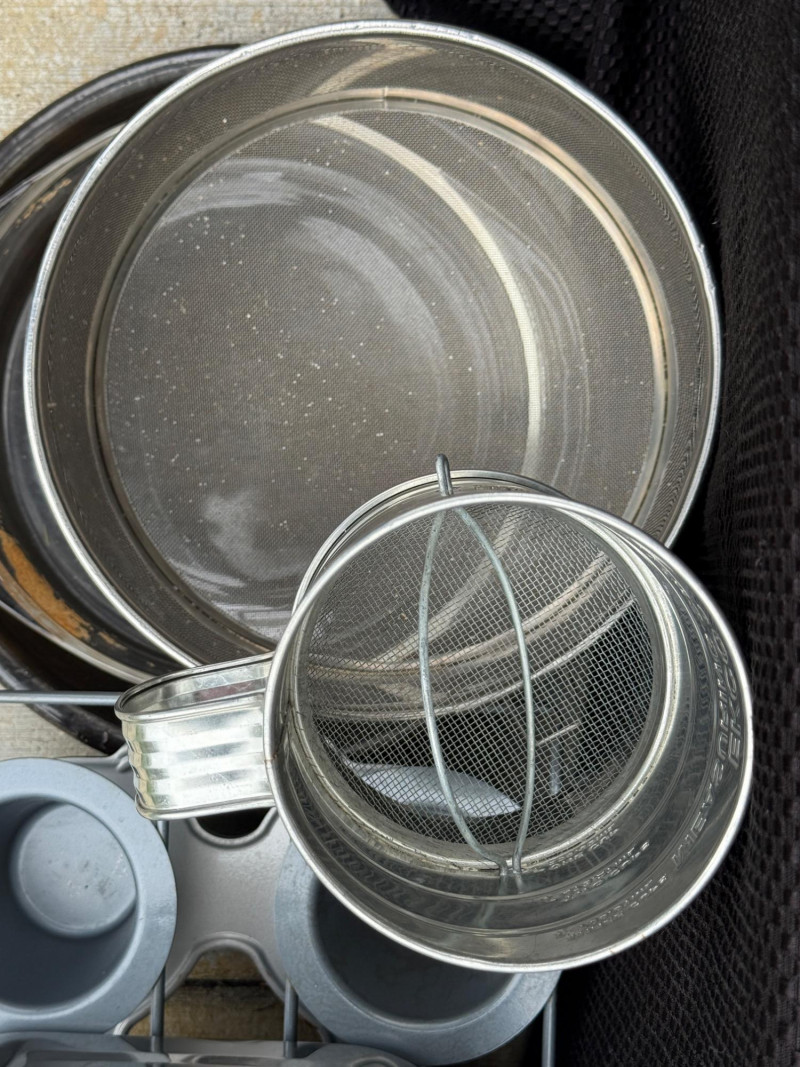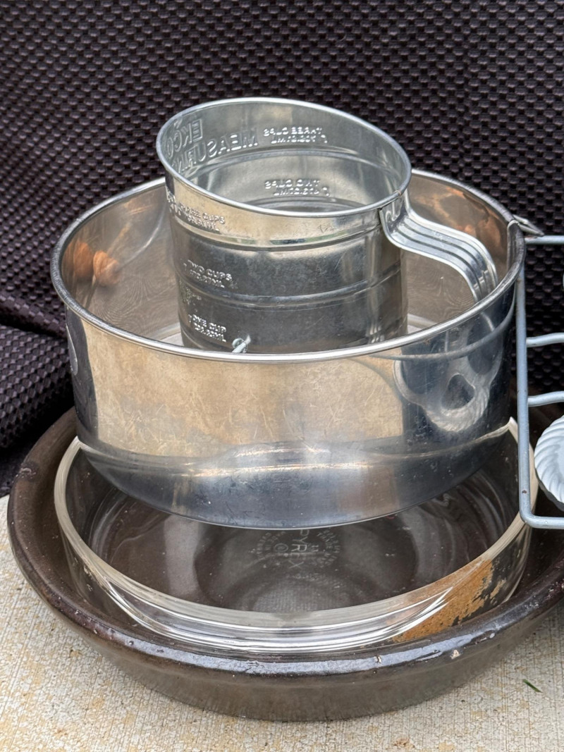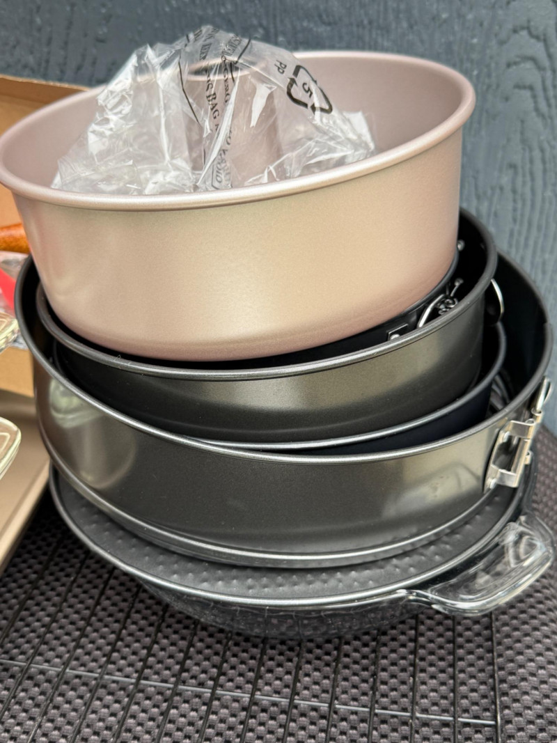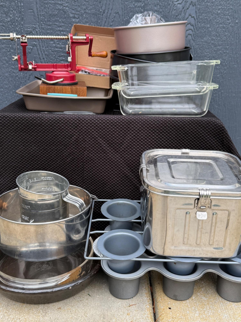 Bakeware Collection With Apple Peeler/Slicer springform and angel food cake pans deep muffin tins 2 sifters cake and loaf pans cooling rack biscuit cutters kitchen shears aluminum nesting storage containers and 2 aprons
