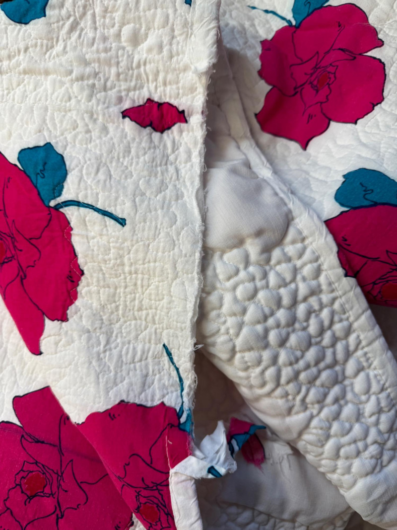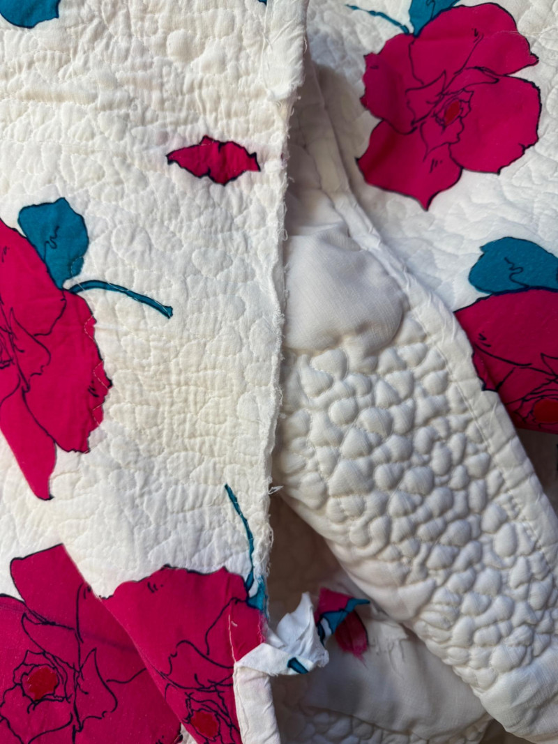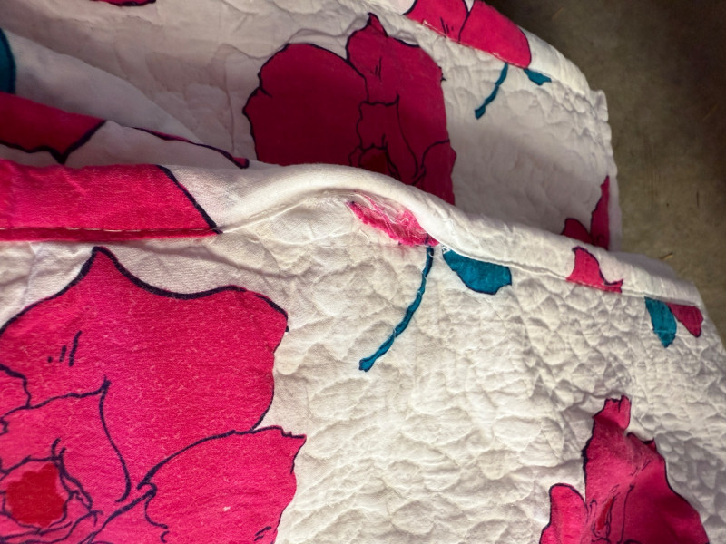 70x82” . Some areas of binding have come away. See pics. Quilt is in good condition otherwise. Bright pink and teal.
