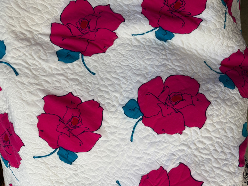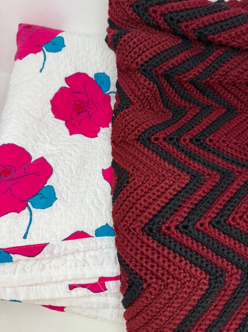 Lot # 207 - Vibrant Rose on White Background Quilt & Crocheted Blanket