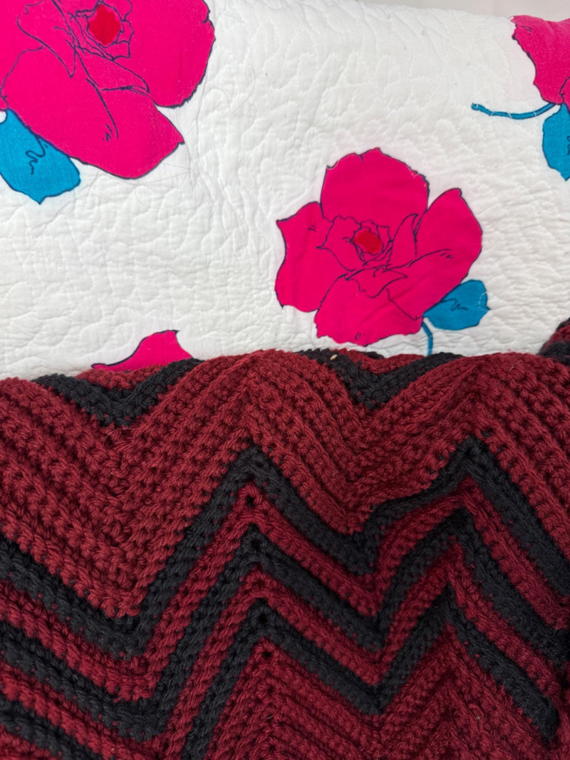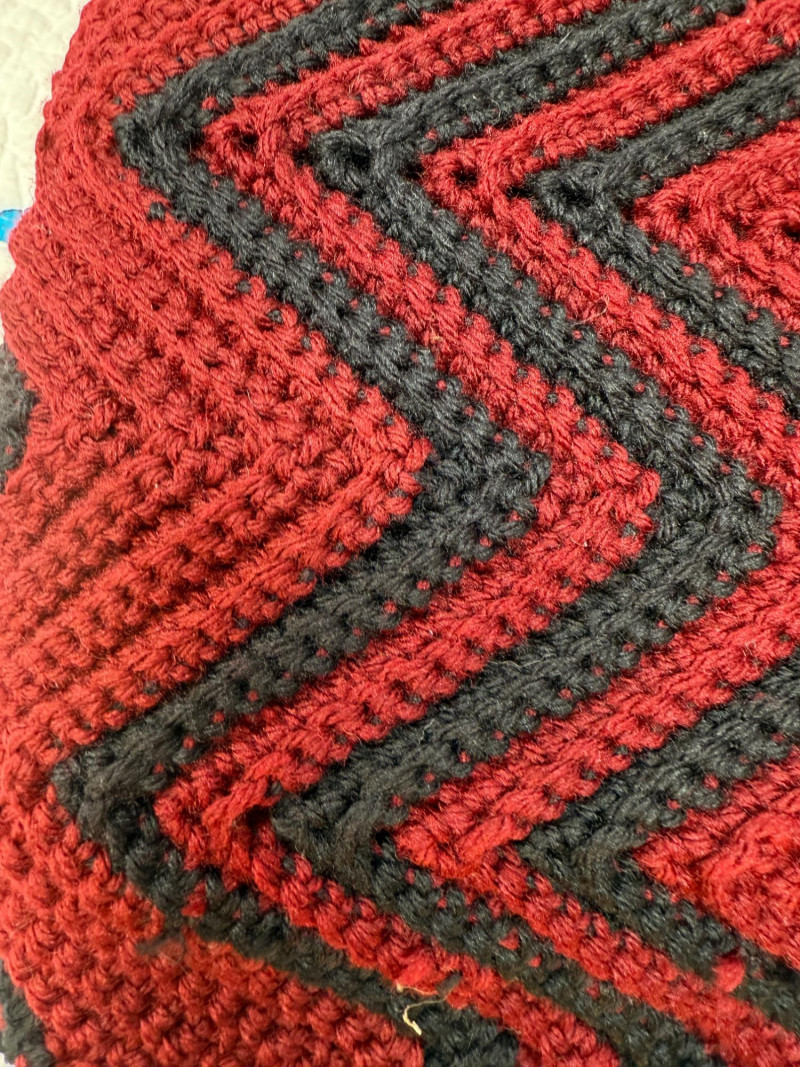 52x74” crocheted blanket deep red and black.
