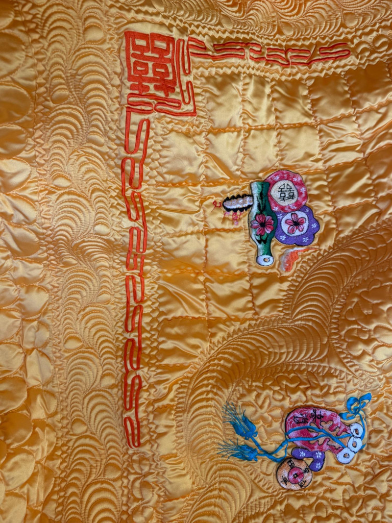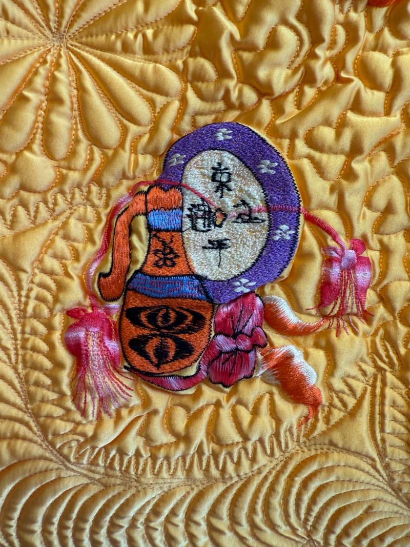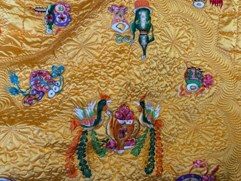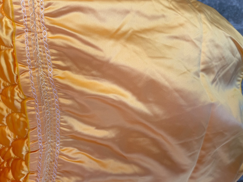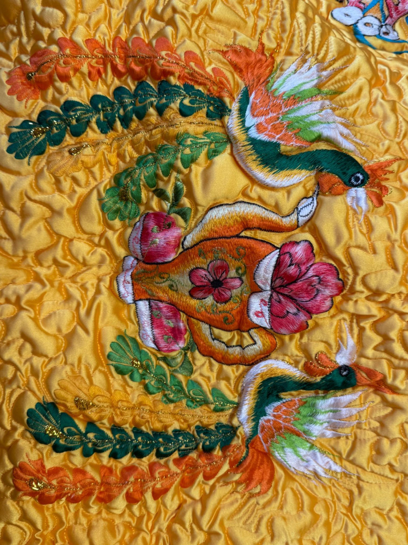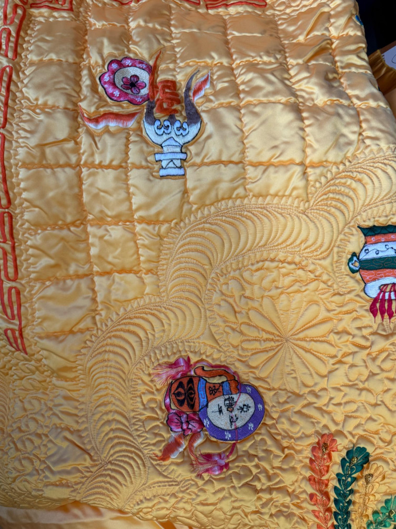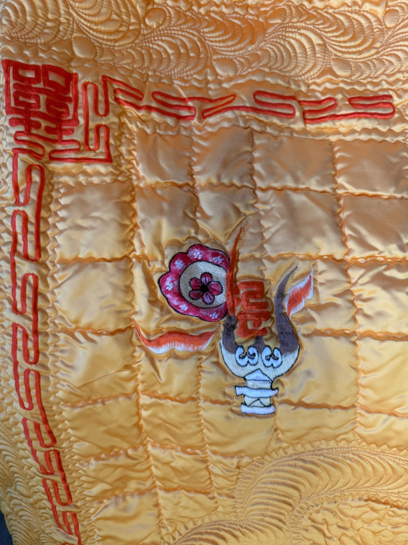 Exquisite Yellow Satin Quilt With Embroidered Images