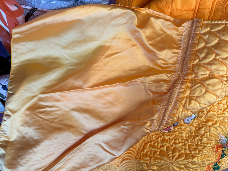 Lot # 208 - Exquisite Yellow Satin Quilt With Embroidered Images