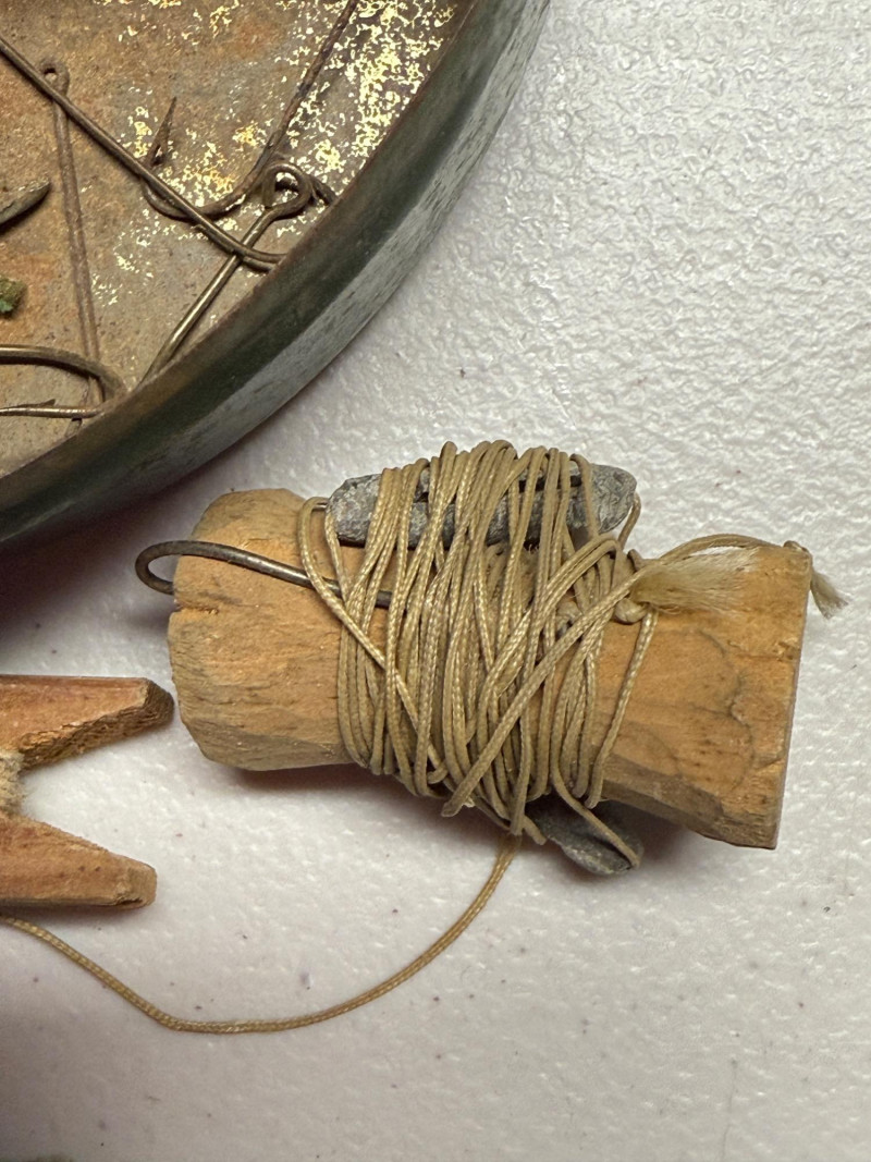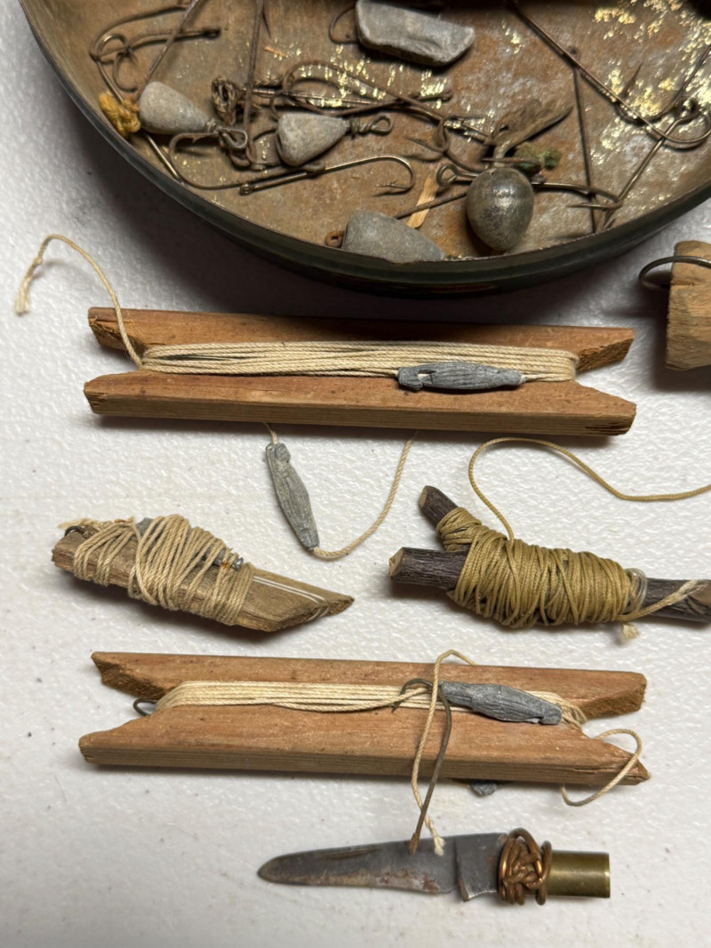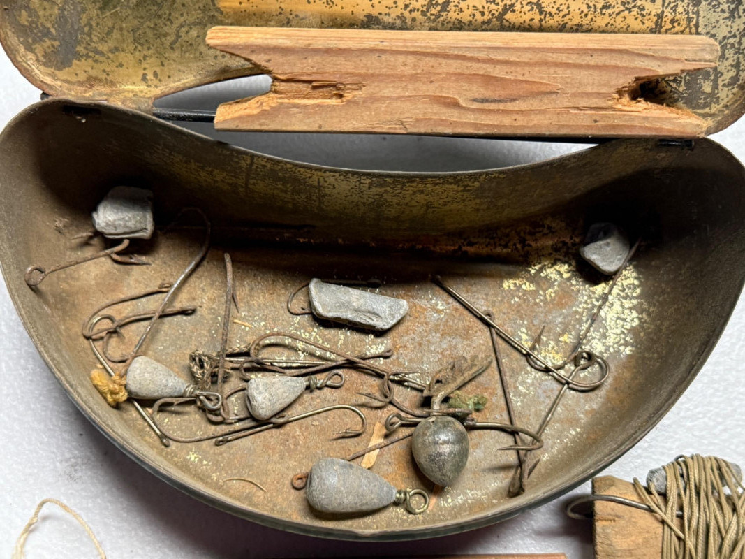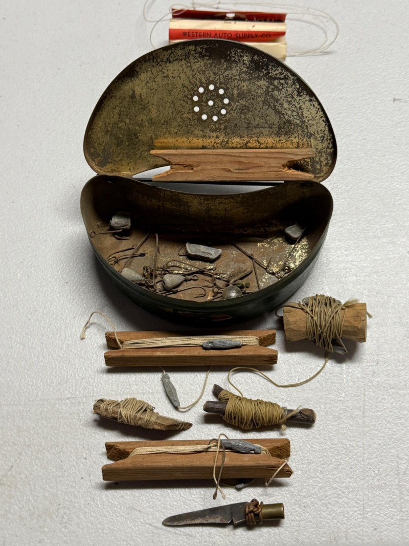 Vintage Horrocks Ibbotson Worm Bait Box of 5 Finger Fishing Lines, hooks, weights & custom string cutting knife. 6x3.25” Mini string knife is 2.5” long.
