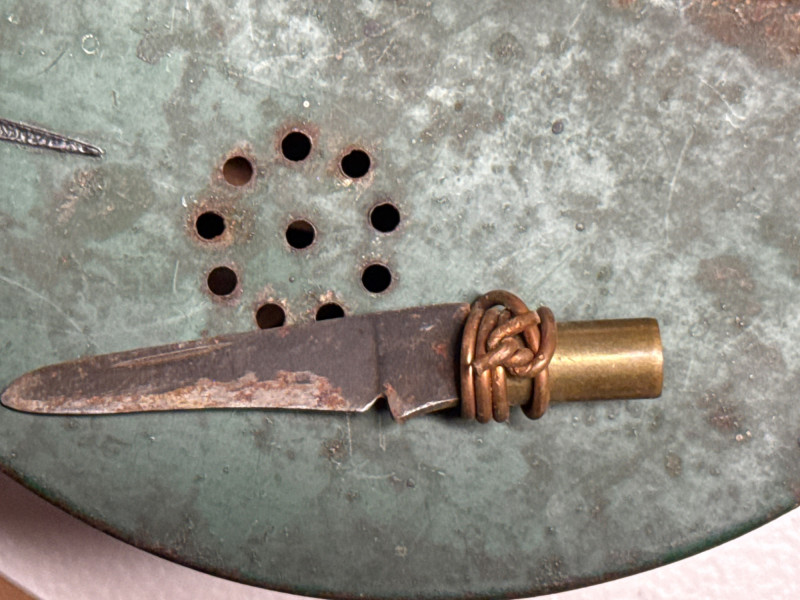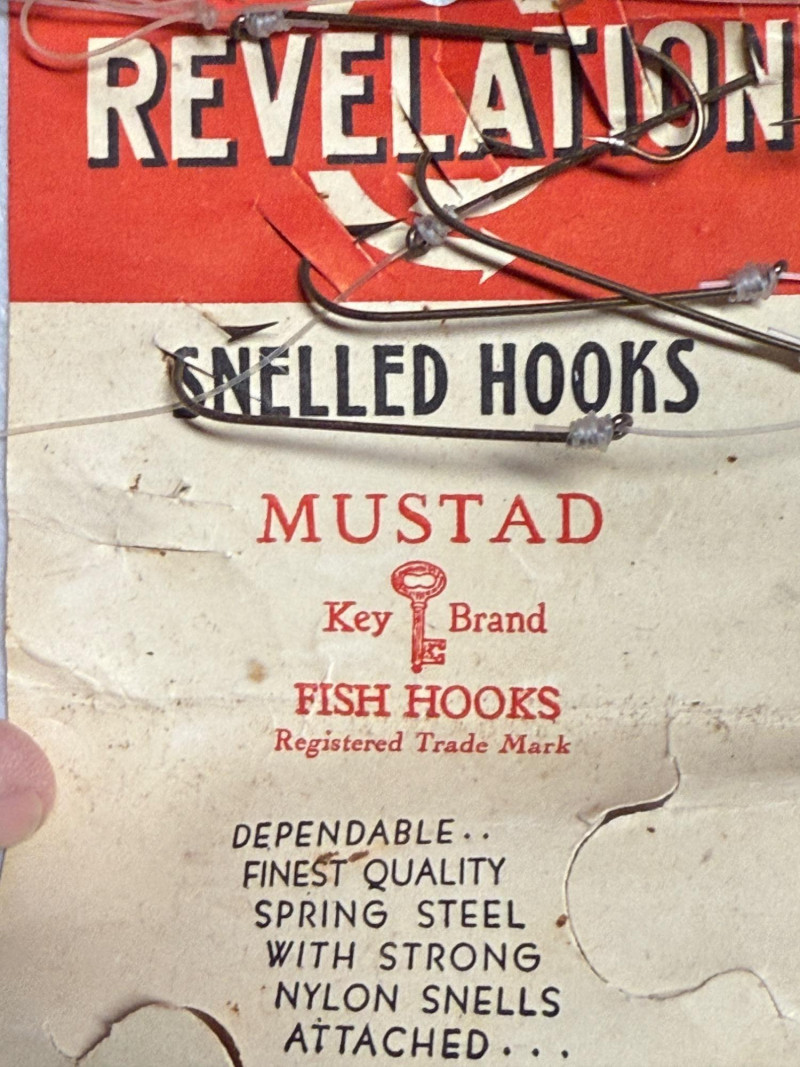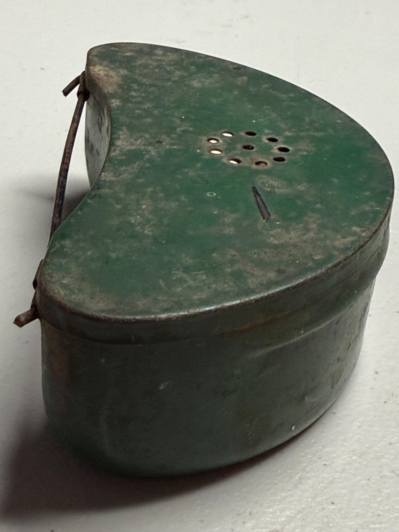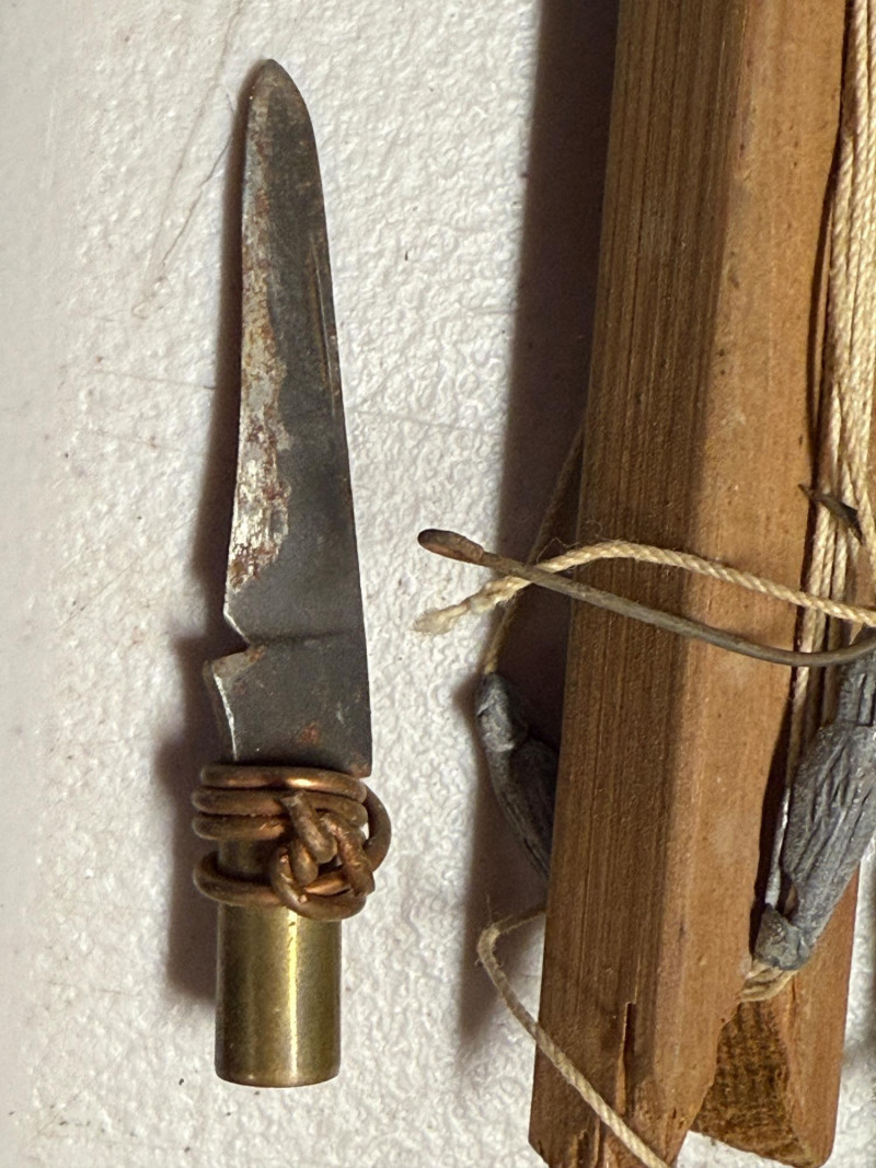 Vintage Horrocks Ibbotson Worm Bait Box of 5 Finger Fishing Lines, hooks, weights & custom string cutting knife. 6x3.25” Mini string knife is 2.5” long.