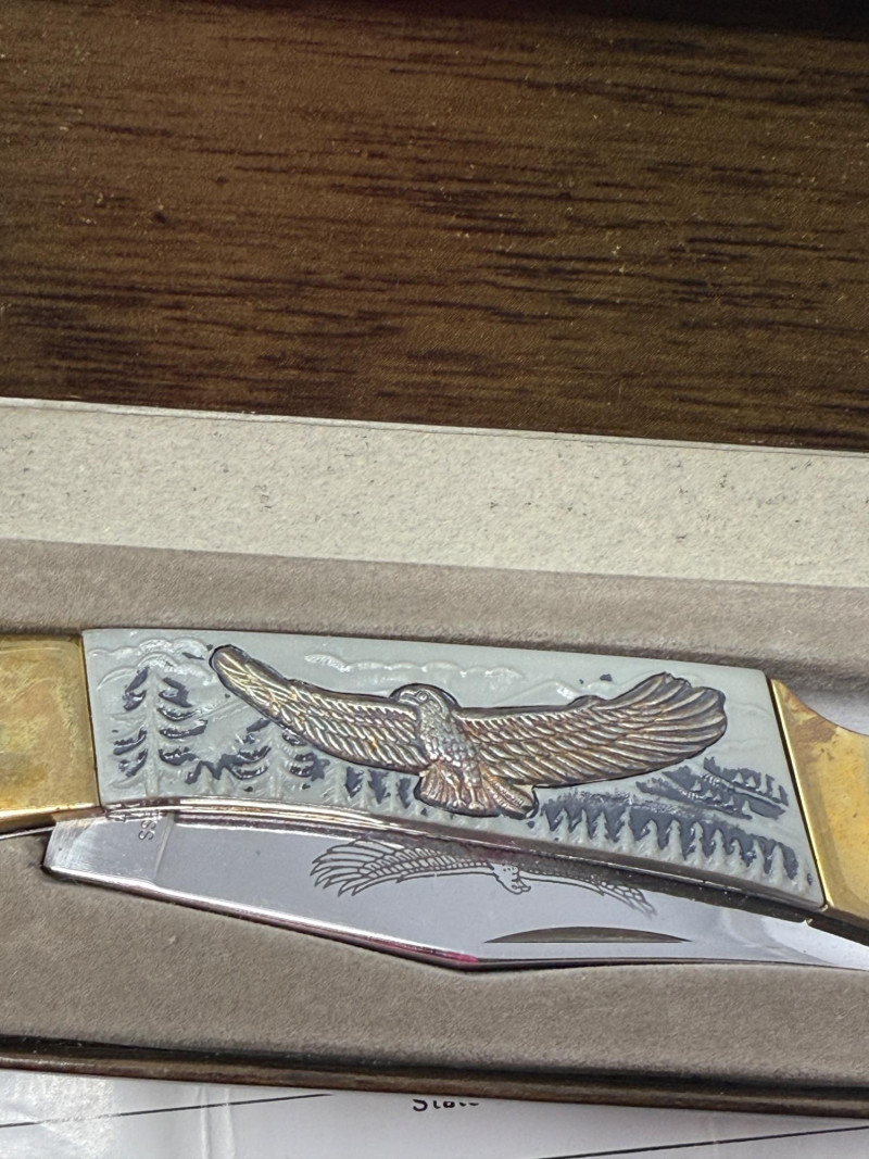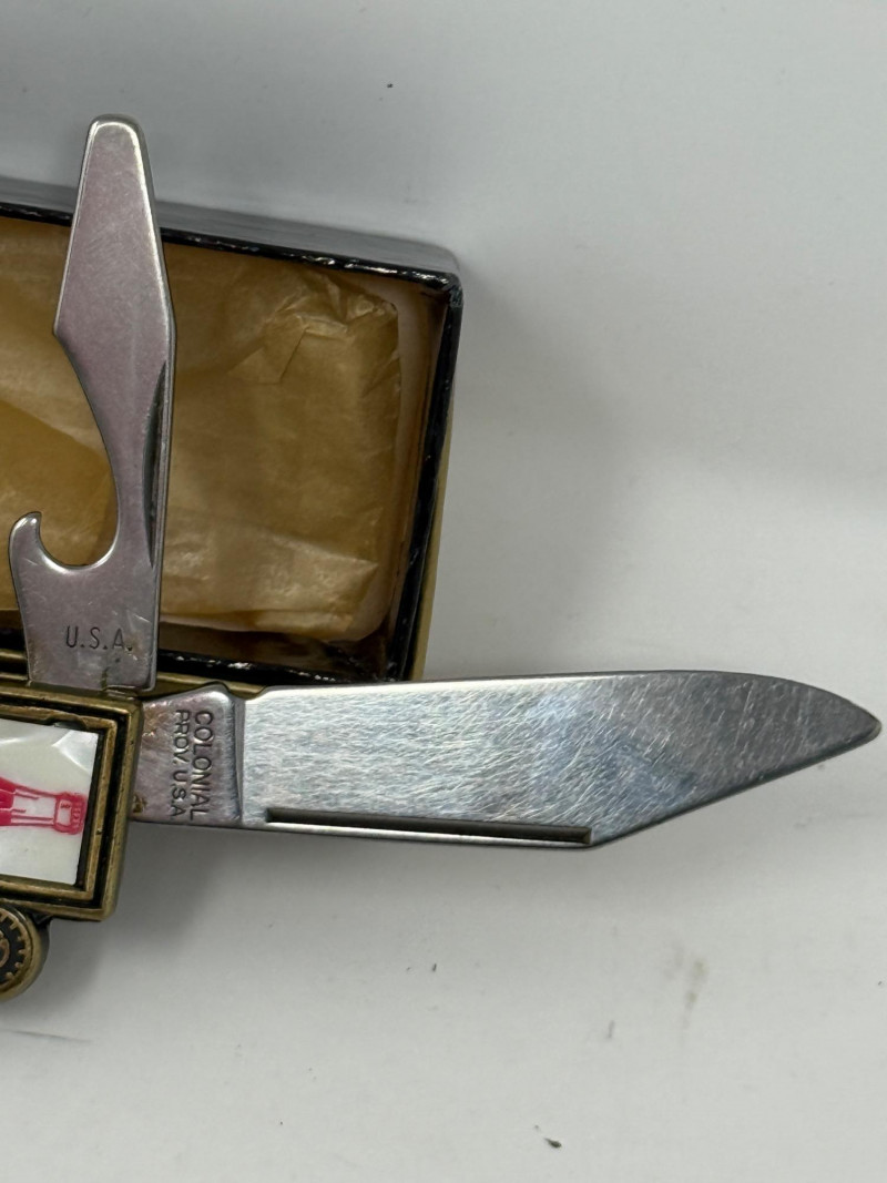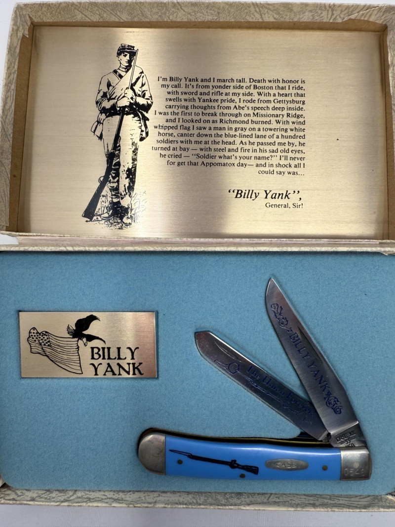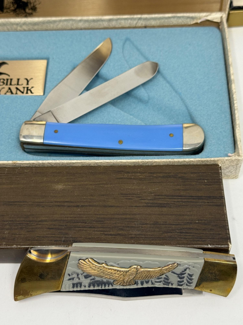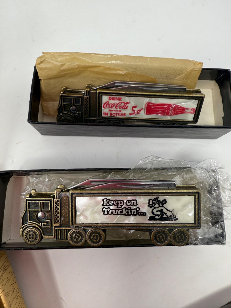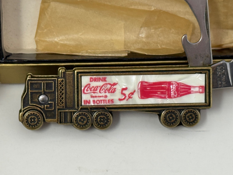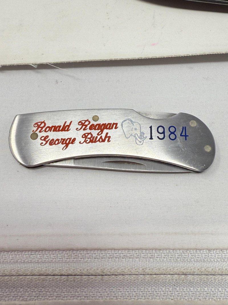 Pocket Knives - Case Billy Yank & Reagan/Bush - Trucker & 4 More Case XX SS USA Billy Yank Commemorative knife in original box. American International Mint Soaring Eagle handle with engraved blade image. Brass and Stainless with gray carved handle. 7.5” Reagan/Bush Elephant 1984 Case XX SS USA MODEL #M1054LSSP 4.25” Semi-truck Advertising Coca~Cola stamped Colonial Provisions 5.5” Mother of Pearl encased knife. Wood and brass made in China 5.5” Buck wood, brass and stainless, wood is only on one side.