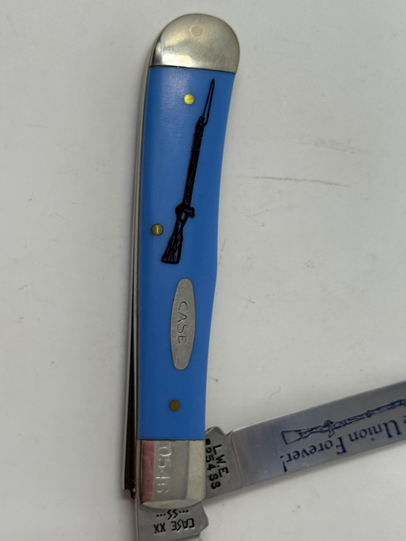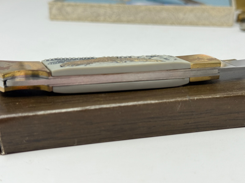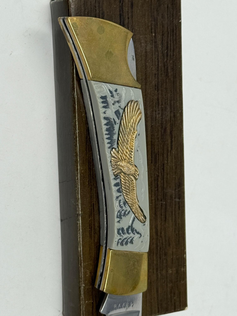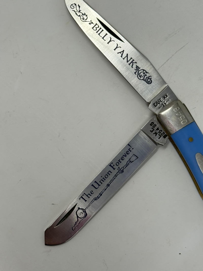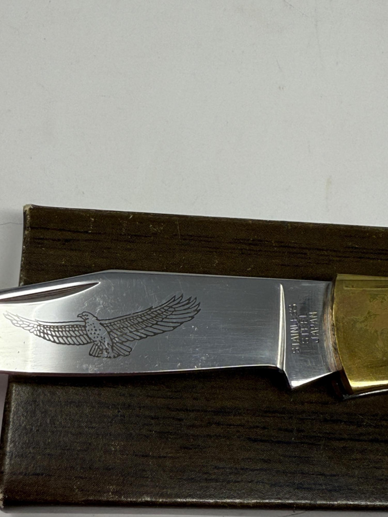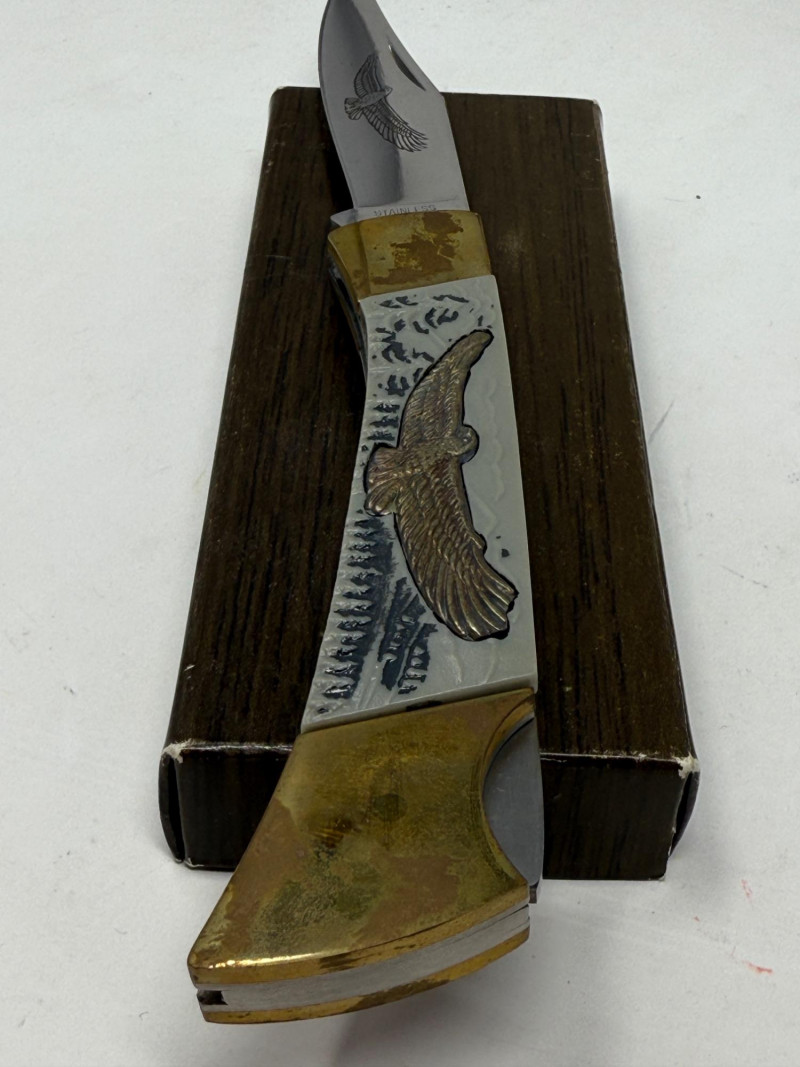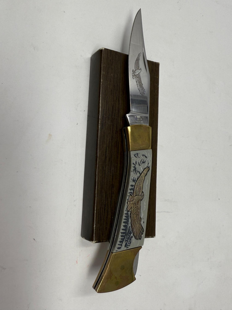 Pocket Knives - Case Billy Yank & Reagan/Bush - Trucker & 4 More Case XX SS USA Billy Yank Commemorative knife in original box. American International Mint Soaring Eagle handle with engraved blade image. Brass and Stainless with gray carved handle. 7.5” Reagan/Bush Elephant 1984 Case XX SS USA MODEL #M1054LSSP 4.25” Semi-truck Advertising Coca~Cola stamped Colonial Provisions 5.5” Mother of Pearl encased knife. Wood and brass made in China 5.5” Buck wood, brass and stainless, wood is only on one side.