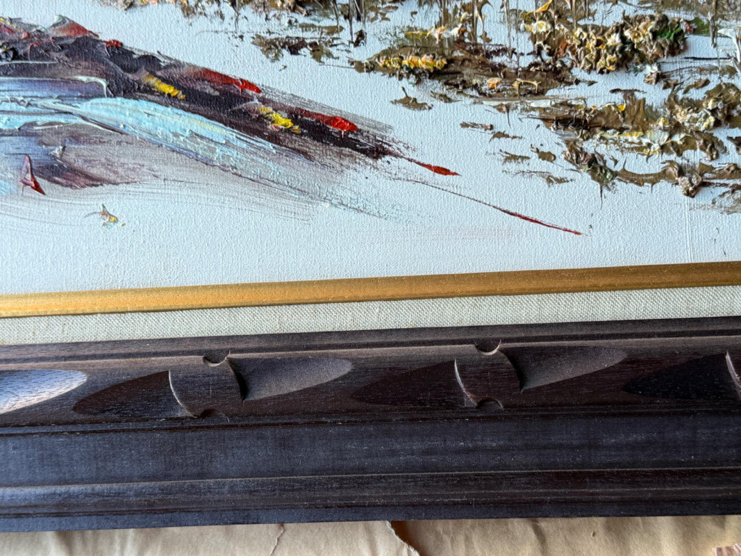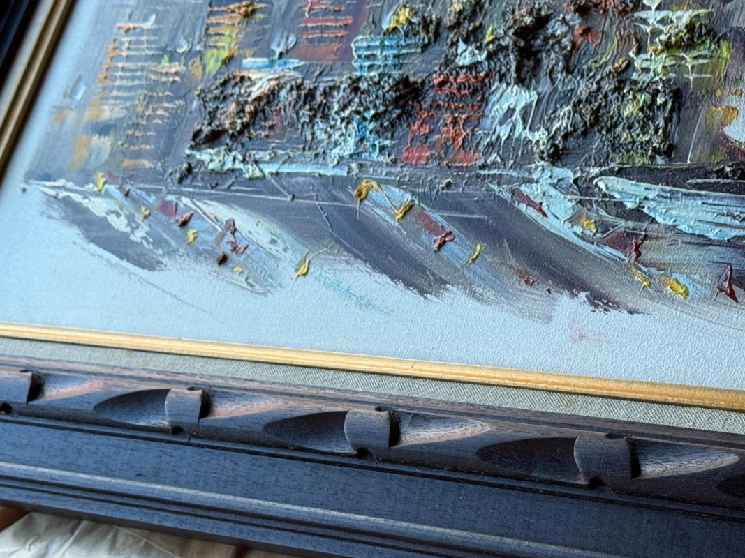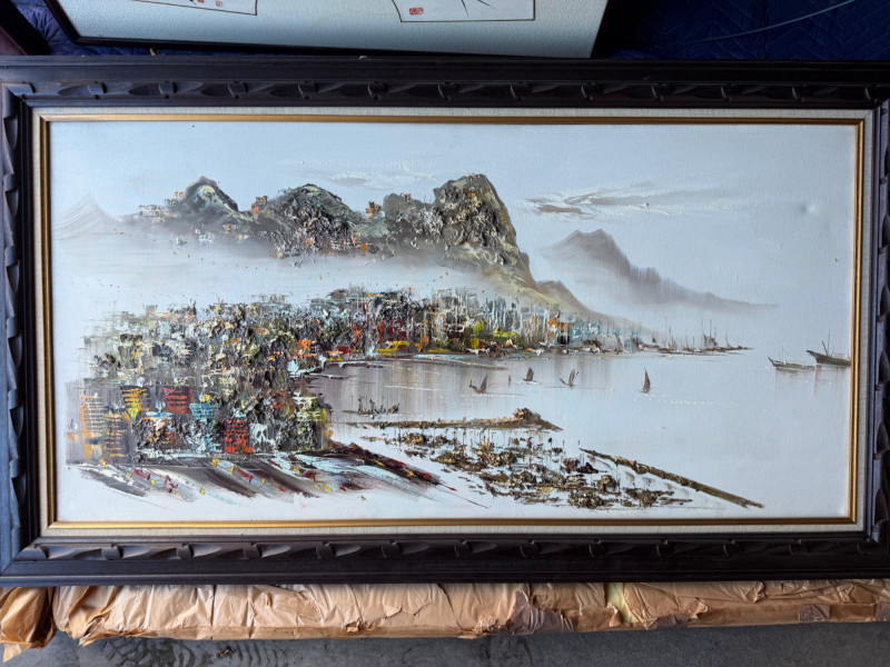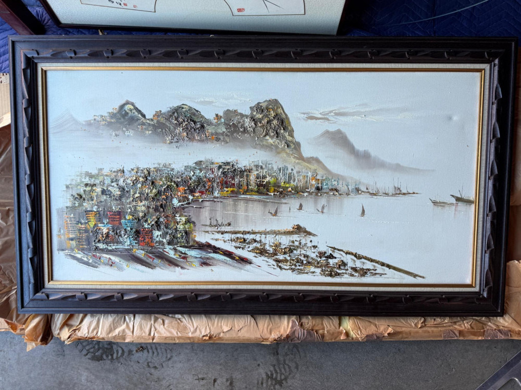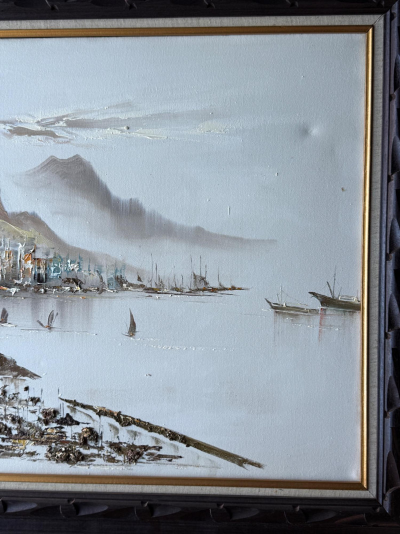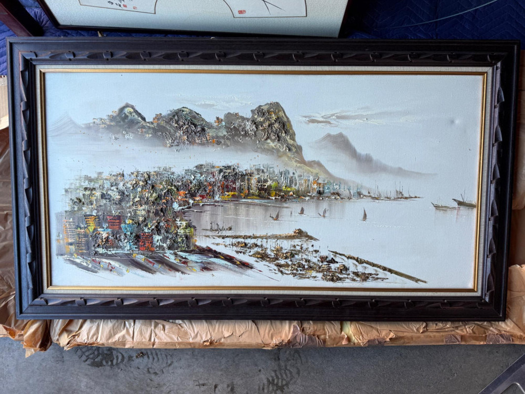 Chinese Impressionist Original Oil On Canvas Painting 55.5x30.5” Junk boats in the harbor. Beautiful 3” dark wood hand carved frame. Unsigned.