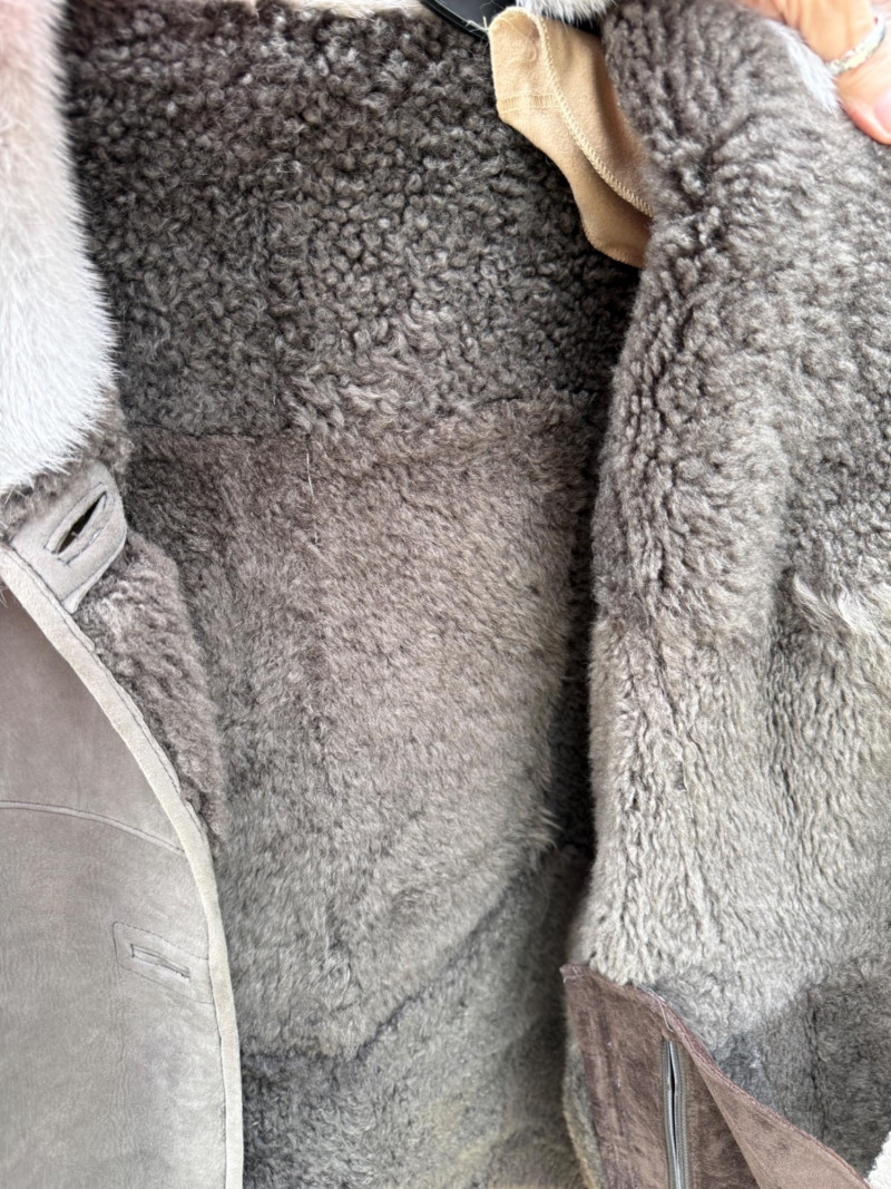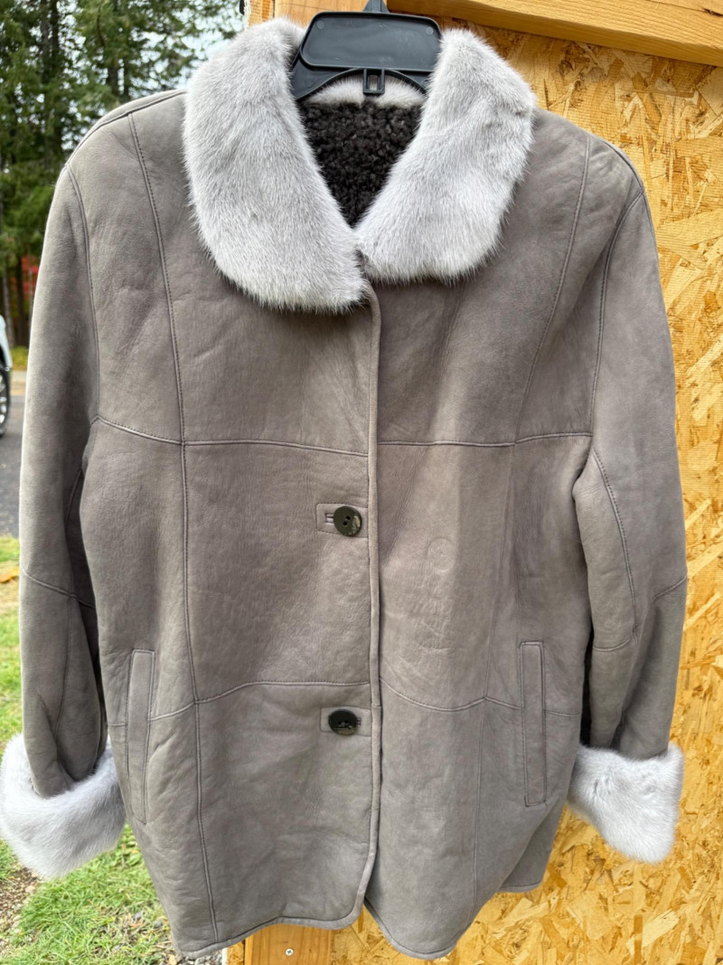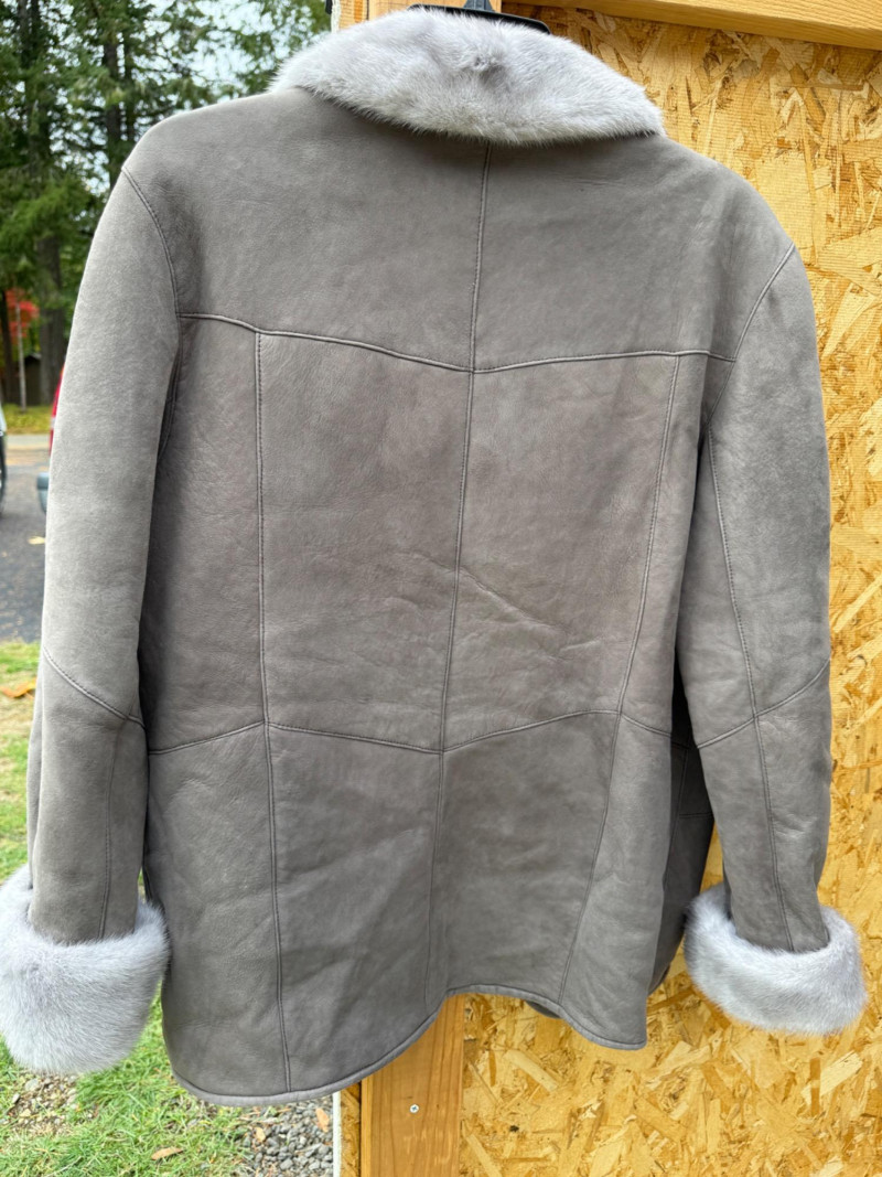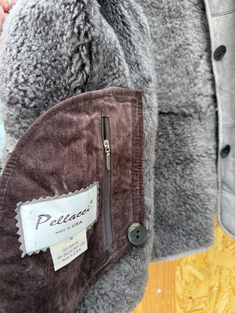 Pellacci New Zealand Leather Jacket w Fur Collar and Cuffs Medium wool sherpa interior with butter soft gray leather and fur lined collar and cuffs. 3 button.