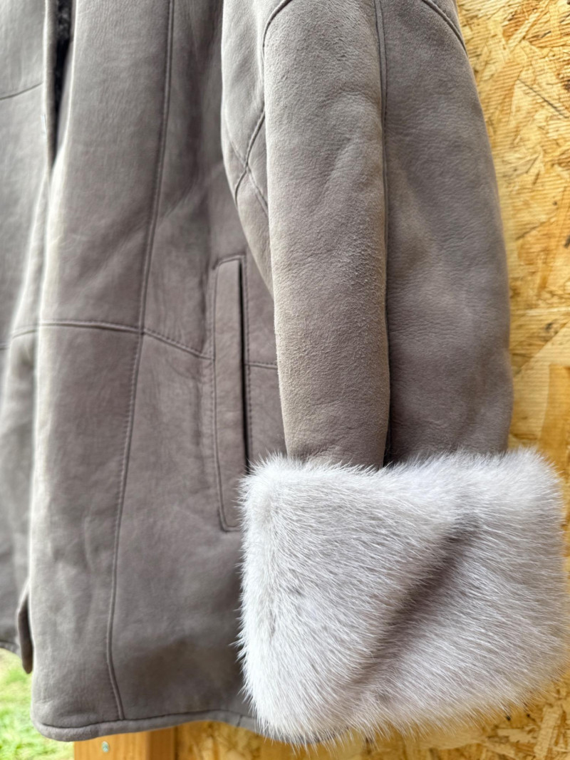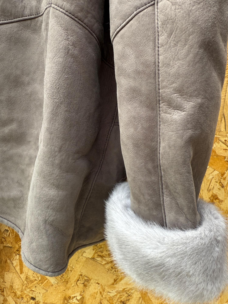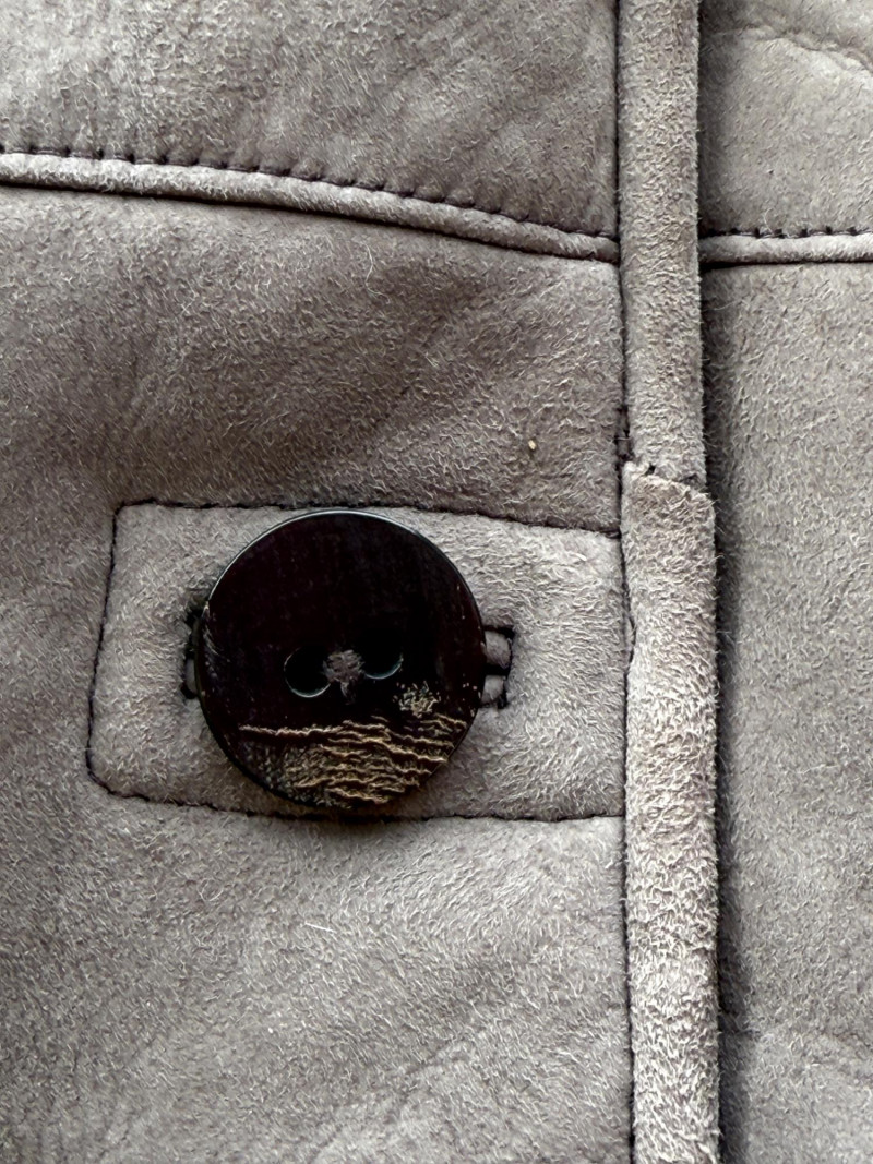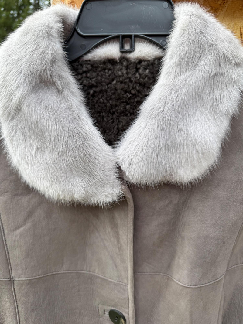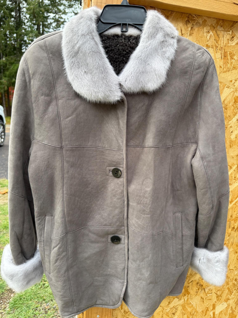 Pellacci New Zealand Leather Jacket w Fur Collar and Cuffs Medium wool sherpa interior with butter soft gray leather and fur lined collar and cuffs. 3 button.