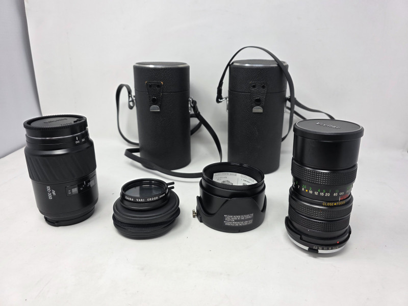 Minolta Maxxum AF 100-300mm & Vivitar 70-150mm Camera Lenses Minolta Maxxum AF 100-300mm Compact, autofocus telephoto zoom lens released in the late 1980s for Minolta's line of Maxxum/Dynax/Alpha SLR cameras Vivitar 70-150mm f/3.8 Macro Close Focusing Auto Zoom Lens This particular lens, a 70-150mm f/3.8 macro zoom, was a common focal length range for portraiture and general telephoto use during the film era. The "Close Focusing" designation indicates its ability to achieve relatively short minimum focusing distances, allowing for macro-like capabilities Also included: Kenko Vari Cross 49mm Camera Lens Filter Aftermarket lens hood Carrying cases for all 3 lenses Ducks Unlimited Carry Bag