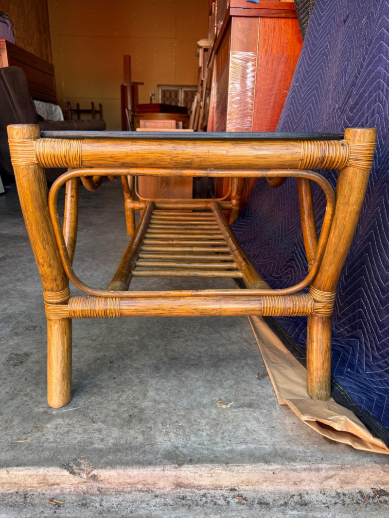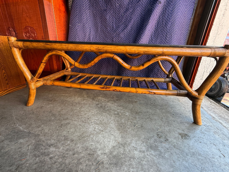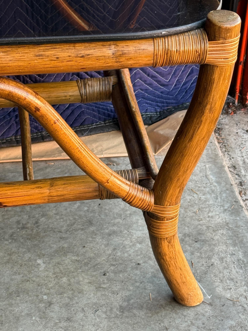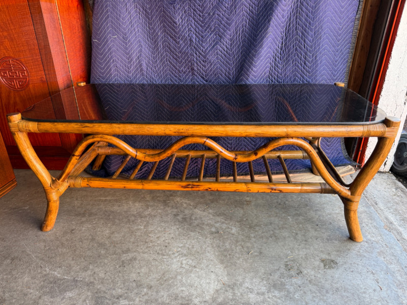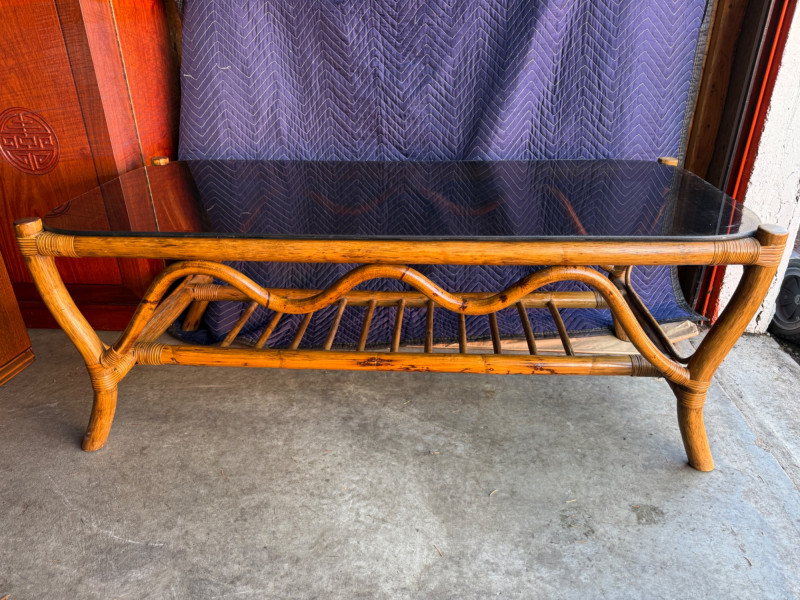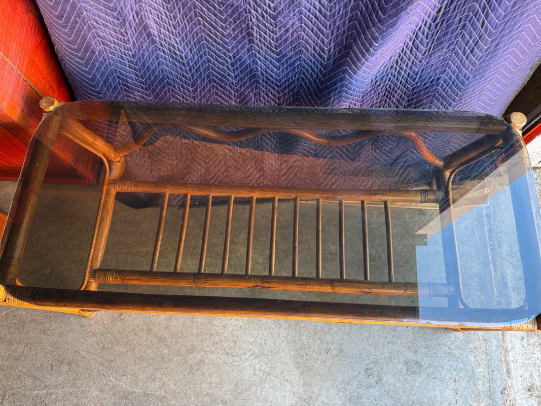 MCM Bamboo Coffee Table With Smoke Glass Top 52x22x20” Light scratched on the glass.