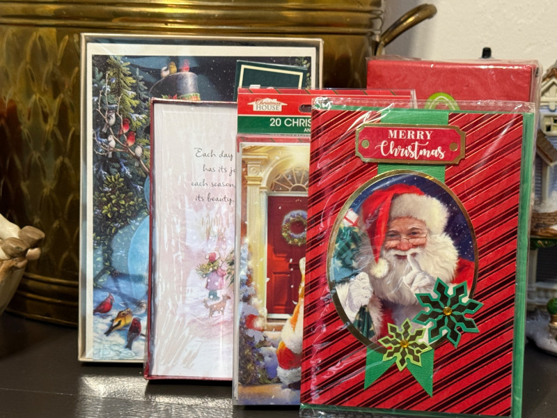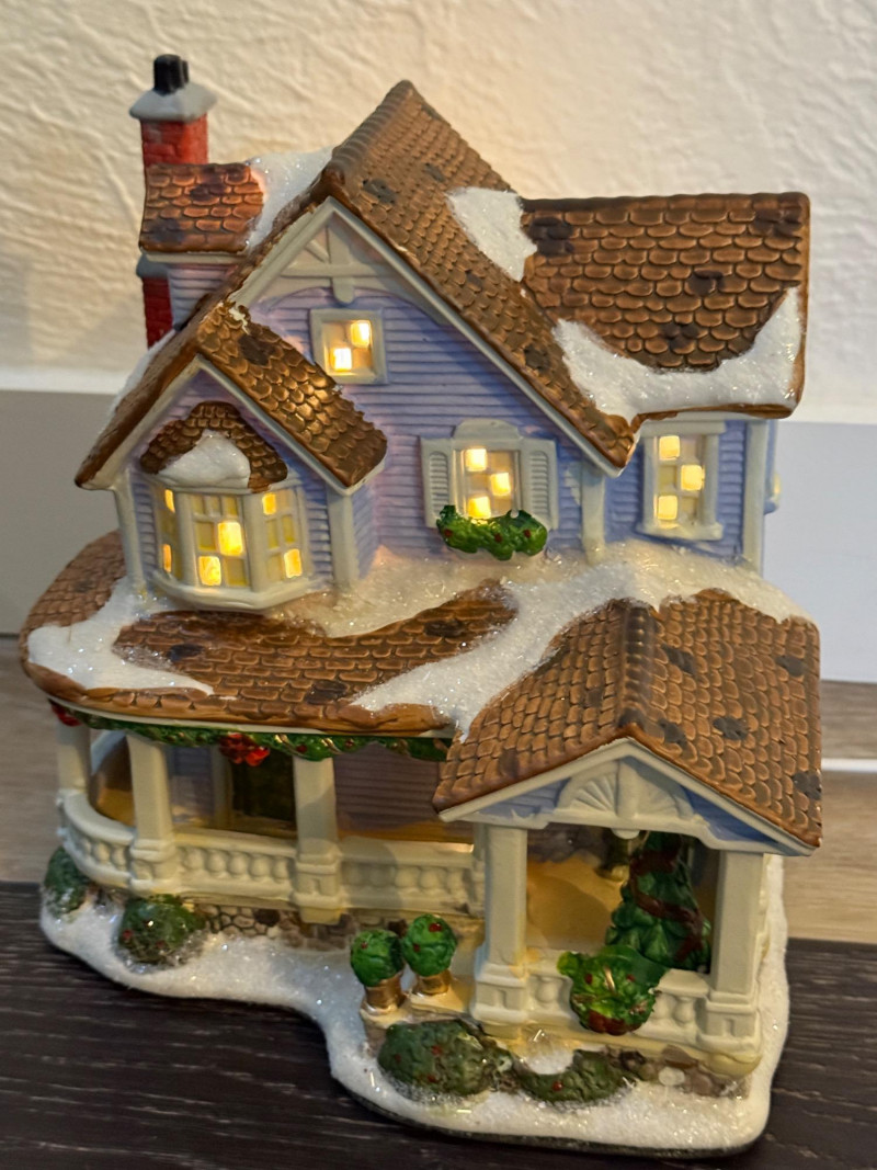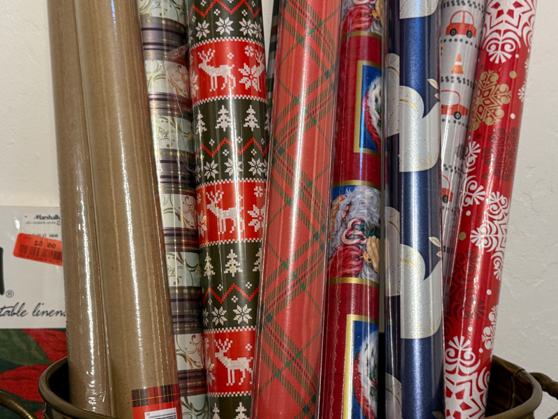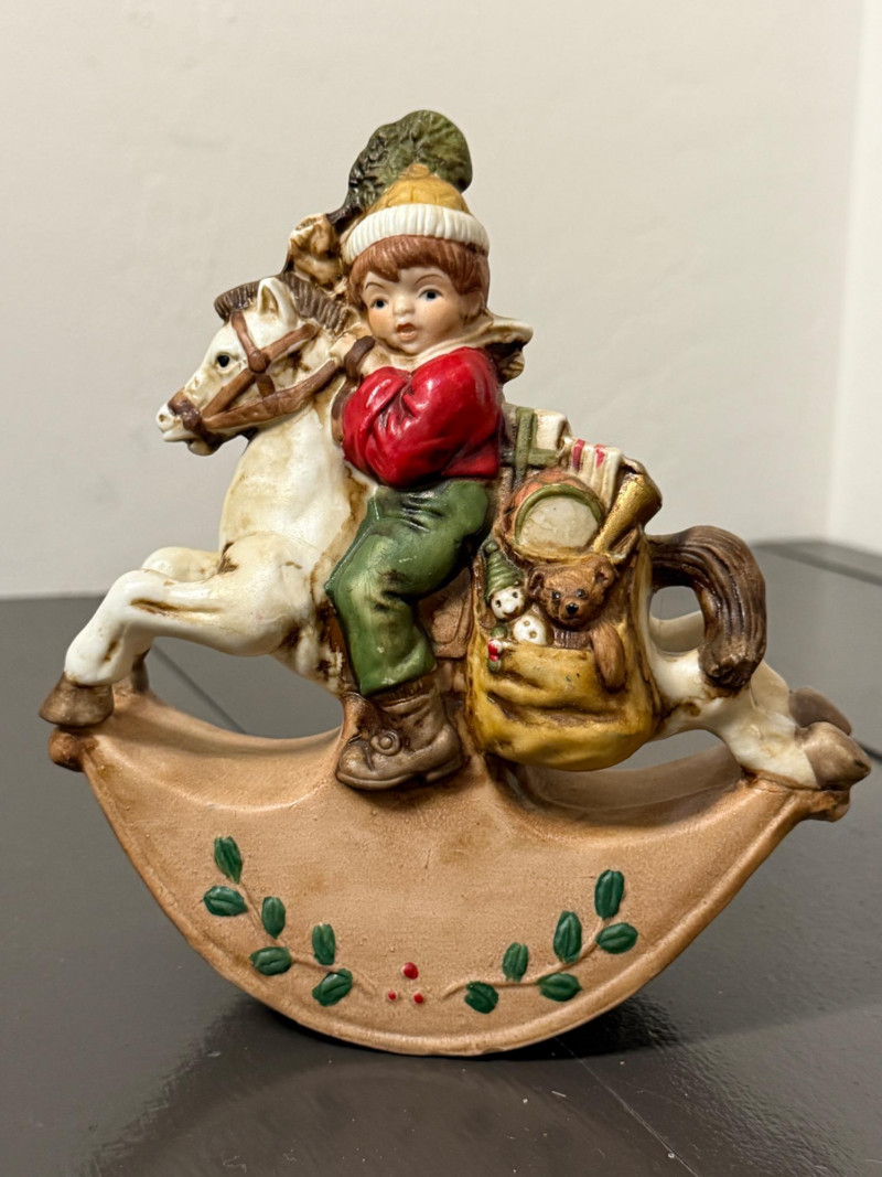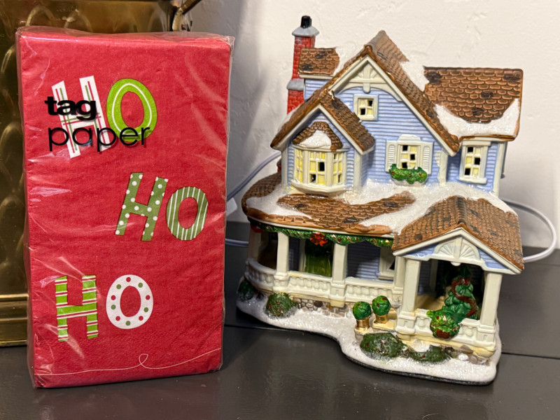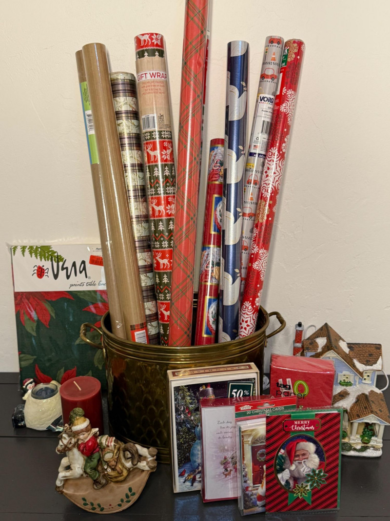 Brass Bucket of Gift Wrap - Music Box - Cards - Lighted House Brass Bucket 13x8x10” Gift Wrap 8 rolls of printed and 2 rolls of kraft paper Rocking Horse Music Box, works 3-4 boxes of cards Lighted House -JoAnn Stores 2010 tested, works Snowman Candle and pillar Vera Paints Table Linen 60x102”