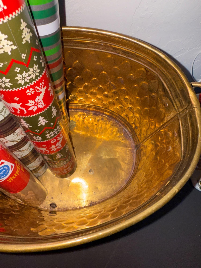 Lot # 265 - Brass Bucket of Gift Wrap - Music Box - Cards - Lighted House +